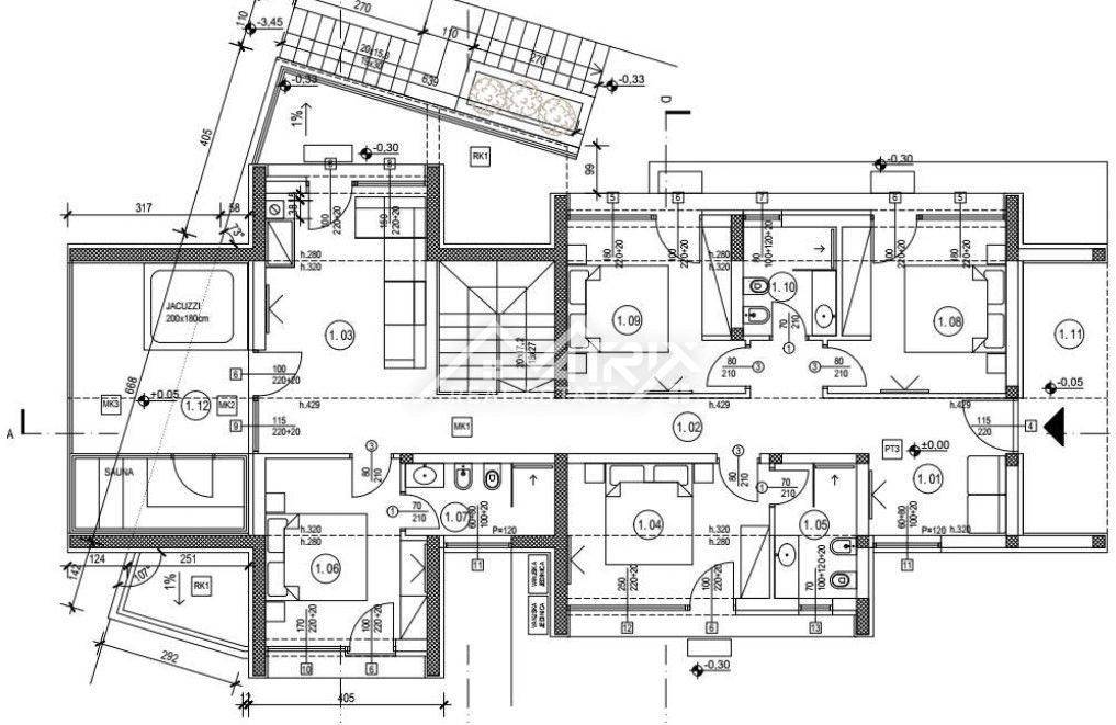 Atraktivnim unutarnjim stepenicama ide se na prvi kat kuće, gdje se nalaze četiri spavaće sobe, tri kupaonice i dodatni dnevni boravak iz kojeg se izlazi u relax zonu sa jacuzzijem i saunom, smještenu na južnoj terasi s koje se pruža prekrasan pogled na more.