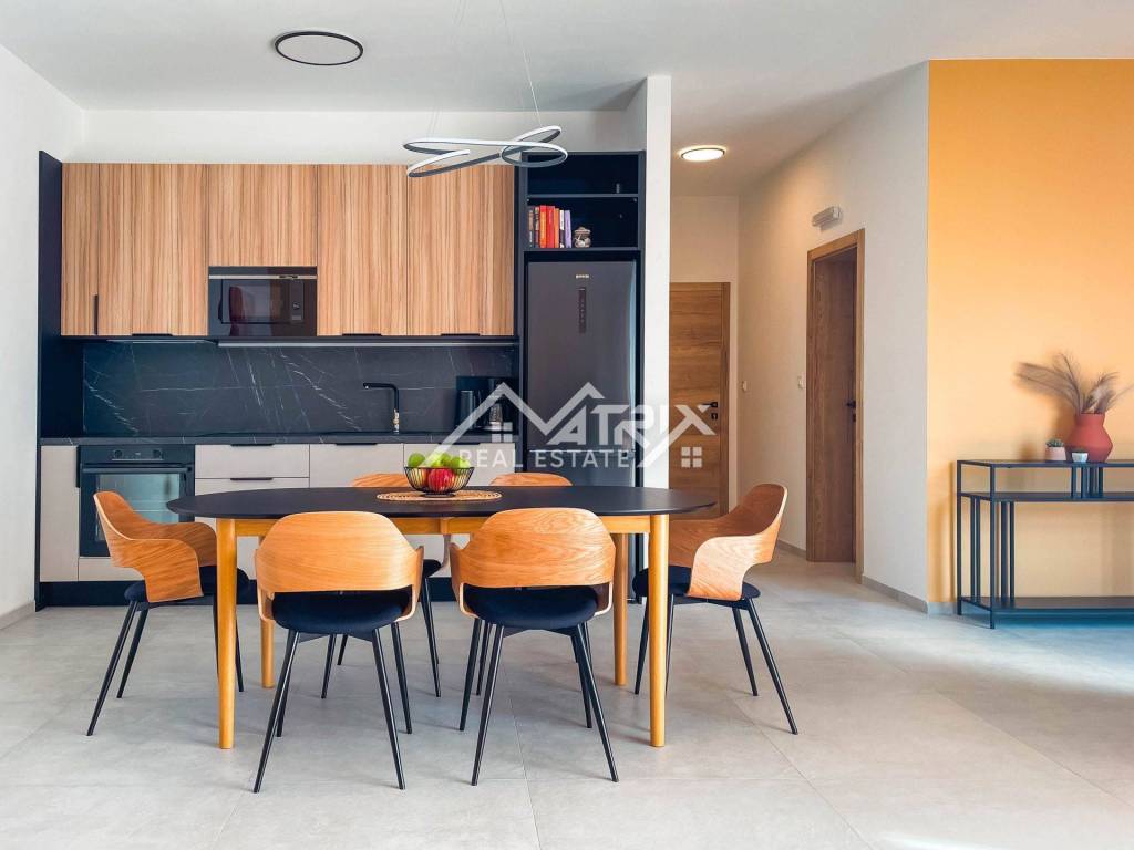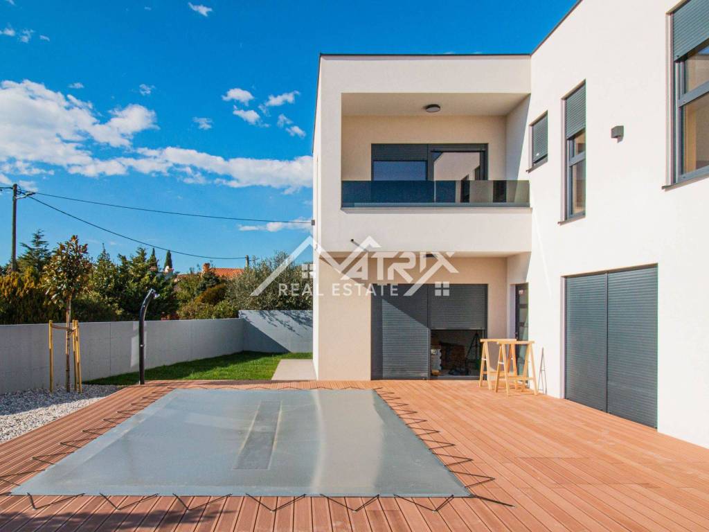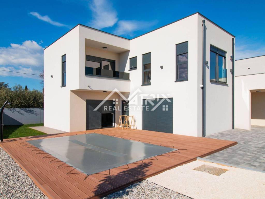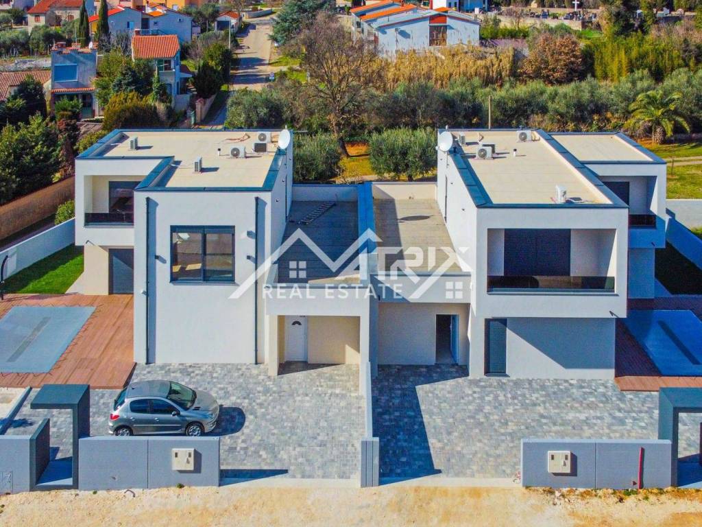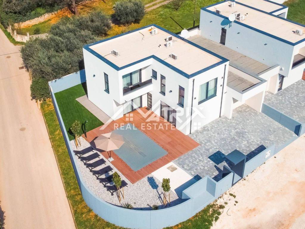 U mirnom naselju u blizini Medulina, na samo 200 metara mora marine za vezivanje brodova, nalazi se ova moderna dvojna vila s bazenom. Kuća se prostire na dvije etaže: prizemlje i prvi kat, ukupne stambene površine 188 m2, s tri spavaće sobe. Kuća se prodaje potpuno namještena i opremljena luksuznim namještajem i kvalitetnom opremom.
