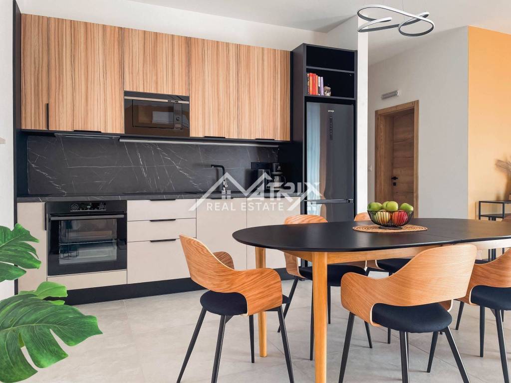 Prizemlje ove vile se sastoji od ulaznog predsoblja s garderobom, otvorenog prostora koji ujedinjuje dnevni boravak i kuhinju s blagovaonicom s izlazom na terasu bazena kroz velike staklene stijene koje omogućuju obilje prirodnog svjetla. U prizemlji se još nalazi wc-a za goste, prostrana spavaća soba s vlastitom kupaonicom, te game-room soba, zamišljena kao prostor za zabavu ali se može prenamijeniti u ured ili dodatnu spavaću sobu. Također, u sklopu prizemlja nalazi se i garaža za jedan automobil. Rasporede prostorija je otvorenog tipa kako bi sve prostorije bile nadohvat ruke. Atraktivne unutarnje stepenice vode nas na kat gdje se nalaze dvije spavaće sobe, Svaka s vlastitom kupaonicom i terasom s koje se pruža prekrasan pogled na more.