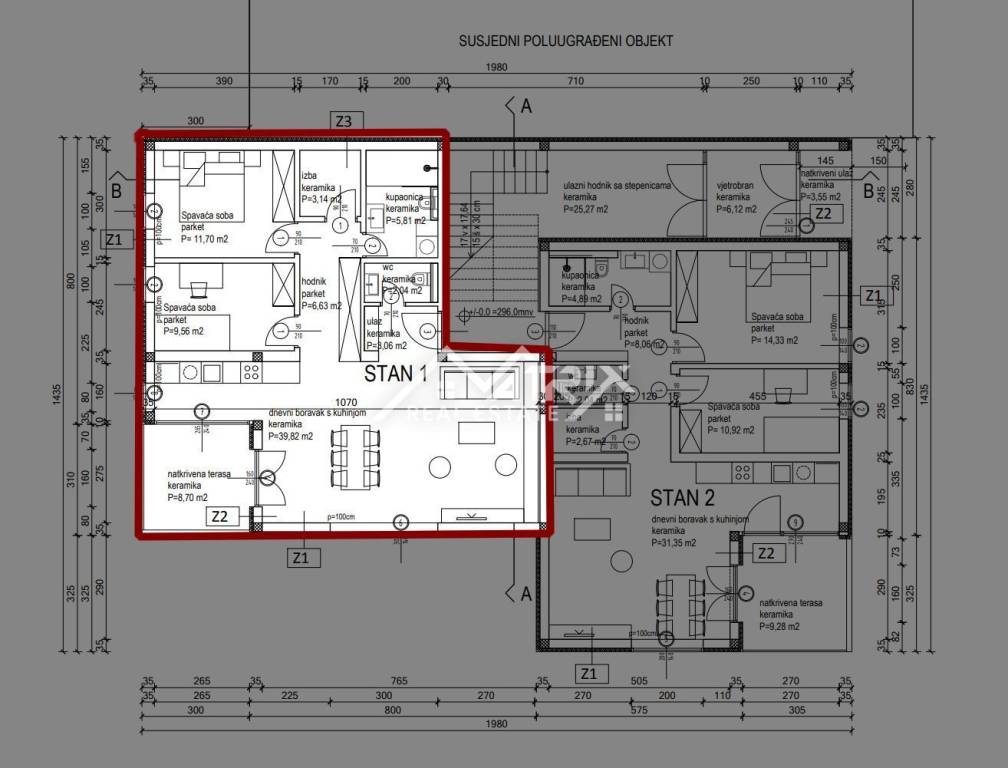 Stan S1L, smješten u prizemlju, nudi savršenu kombinaciju modernog stila i udobnosti. Idealno za obitelji i sve koji žele uživati u mirnom okruženju, ovaj stan prostire se na 90,46 m² i sastoji se od dvije spavaće sobe, kuhinje s blagovaonicom, prostranog dnevnog boravka, elegantne kupaonice te terase od 8,70 m². Svaki stan u ovoj novogradnji dizajniran je s posebnim naglaskom na privatnost i optimalnu iskoristivost prostora. Osim toga, svaki stan ima osigurano vlastito parkirno mjesto te spremište unutar stana, idealno za odlaganje osobnih stvari.