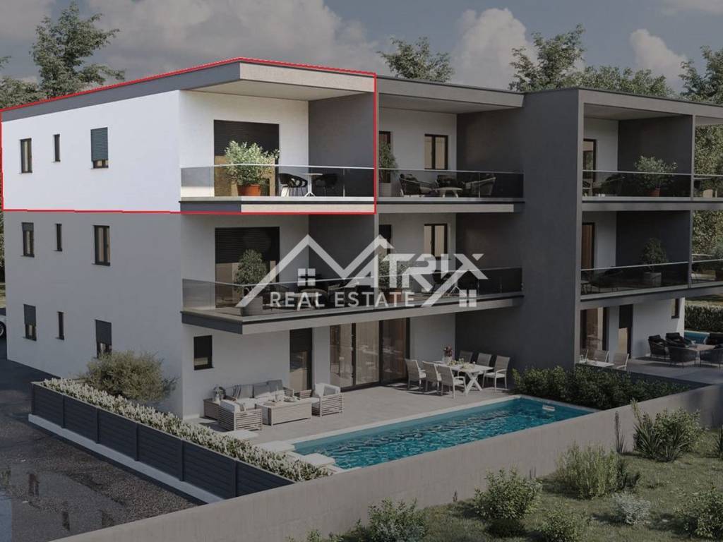 Stan se nalazi na drugom katu moderne novogradnje, a sastoji se od ulaznog hodnika, velikog otvorenog prostora koji objedinjuje kuhinju, blagovaonicu i dnevni boravak s izlazom na natkrivenu terasu kroz velike staklene stijene koje omogućuju obilje dnevnog prirodnog svjetla kroz cijeli dan. Stan još ima i dvije spavaće, jednu kupaonicu, te WC za goste.