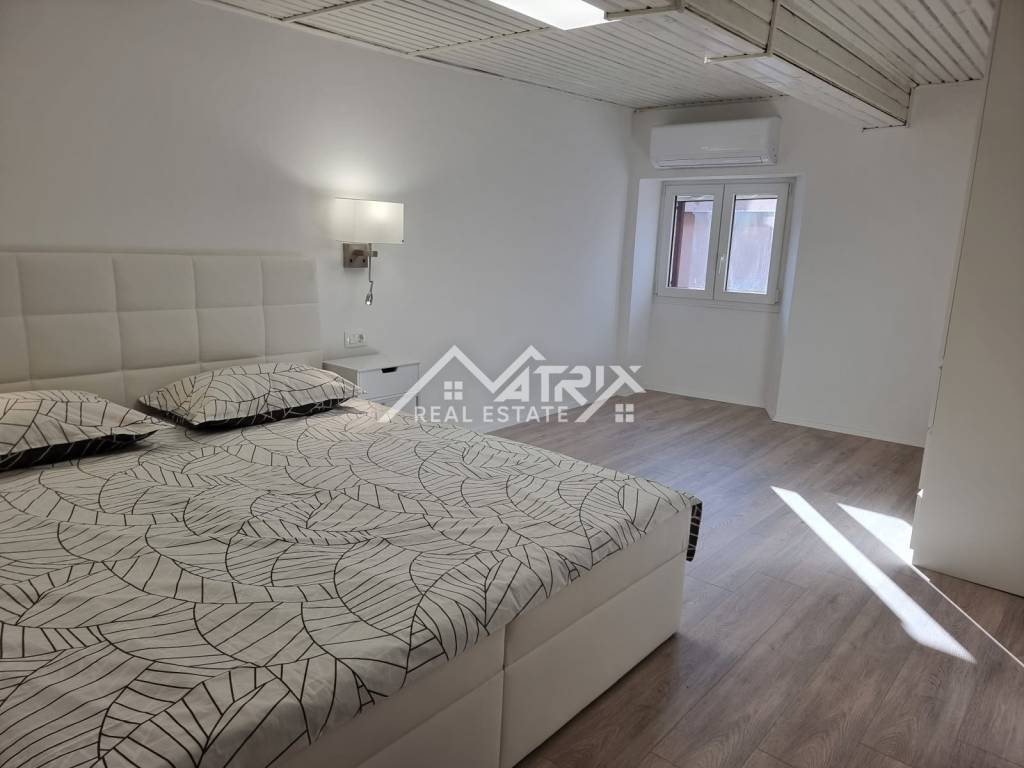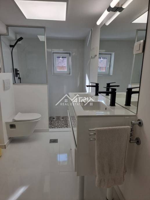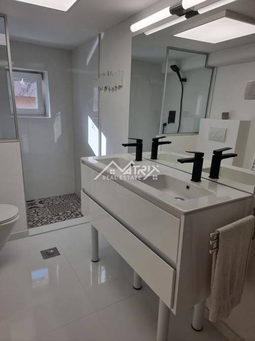 Prostor i raspored: Stan se sastoji od prostranog ulaznog hodnika s elegantnim, po mjeri izrađenim ormarima, otvorenog dnevnog boravka s kuhinjom i blagovaonom, prostrane glavne spavaće sobe, dodatne spavaće sobe i potpuno preuređene kupaonice.