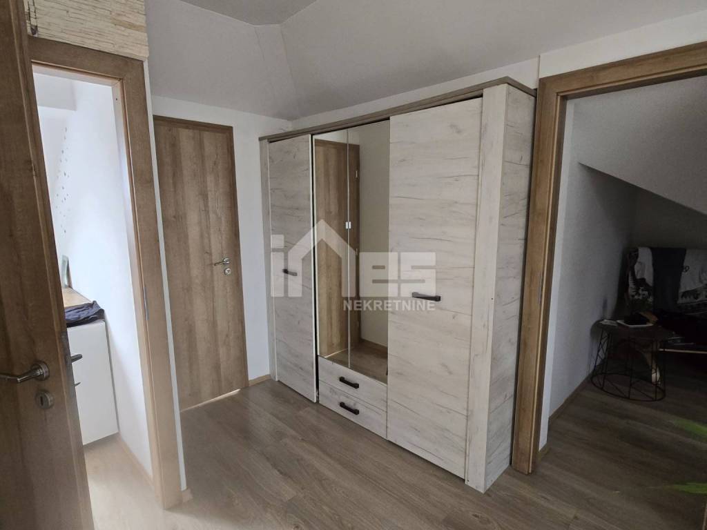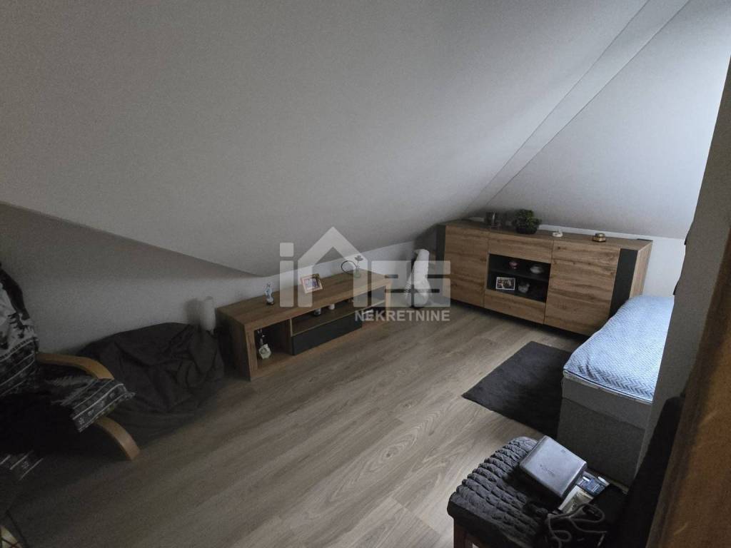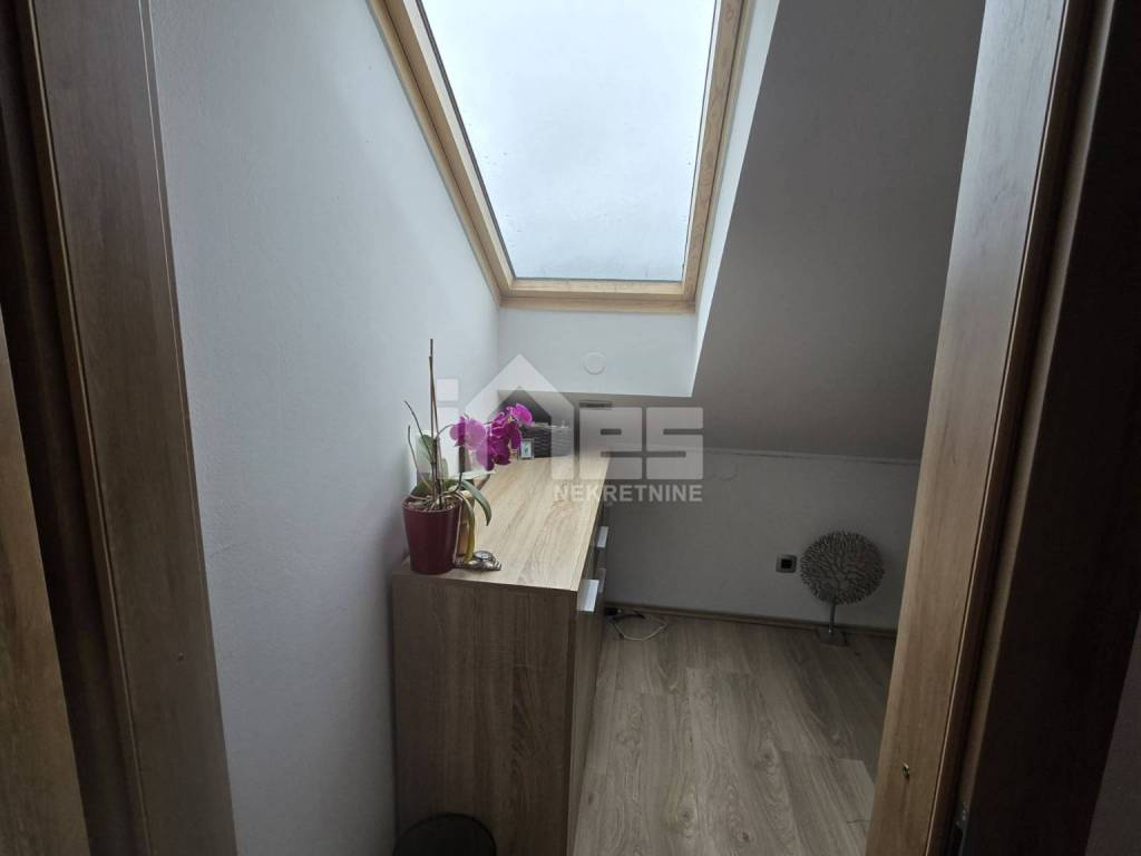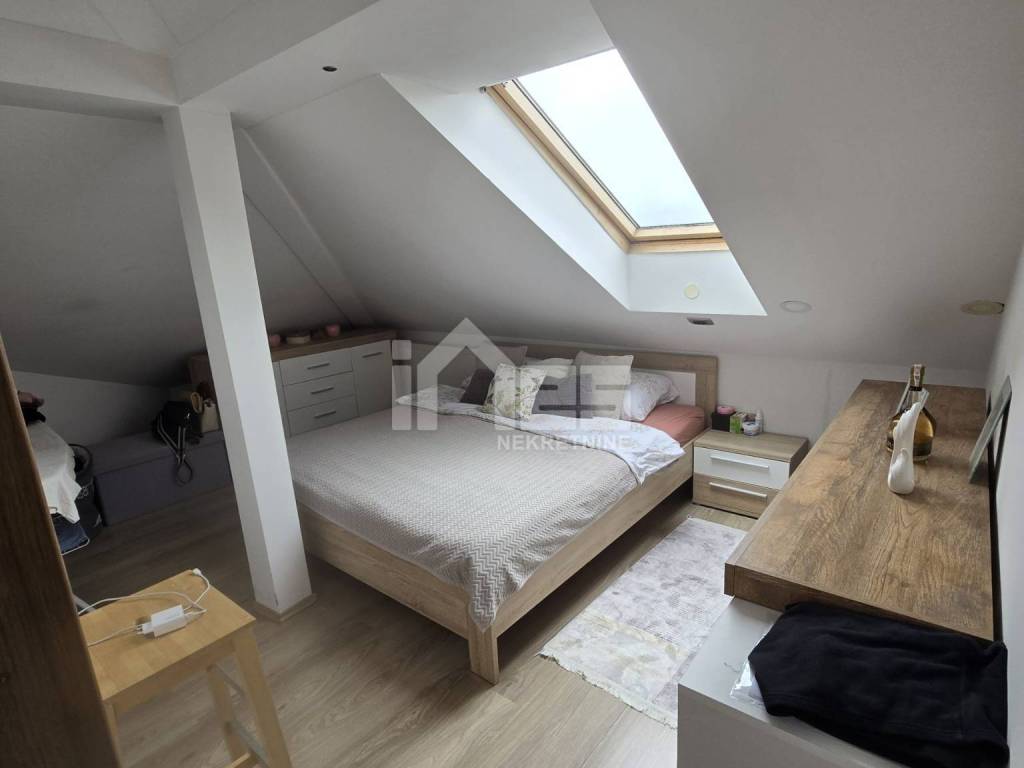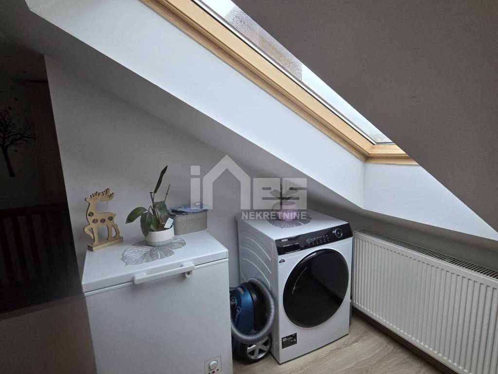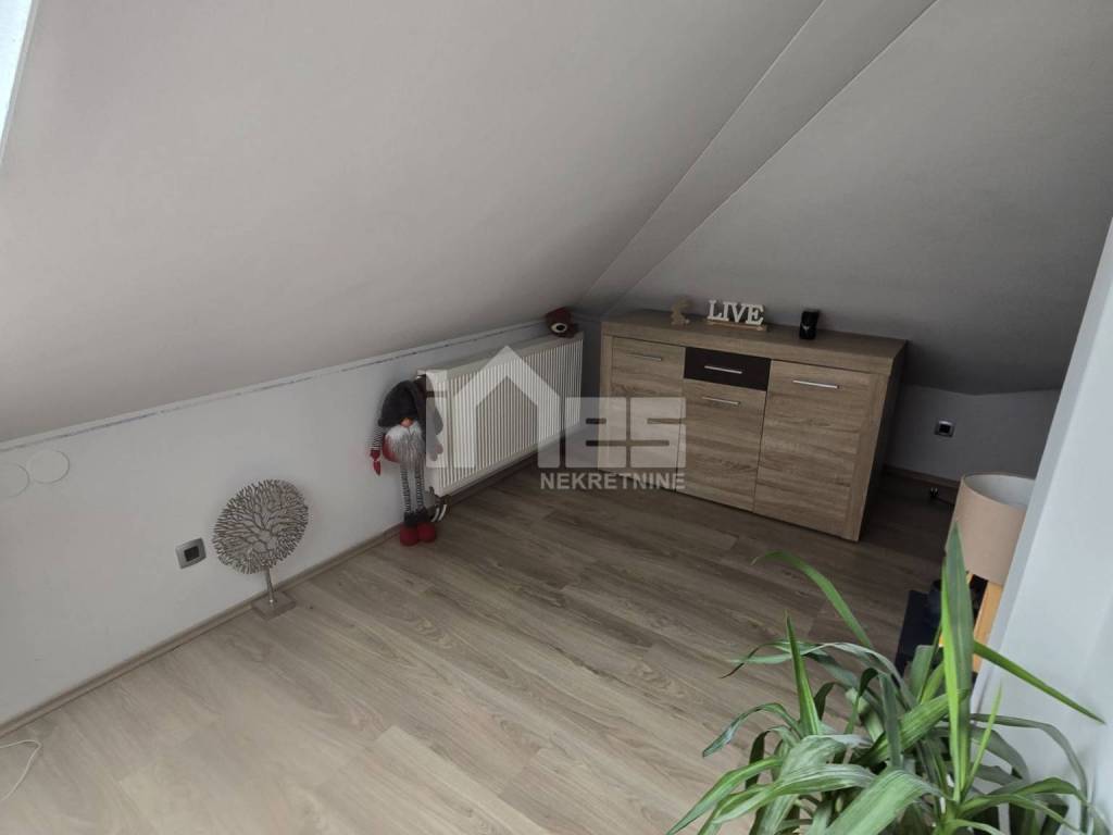 Prodaje se lijep, kompletno namješten stan u Zaprešiću na trećem katu stambene zgrade bez lifta. Stambena površina stana rasprostire se na: u prizemlju - kuhinja, blagovaona i dnevni boravak i na katu - tri spavaće sobe, kupaonica sa tušem, te spremište. Ukupna površina stana iznosi 95,21 m2, ali s obzirom da se radi o potkrovnom stanu sa kosinama, neto korisna površina iznosi 69,68 m2.