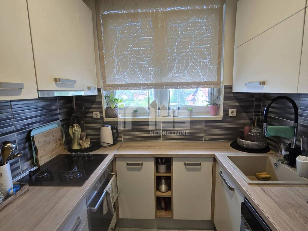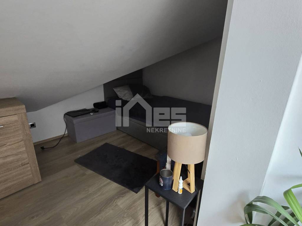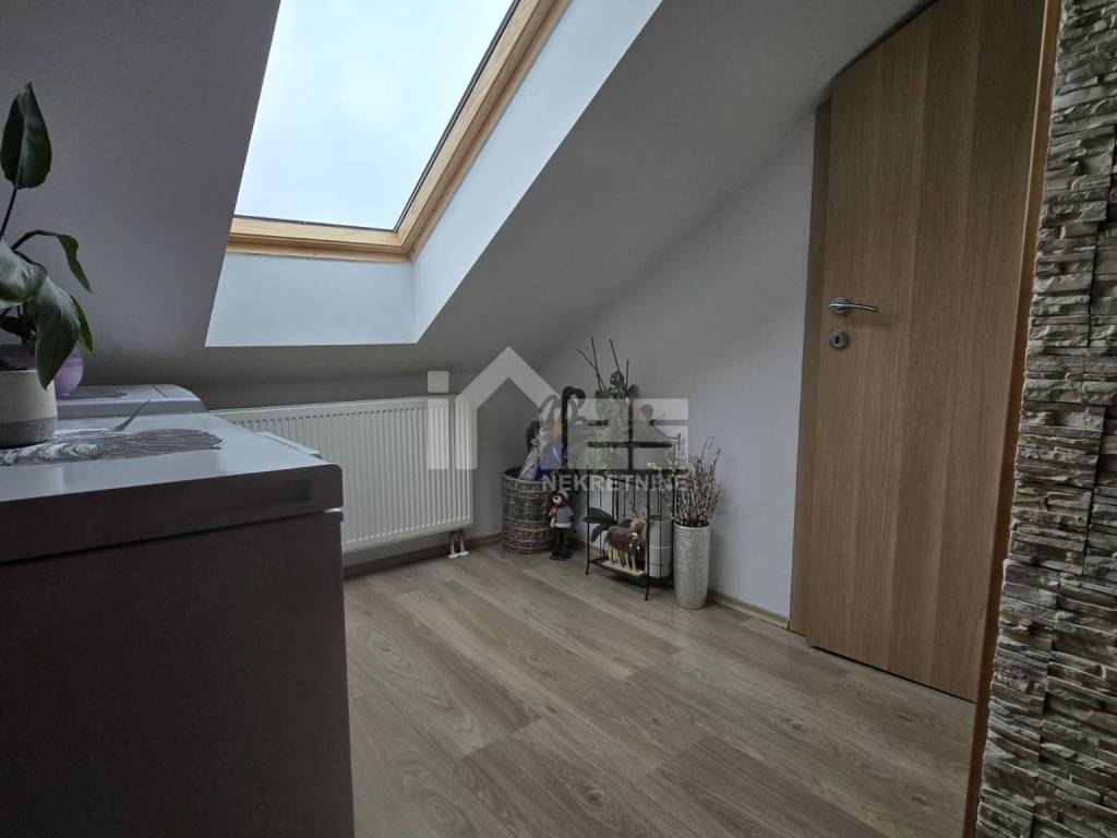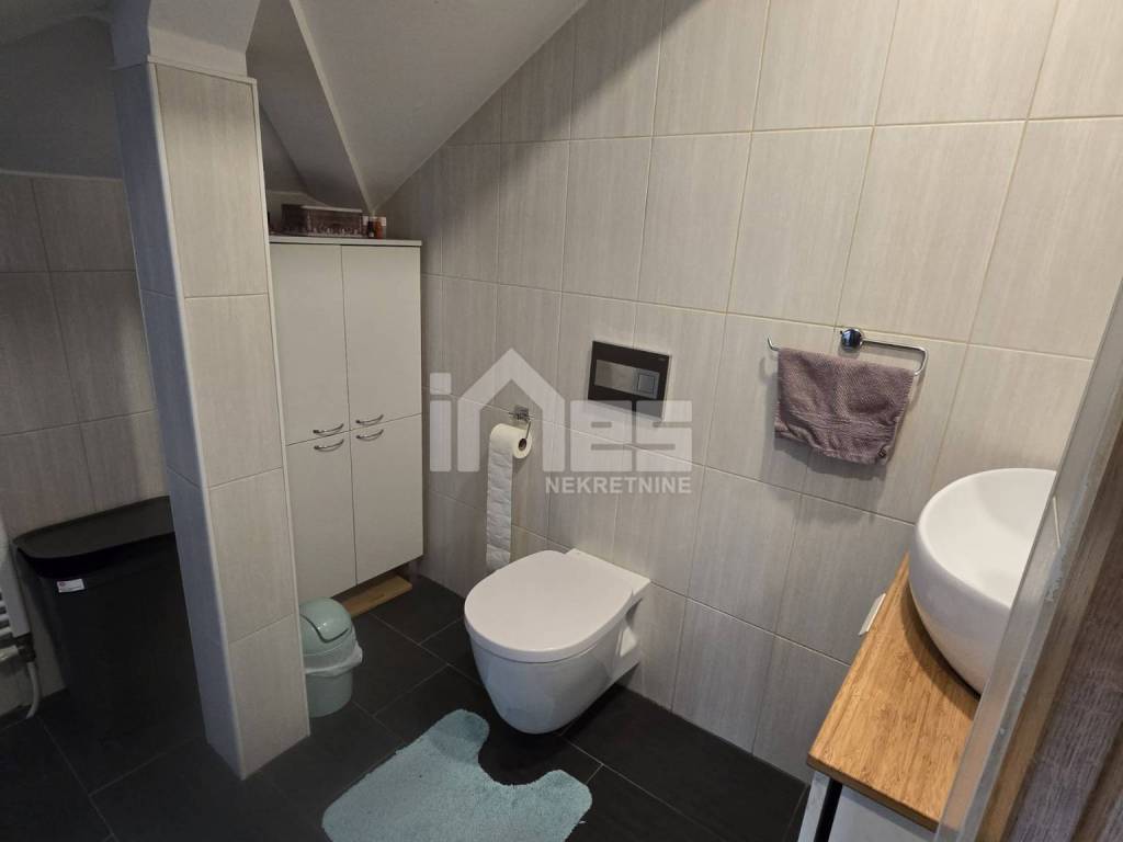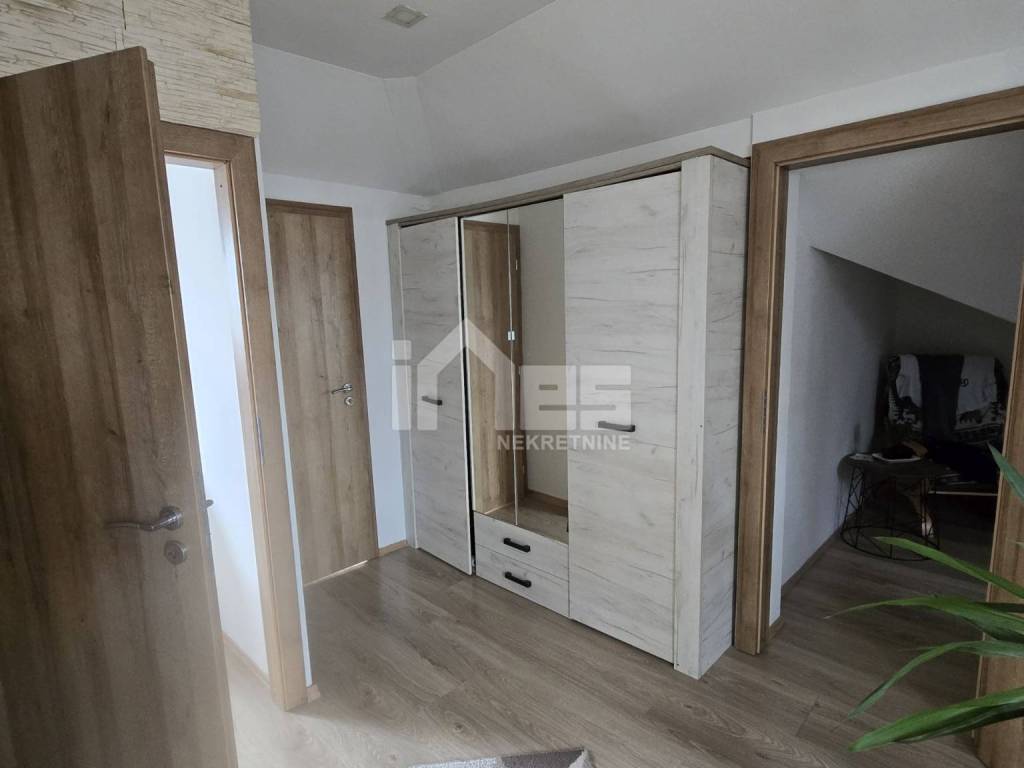 Prodaje se lijep, kompletno namješten stan u Zaprešiću na trećem katu stambene zgrade bez lifta. Stambena površina stana rasprostire se na: u prizemlju - kuhinja, blagovaona i dnevni boravak i na katu - tri spavaće sobe, kupaonica sa tušem, te spremište. Ukupna površina stana iznosi 95,21 m2, ali s obzirom da se radi o potkrovnom stanu sa kosinama, neto korisna površina iznosi 69,68 m2.