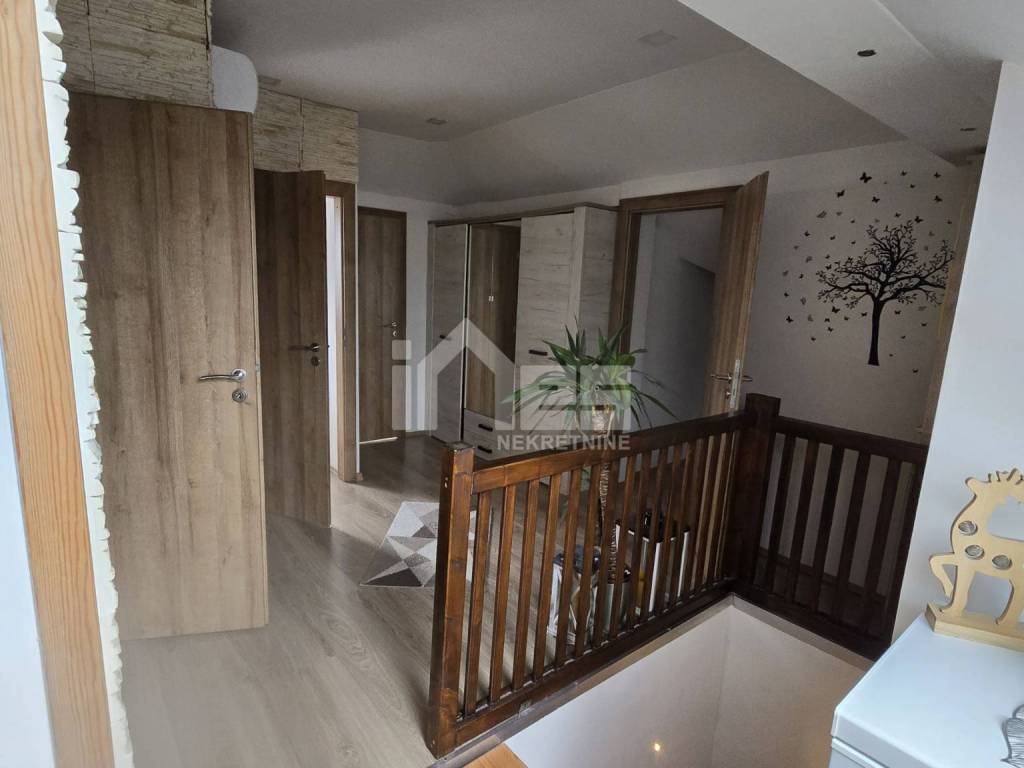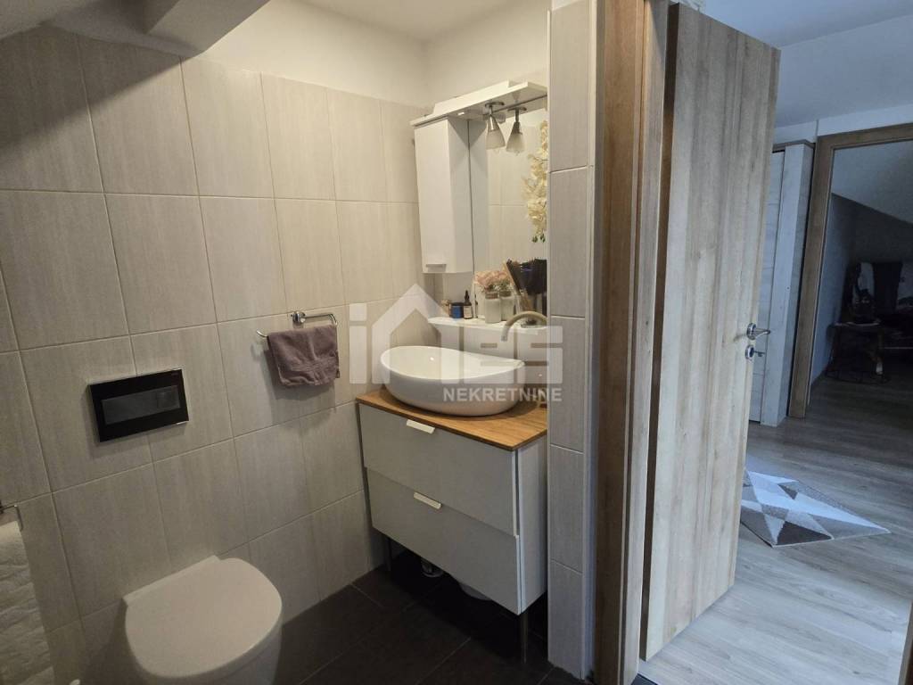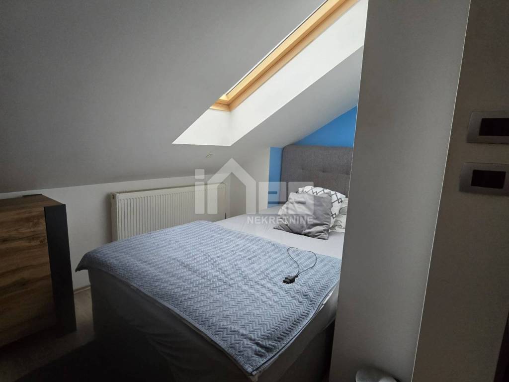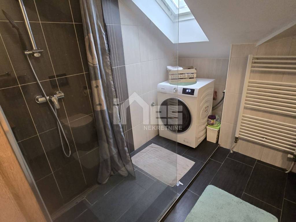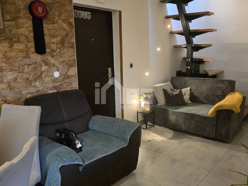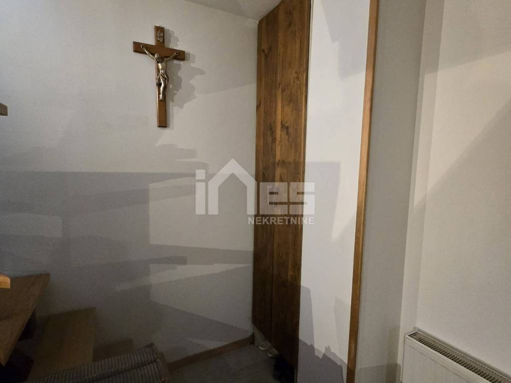 Prodaje se lijep, kompletno namješten stan u Zaprešiću na trećem katu stambene zgrade bez lifta. Stambena površina stana rasprostire se na: u prizemlju - kuhinja, blagovaona i dnevni boravak i na katu - tri spavaće sobe, kupaonica sa tušem, te spremište. Ukupna površina stana iznosi 95,21 m2, ali s obzirom da se radi o potkrovnom stanu sa kosinama, neto korisna površina iznosi 69,68 m2.