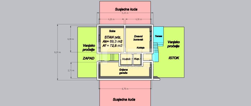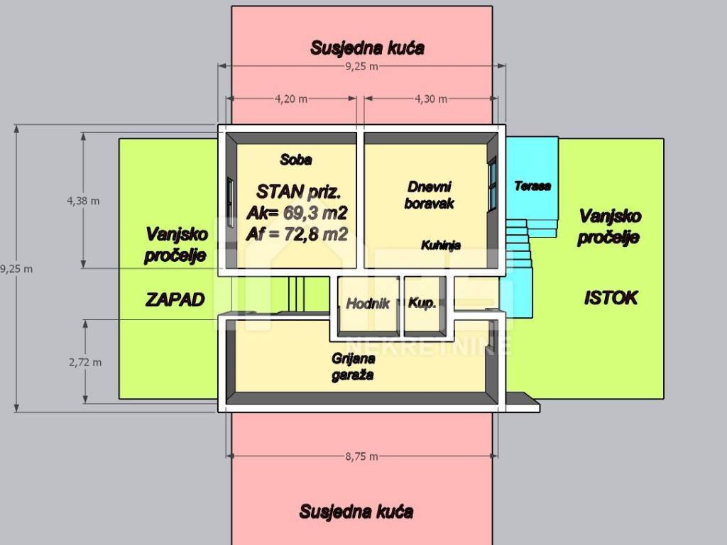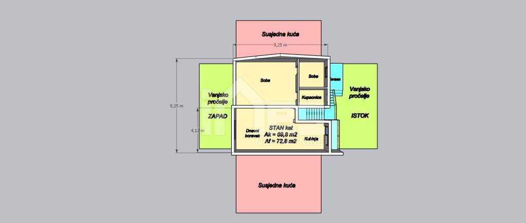 Kuća je funkcionalno podijeljena na dva odvojena stana, što pruža mogućnost dvojnog stanovanja (za dvije obitelji) ili najma jednog dijela: