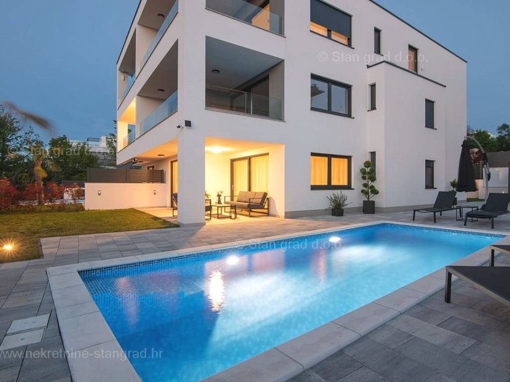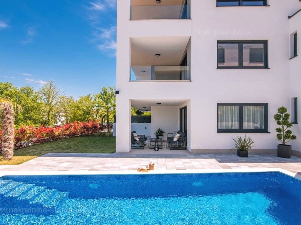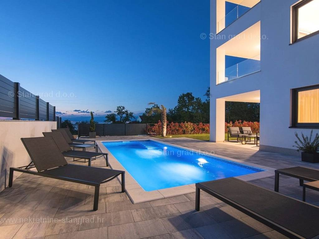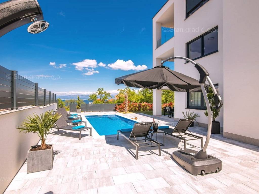 Za istaknuti je da dodanu vrijednost apartmanu daje pripadajuća okućnica površine 240 m2 oplemenjena grijanim bazenom i sunčalištem, ljetnom kuhinjom i vanjskim tušem. Na pripadajućem dijelu okućnice opisane nekretnine može se komforno parkirati dva automobila. Uz ranije značajke, objekt je odlično orijentiran, tako da se iz apartmana nudi krasan pogled na more i priobalje.