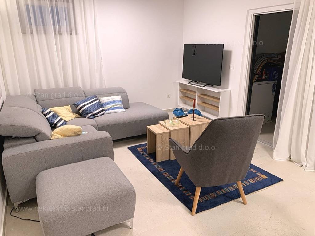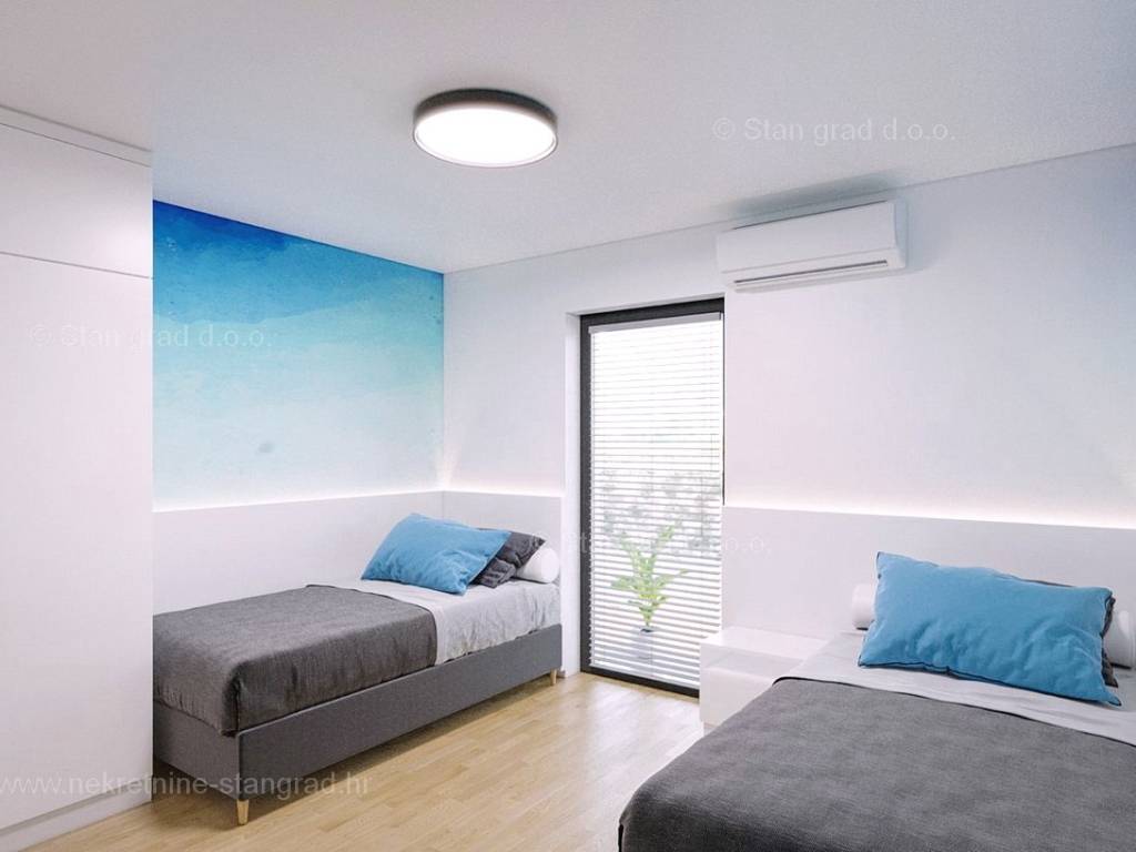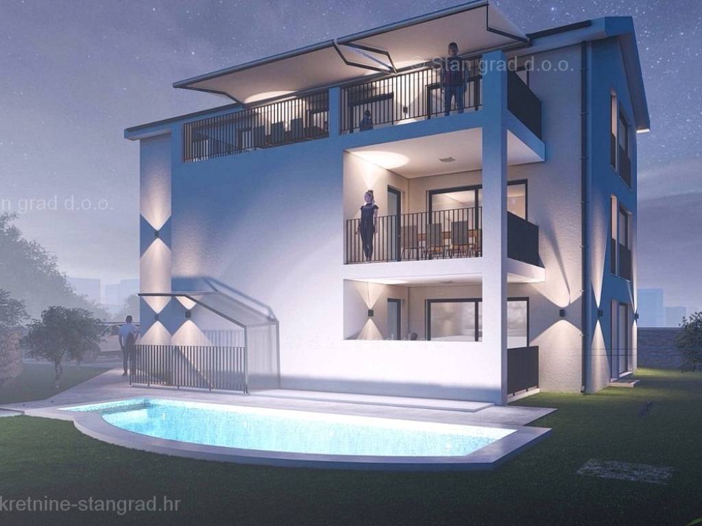 Kod agencije Stan Grad Immobilien su u prodaji dva iznimna apartmana građena po modernom projektu na atraktivnom sjevernojadranskom području otok Krk. Navedeni apartmani se nalaze na vrlo dobroj lokaciji u Malinskoj, u blizini centra, mora i svih sadržaja nužnih za komforno, ugodno i sigurno ljetovanje. Razmatrajući nekretninu prema vrsti, ovo su dva prostrana jednoetažna apartmana. U okviru vrlo lijepe građevine, apartman površine 104 m2 je pozicioniran na prizemnoj etaži, a površina obuhvaća ulazni hodnik, dnevni boravak, kuhinju s blagovaonicom, 3 spavaće sobe, 3 kupaonice, spremište, natkrivenu terasu i okućnicu s grijanim bazenom. Apartman u suterenu površine 98 m2 sastoji se od dnevnog boravka, kuhinje s blagovaonicom, 2 spavaće sobe, kupaonice i wc-a te natkrivene terase i okućnice s grijanim bazenom. Nekretnina je kompletno opremljena modernim namještajem te suvremenom i kvalitetnom tehničkom opremom. U vlasništvu ove nekretnine je uređen parkirni prostor za parkiranje dva automobila. Uz ranije opisane značajke ove nekretnine, istaknuli bismo i odličnu orijentaciju i dopadljiv pogled apartmana prema bližoj urbaniziranoj okolici, moru i prirodnom krajobrazu. Ova je nekretnina vlasništvo fizičke osobe pa je kupac prilikom prijepisa njegovog vlasništva na svoje ime u obvezi plaćanja poreza na promet u visini 3%. Prodavatelj nekretnine garantira brz prijenos vlasničkih prava te urednu vlasničku i tehničku dokumentaciju. Očekujemo vas na Kvarneru s uvjerenjem u vaše zadovoljstvo našom uslugom. Poklonite li nam svoje povjerenje, agencija Stan Grad Immobilien rado će vam pomoći u prijenosu vlasničkih prava ove nekretnine te računa za njene komunalne priključke i usluge na vaše ime.