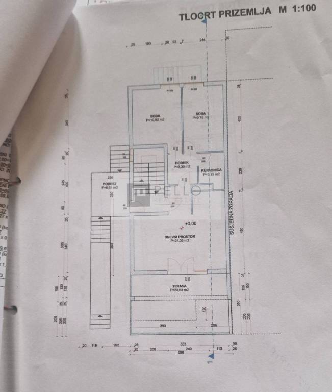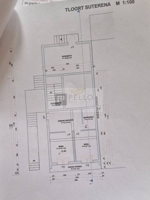 Kuća se sastoji od 4 stana(suteren 37,73 m2, prizemlje 85,98 m2, kat 76,41m2,potkrovlje 52,63m2)spremišta (18m2) parking ispred kuće veličine 90 m2 te okućnice koja se sastoji od vrta iza kuće ,te komina s dvorištem s bočne strane kuće.