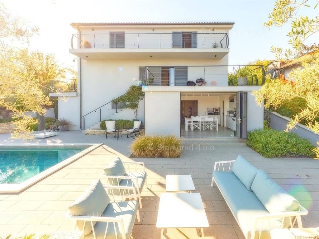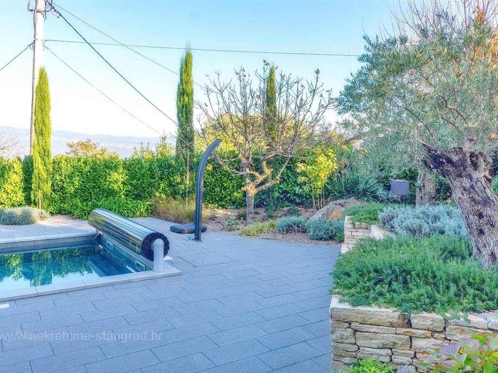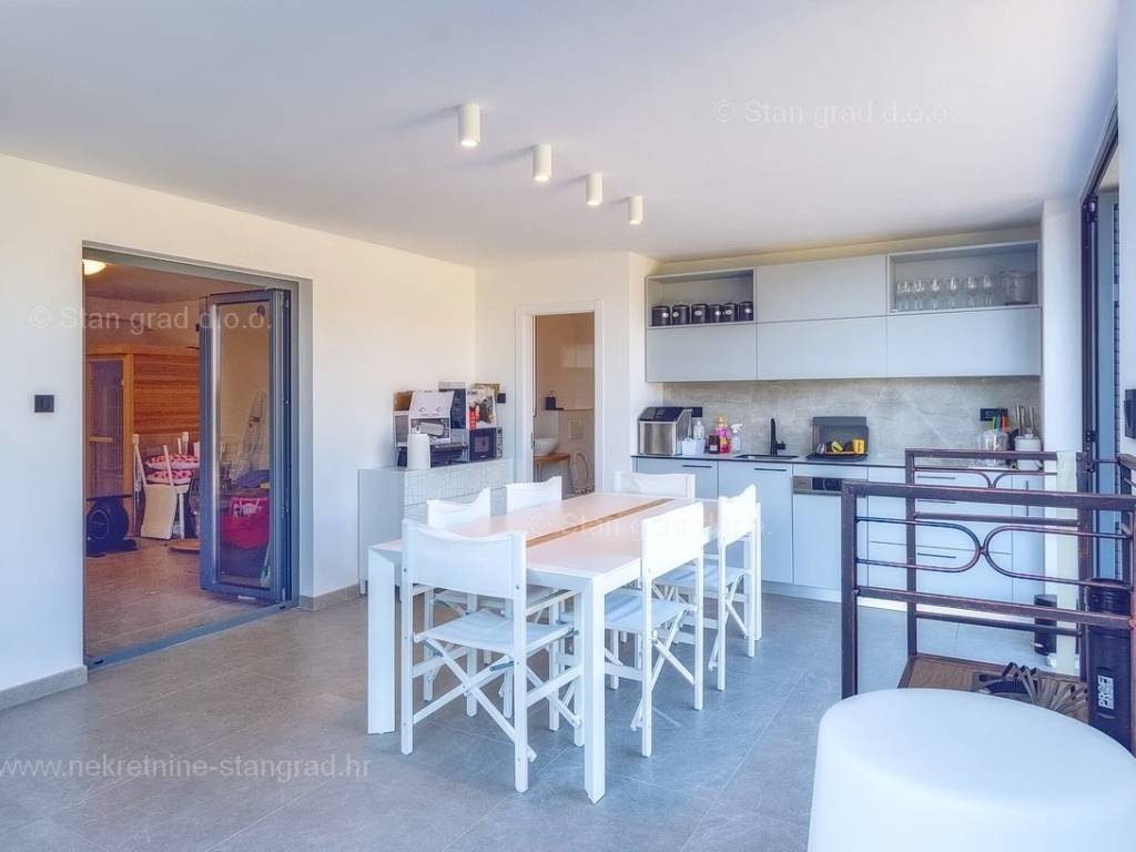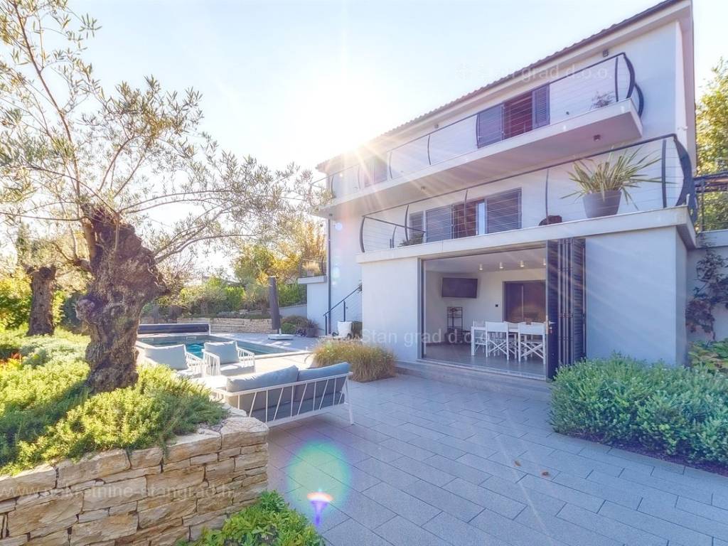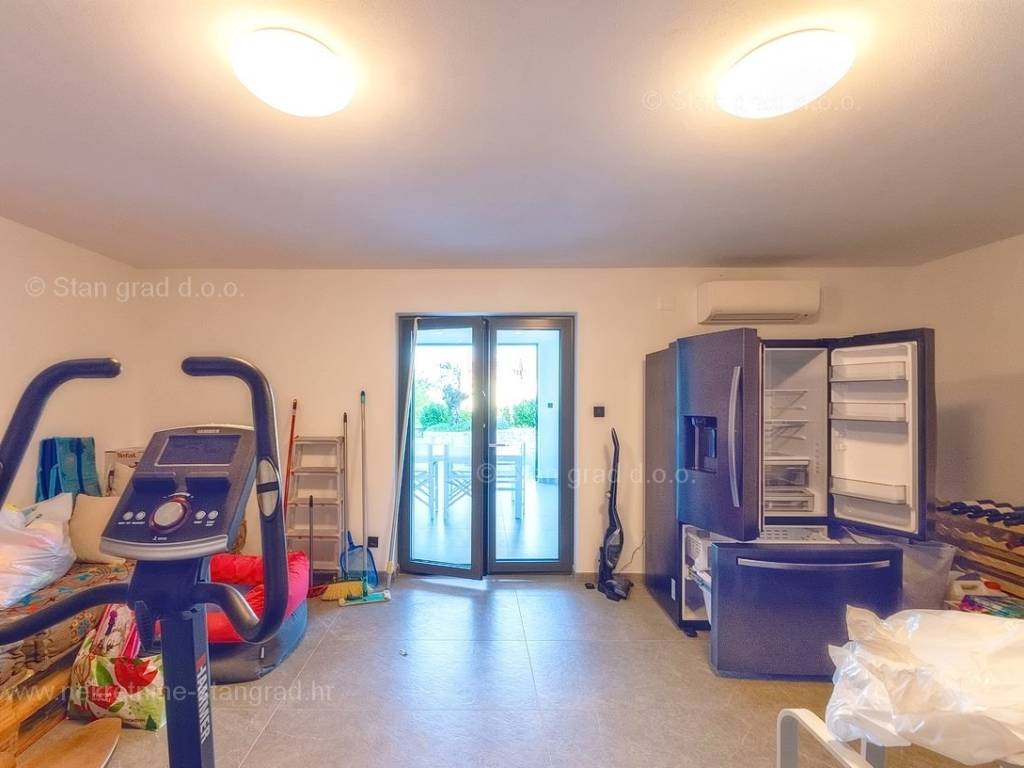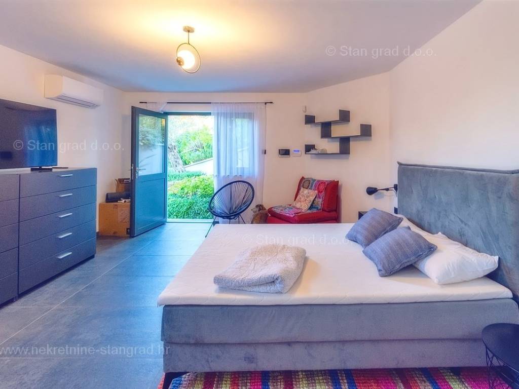U agenciji Stan Grad Immobilien na Kvarneru prodaje se zanimljiva kuća za odmor unutar tradicionalno najtraženijeg hrvatskog jadranskog područja otok Krk. Navedena se kuća nalazi na vrlo lijepoj poziciji nedaleko mora u Uvali Soline. Gledajući strukturno, ovo je samostojeća kuća katnica. Besprijekorno izvedena nekretnina sastavljena je od ukupno 3 etaže. Kuća ima dva odvojena stana. Površina ove kuće iznosi ukupno 300 m2. U prizemlju navedene nekretnine nalazi se studio apartman, opremljena teretana, sauna i grijani bazen dužine 9 metara. Na prvom katu smješten je dvoetažni apartman. Donju etažu apartmana čini prostrani dnevni boravak, kuhinja i blagovaonica, 1 spavaća soba s vlastitom kupaonicom, gostinjski wc i izlaz na veliku terasu s panoramskim pogledom na more. Na gornjoj etaži apartmana nalaze se dvije spavaće sobe, svaka sa svojom kupaonicom. Unutarnji prostori nekretnine su osobito dobro održavani te u potpunosti opremljeni potrebnim tehničkim uređajima i vrlo kvalitetnim namještajem. Dodanu vrijednost ovom cijelom objektu daje okućnica oplemenjena bazenom koji se grije dizalicom topline, a voda zagrijava putem solarnih panela i sunčalištem, mediteranskim biljem te ljetnom kuhinjom. Prostrana okućnica opisane nekretnine nudi natkriveni parking za više vozila s punionicom za električna vozila. Uz sve navedeno, treba istaknuti da nekretnina ima prekrasan otvoreni pogled na more. Ova nekretnina je u vlasništvu fizičke osobe i kao takva prilikom prijenosa vlasništva na kupca podliježe obvezi plaćanja poreza na promet nekretnine u visini 3%. Vlasnik kuće jamči brz prijenos prava raspolaganja nekretninom na kupca. Bit će nam zadovoljstvo primiti vas i uslužiti na otoku Krku. Agencija Stan Grad Immobilien će svim svojim klijentima pružiti svu potrebnu pomoć kod uknjižbe vlasništva i preuzimanja same nekretnine.