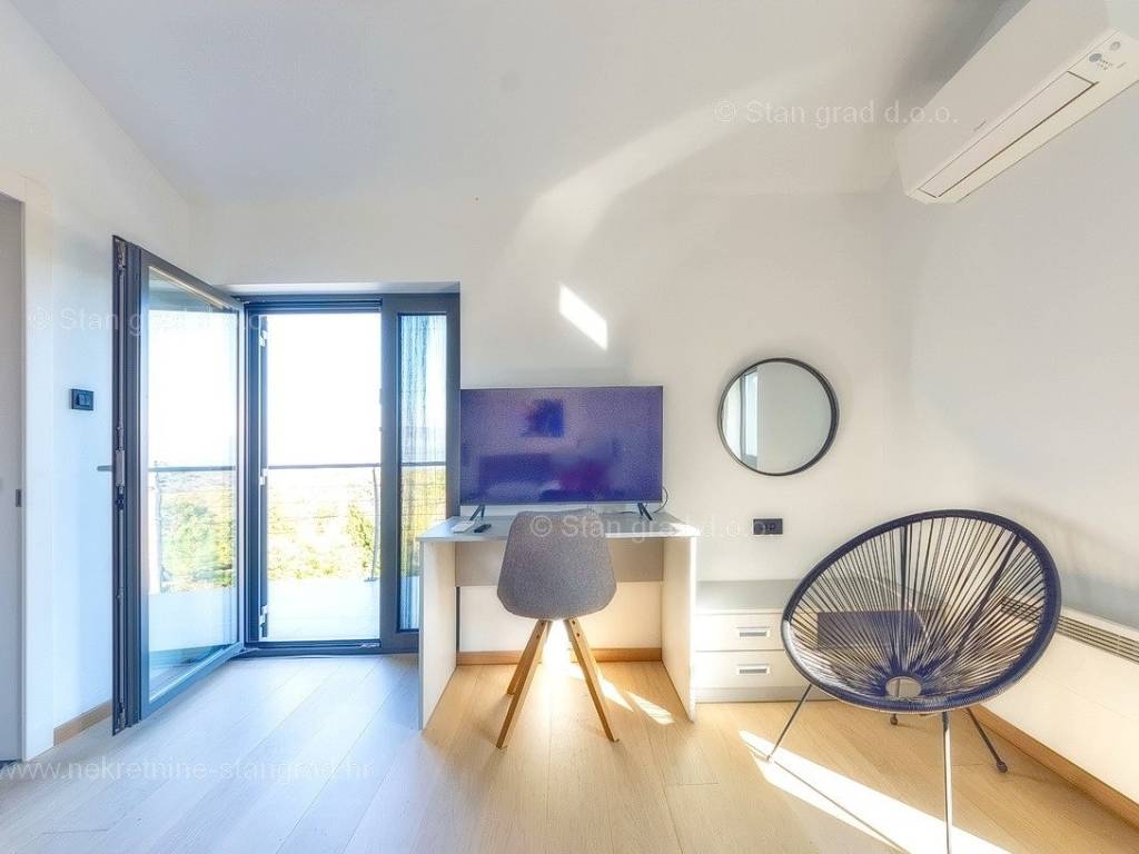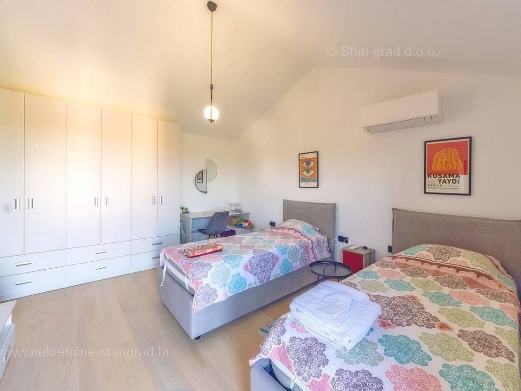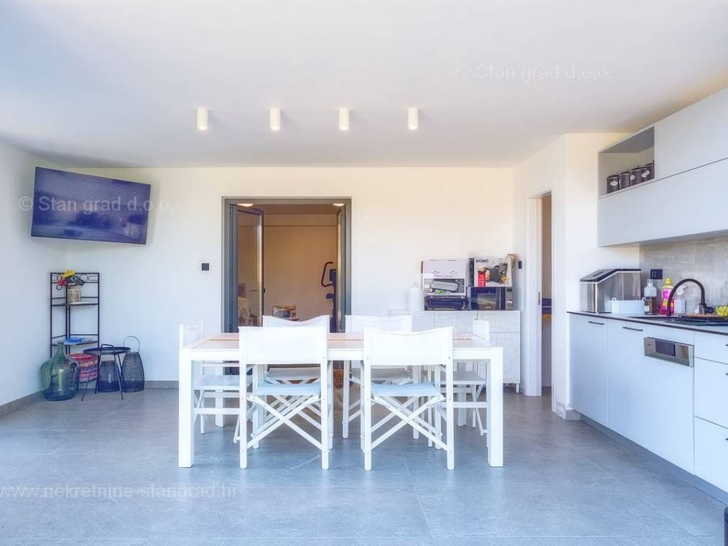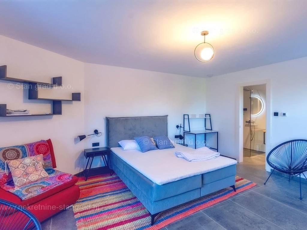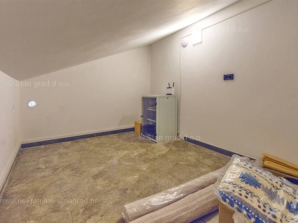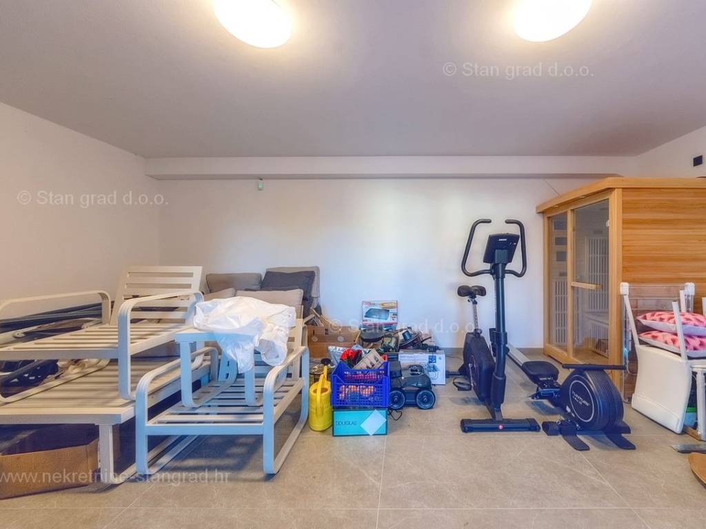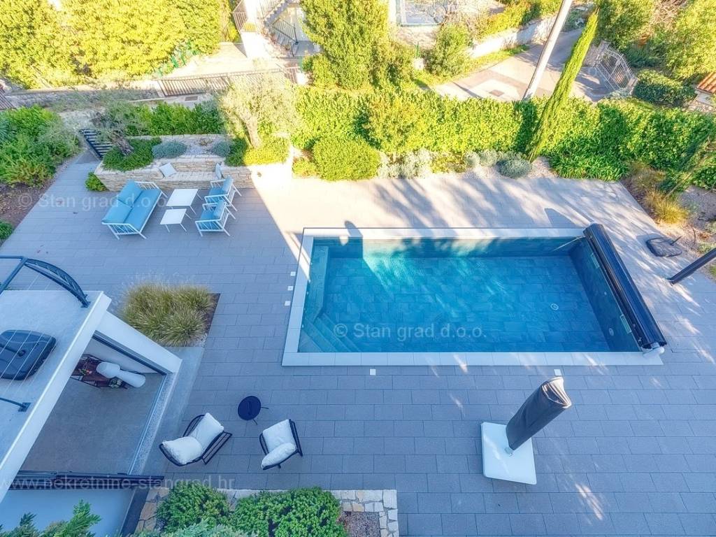 U agenciji Stan Grad Immobilien na Kvarneru prodaje se zanimljiva kuća za odmor unutar tradicionalno najtraženijeg hrvatskog jadranskog područja otok Krk. Navedena se kuća nalazi na vrlo lijepoj poziciji nedaleko mora u Uvali Soline. Gledajući strukturno, ovo je samostojeća kuća katnica. Besprijekorno izvedena nekretnina sastavljena je od ukupno 3 etaže. Kuća ima dva odvojena stana. Površina ove kuće iznosi ukupno 300 m2. U prizemlju navedene nekretnine nalazi se studio apartman, opremljena teretana, sauna i grijani bazen dužine 9 metara. Na prvom katu smješten je dvoetažni apartman. Donju etažu apartmana čini prostrani dnevni boravak, kuhinja i blagovaonica, 1 spavaća soba s vlastitom kupaonicom, gostinjski wc i izlaz na veliku terasu s panoramskim pogledom na more. Na gornjoj etaži apartmana nalaze se dvije spavaće sobe, svaka sa svojom kupaonicom. Unutarnji prostori nekretnine su osobito dobro održavani te u potpunosti opremljeni potrebnim tehničkim uređajima i vrlo kvalitetnim namještajem. Dodanu vrijednost ovom cijelom objektu daje okućnica oplemenjena bazenom koji se grije dizalicom topline, a voda zagrijava putem solarnih panela i sunčalištem, mediteranskim biljem te ljetnom kuhinjom. Prostrana okućnica opisane nekretnine nudi natkriveni parking za više vozila s punionicom za električna vozila. Uz sve navedeno, treba istaknuti da nekretnina ima prekrasan otvoreni pogled na more. Ova nekretnina je u vlasništvu fizičke osobe i kao takva prilikom prijenosa vlasništva na kupca podliježe obvezi plaćanja poreza na promet nekretnine u visini 3%. Vlasnik kuće jamči brz prijenos prava raspolaganja nekretninom na kupca. Bit će nam zadovoljstvo primiti vas i uslužiti na otoku Krku. Agencija Stan Grad Immobilien će svim svojim klijentima pružiti svu potrebnu pomoć kod uknjižbe vlasništva i preuzimanja same nekretnine.