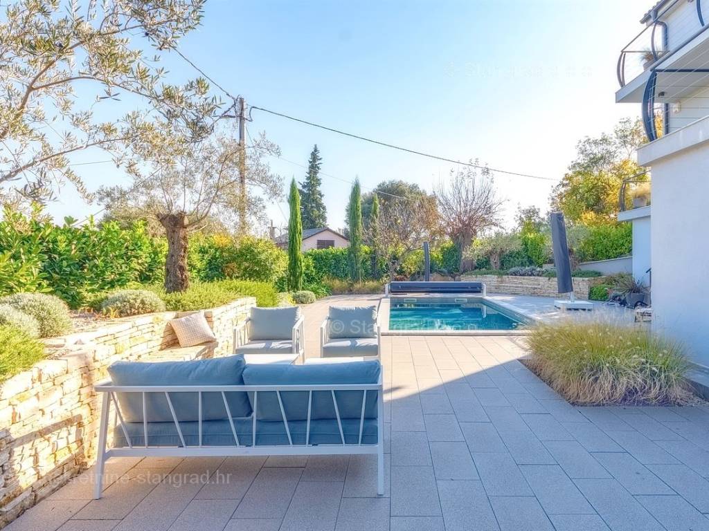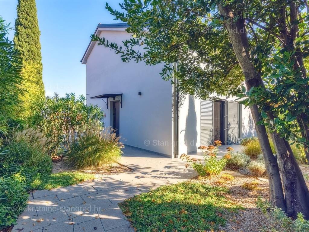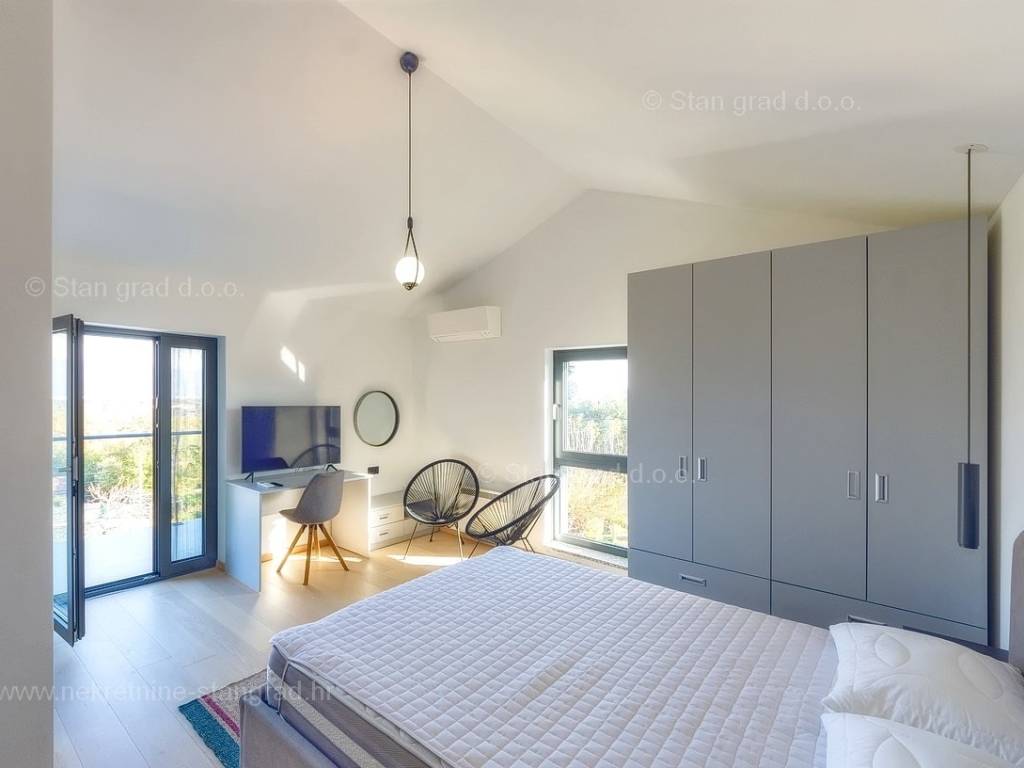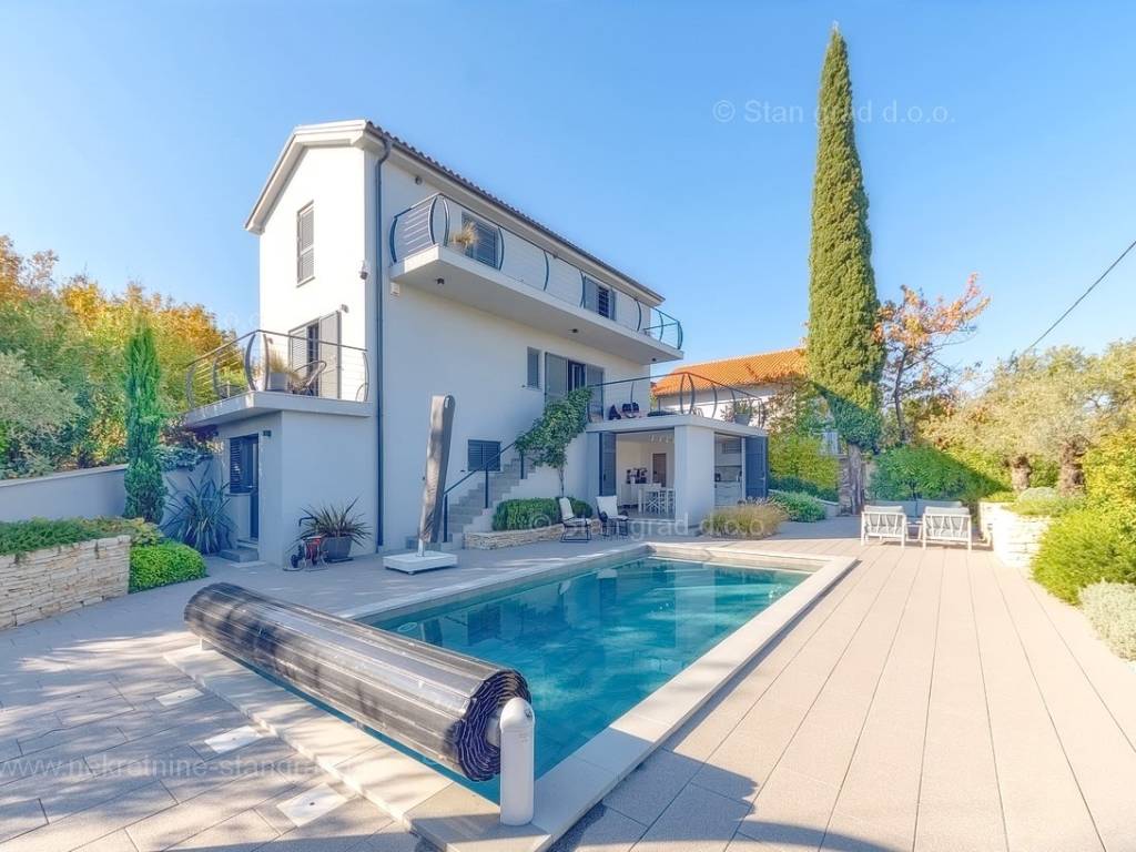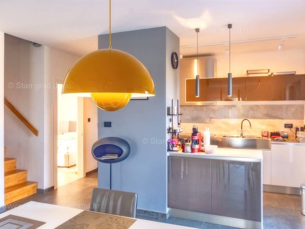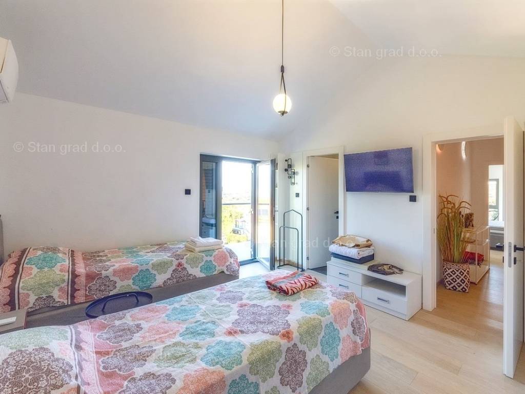 U agenciji Stan Grad Immobilien na Kvarneru prodaje se zanimljiva kuća za odmor unutar tradicionalno najtraženijeg hrvatskog jadranskog područja otok Krk. Navedena se kuća nalazi na vrlo lijepoj poziciji nedaleko mora u Uvali Soline. Gledajući strukturno, ovo je samostojeća kuća katnica. Besprijekorno izvedena nekretnina sastavljena je od ukupno 3 etaže. Kuća ima dva odvojena stana. Površina ove kuće iznosi ukupno 300 m2. U prizemlju navedene nekretnine nalazi se studio apartman, opremljena teretana, sauna i grijani bazen dužine 9 metara. Na prvom katu smješten je dvoetažni apartman. Donju etažu apartmana čini prostrani dnevni boravak, kuhinja i blagovaonica, 1 spavaća soba s vlastitom kupaonicom, gostinjski wc i izlaz na veliku terasu s panoramskim pogledom na more. Na gornjoj etaži apartmana nalaze se dvije spavaće sobe, svaka sa svojom kupaonicom. Unutarnji prostori nekretnine su osobito dobro održavani te u potpunosti opremljeni potrebnim tehničkim uređajima i vrlo kvalitetnim namještajem. Dodanu vrijednost ovom cijelom objektu daje okućnica oplemenjena bazenom koji se grije dizalicom topline, a voda zagrijava putem solarnih panela i sunčalištem, mediteranskim biljem te ljetnom kuhinjom. Prostrana okućnica opisane nekretnine nudi natkriveni parking za više vozila s punionicom za električna vozila. Uz sve navedeno, treba istaknuti da nekretnina ima prekrasan otvoreni pogled na more. Ova nekretnina je u vlasništvu fizičke osobe i kao takva prilikom prijenosa vlasništva na kupca podliježe obvezi plaćanja poreza na promet nekretnine u visini 3%. Vlasnik kuće jamči brz prijenos prava raspolaganja nekretninom na kupca. Bit će nam zadovoljstvo primiti vas i uslužiti na otoku Krku. Agencija Stan Grad Immobilien će svim svojim klijentima pružiti svu potrebnu pomoć kod uknjižbe vlasništva i preuzimanja same nekretnine.