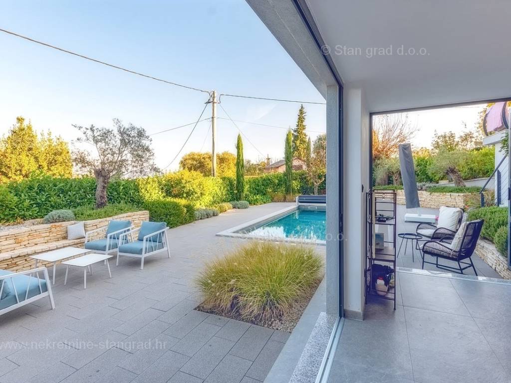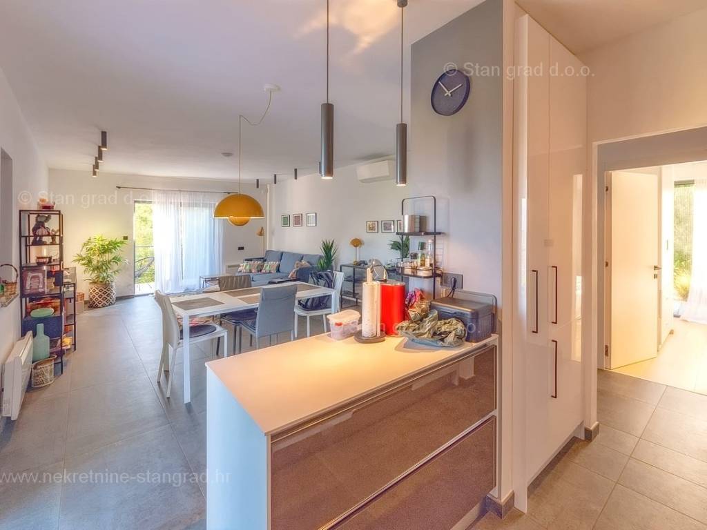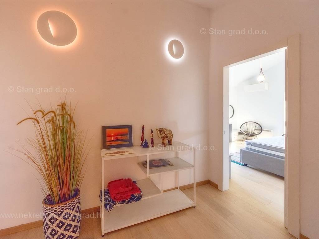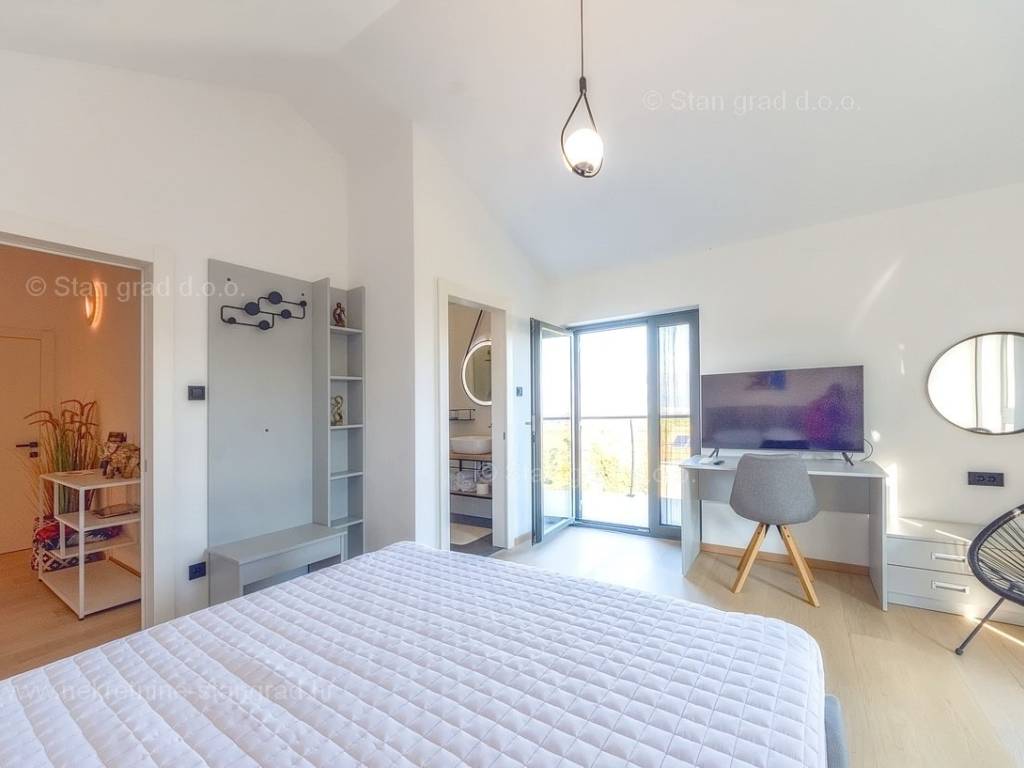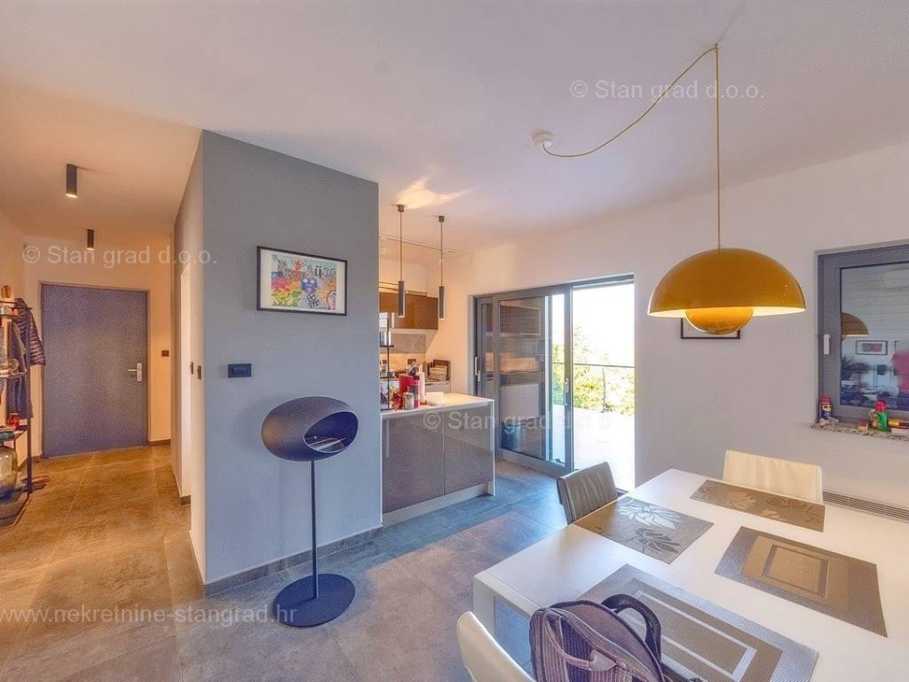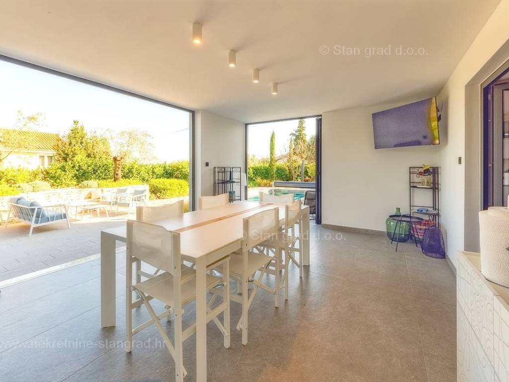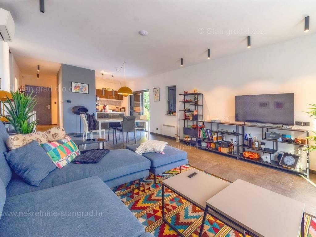 U agenciji Stan Grad Immobilien na Kvarneru prodaje se zanimljiva kuća za odmor unutar tradicionalno najtraženijeg hrvatskog jadranskog područja otok Krk. Navedena se kuća nalazi na vrlo lijepoj poziciji nedaleko mora u Uvali Soline. Gledajući strukturno, ovo je samostojeća kuća katnica. Besprijekorno izvedena nekretnina sastavljena je od ukupno 3 etaže. Kuća ima dva odvojena stana. Površina ove kuće iznosi ukupno 300 m2. U prizemlju navedene nekretnine nalazi se studio apartman, opremljena teretana, sauna i grijani bazen dužine 9 metara. Na prvom katu smješten je dvoetažni apartman. Donju etažu apartmana čini prostrani dnevni boravak, kuhinja i blagovaonica, 1 spavaća soba s vlastitom kupaonicom, gostinjski wc i izlaz na veliku terasu s panoramskim pogledom na more. Na gornjoj etaži apartmana nalaze se dvije spavaće sobe, svaka sa svojom kupaonicom. Unutarnji prostori nekretnine su osobito dobro održavani te u potpunosti opremljeni potrebnim tehničkim uređajima i vrlo kvalitetnim namještajem. Dodanu vrijednost ovom cijelom objektu daje okućnica oplemenjena bazenom koji se grije dizalicom topline, a voda zagrijava putem solarnih panela i sunčalištem, mediteranskim biljem te ljetnom kuhinjom. Prostrana okućnica opisane nekretnine nudi natkriveni parking za više vozila s punionicom za električna vozila. Uz sve navedeno, treba istaknuti da nekretnina ima prekrasan otvoreni pogled na more. Ova nekretnina je u vlasništvu fizičke osobe i kao takva prilikom prijenosa vlasništva na kupca podliježe obvezi plaćanja poreza na promet nekretnine u visini 3%. Vlasnik kuće jamči brz prijenos prava raspolaganja nekretninom na kupca. Bit će nam zadovoljstvo primiti vas i uslužiti na otoku Krku. Agencija Stan Grad Immobilien će svim svojim klijentima pružiti svu potrebnu pomoć kod uknjižbe vlasništva i preuzimanja same nekretnine.