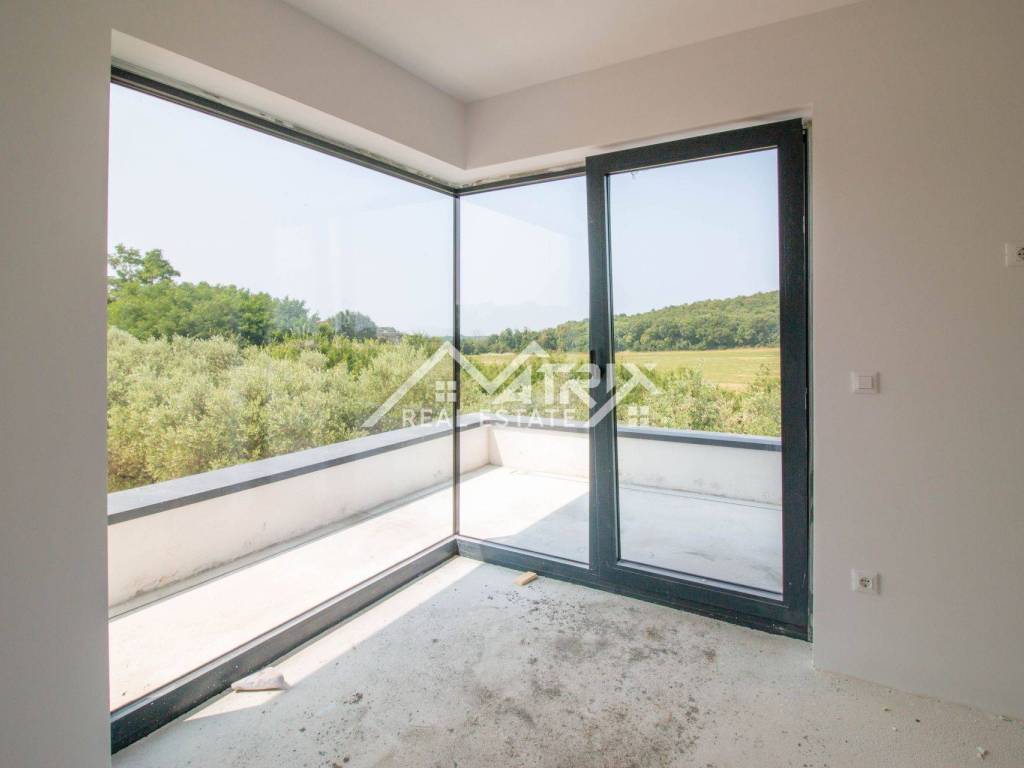 Kuća se prostire na dvije etaže: prizemlje i prvi kat. Centralni dio prizemlja je veliki prostor koji ujedinjuje dnevni boravak s blagovaonicom i kuhinjom, s izlazom na terasu bazena i u maslinik kroz velike staklene stijene, koje pružaju obilje dnevnog svjetla kroz cijeli dan. U prizemlju se također nalazi kupaonica, te manja soba koja je zamišljena kao ured ili kao dječja soba. Na katu se nalaze tri spavaće sobe od kojih master spavaća soba ima vlastitu kupaonicu, dok preostale dvije spavaće soba imaju zajedničku kupaonicu. Sve tri spavaće sobe imaju izlaz na terasu sa koje se pruža prekrasan otvoreni pogled na prirodu.
