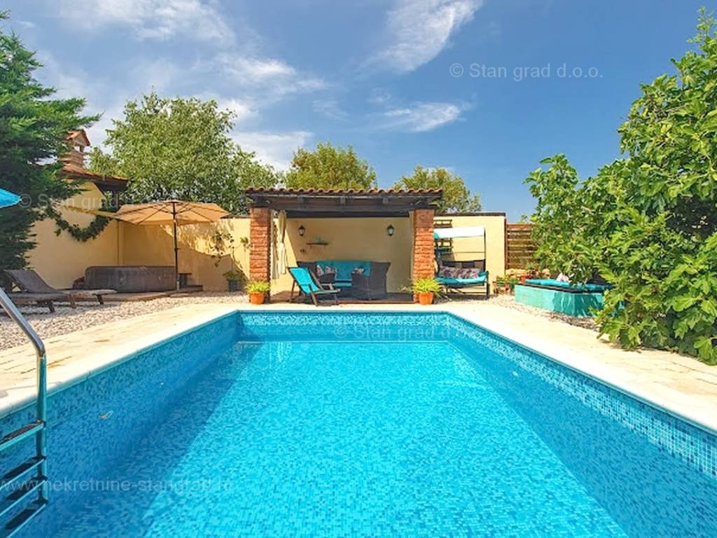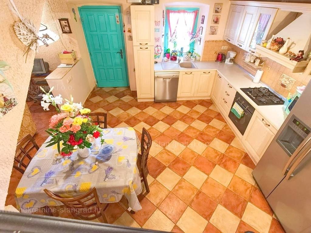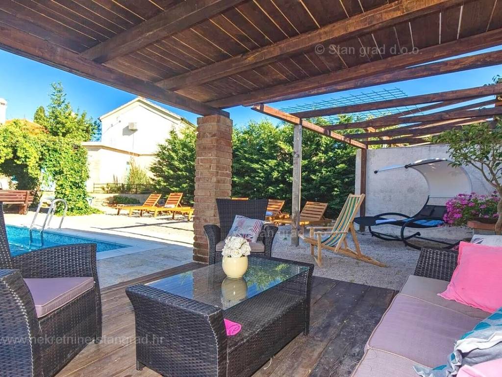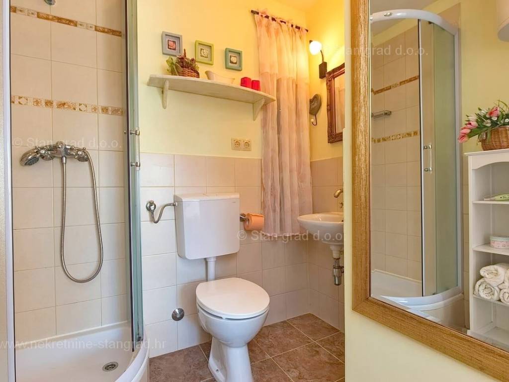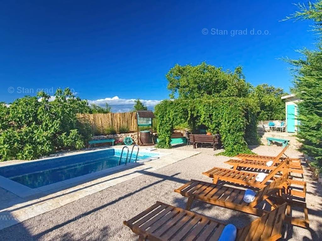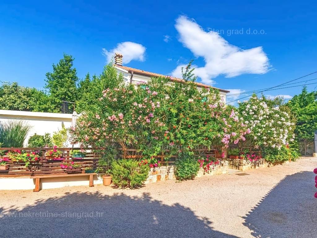 Na prodaju kod naše agencije na Kvarneru je stavljena vrlo vrijedna i skupocjeno građena kuća za odmor na poznatom i atraktivnom jadranskom turističkom području otok Krk. Ova je kuća pozicionirana na mirnoj lokaciji u okolici primorskog mjesta Malinska, ne predaleko od mora. Gledajući strukturno, ovo je samostojeća kuća katnica s pomoćnim objektom površine cca 50 m2. Besprijekorno izvedena nekretnina sastavljena je od ukupno 2 etaže. Površina ove kuće iznosi ukupno 180 m2. Ovom površinom su u prizemlju obuhvaćeni dnevni boravak i kuhinja s blagovaonicom, toalet, spavaća soba opremljena kupaonicom s jacuzzijem, spremište i izlaz na natkrivenu terasu od 50 m2. Spiralnim stepeništem od kovanog željeza dolazi se na prvi kat na kojem se nalazi dječja soba i glavna spavaća soba koja ima vlastitu kupaonicu. U izvanredno održavani i raskošno namješteni interijer predmetne nekretnine je instaliran bogati set uređaja novije generacije. Dodanu vrijednost ovom cijelom objektu daje okućnica oplemenjena bazenom i sunčalištem. Također kuća ima konobu od 60 m2 i više natkrivenih terasa idealnih za druženje. Pomoćni objekt se sastoji od kuhinje, blagovaonice, galerije, kupaonice, konobe i wc-a. Prostrana okućnica opisane nekretnine uređeno je komotno parkiranje više vozila. Uz prethodno, nije zanemarivo kazati da kuća ima lijep pogled na šumu i prirodno raslinje. Predmetna je kuća u vlasništvu fizičke obveze i kod prijenosa vlasništva podliježe obračunu poreza na promet nekretnina u visini 3%. Prodavatelj nekretnine garantira brz prijenos vlasničkih prava te urednu vlasničku i tehničku dokumentaciju. Najavite se i rado ćemo vas primiti u našem uredu na otoku Krku. Odlučite li se za nas, stručni tim posredničkog ureda Stan Grad Immobilien će vam sa zadovoljstvom pomoći kod prijenosa vlasništva nekretnine i računa za komunalne priključke na svoje ime.