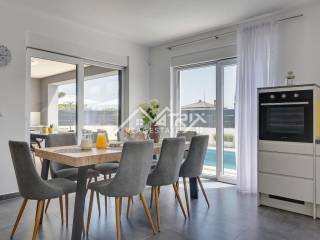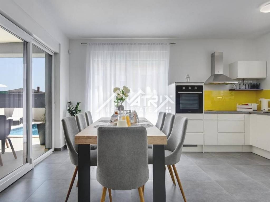 U mirnom naselju u okolici grada Pule prodaje se ova moderna kuća s bazenom, ukupne stambene površine 172 m2. Kuća je idealno smještena blizu centra naselja, a dovoljno daleko od gradske gužve. Najbliže plaže udaljene su 5 km, a trgovački centri u Puli udaljeni su 2,5 kilometara.