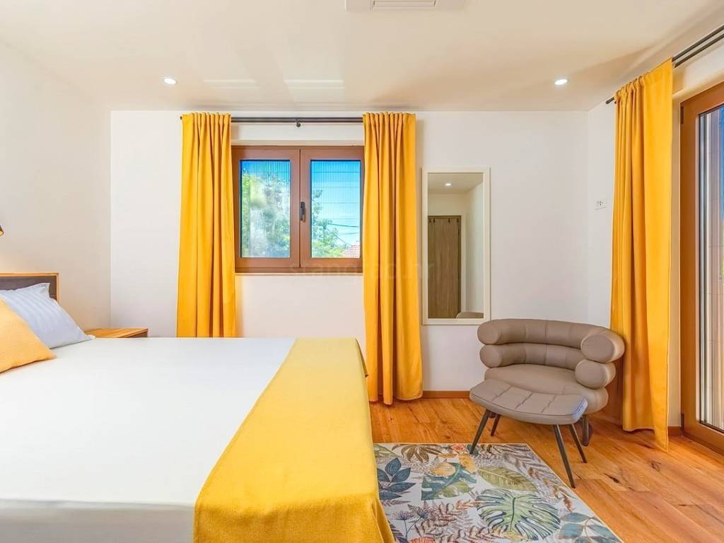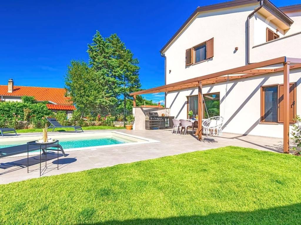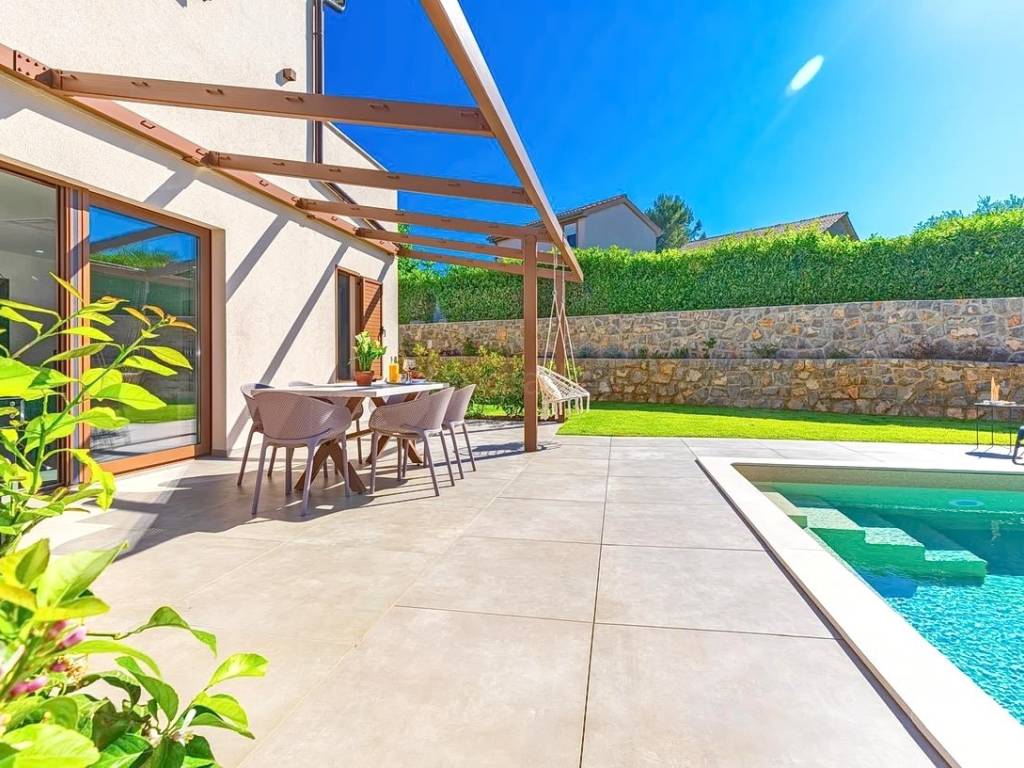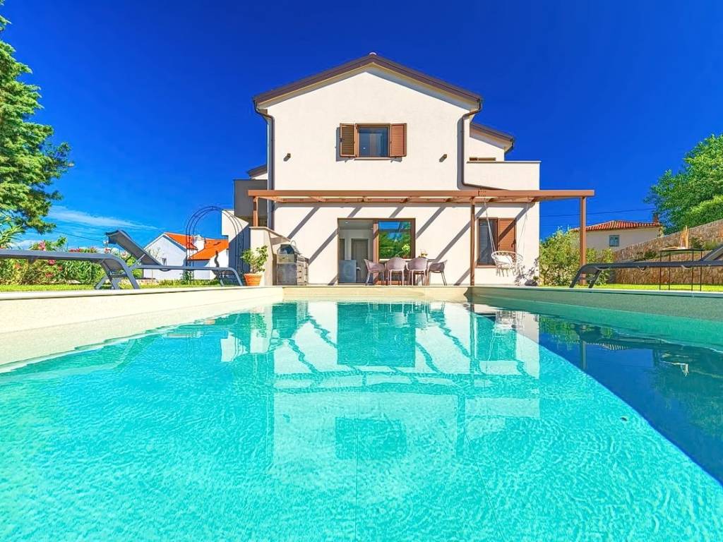 Na prodaju kod naše agencije na Kvarneru je stavljena vrlo vrijedna i skupocjeno građena kuća za odmor na poznatom i atraktivnom jadranskom turističkom području otok Krk. Ova je kuća pozicionirana na mirnoj lokaciji u okolici grada Krka, ne predaleko od mora. Strukturno, ovo je dvojna kuća katnica. Suvremeno građena kuća se sastoji od prostora raspoređenog na ukupno 2 etaže. Nekretnina obuhvaća ukupnu površinu od 140 m2. U navedenoj površini u prizemlju sadržani su ulazni hodnik, wc, ostava, spavaća soba s vlastitom kupaonicom, open space kuhinja s blagovaonicom i dnevni boravak s izlazom na okućnicu. Na katu kuće nalaze se dvije spavaće sobe, svaka s vlastitom kupaonicom, garderobom i izlazom na veliku terasu. Posebnu čar ovom posjedu daje iznimno uređena okućnica koja sadržava bazen, sunčalište, natkrivenu terasu, ljetnu kuhinju i lounge za druženje. Na okućnici ove kuće je dovoljno prostora za parkiranje dva automobila. Osim navedenog, treba napomenuti da kuća ima lijep pogled na ovo primorsko mjesto. Ova nekretnina je u vlasništvu fizičke osobe i na ime njenog prijenosa kupac kuće je u obvezi plaćanja poreza na promet nekretnine u visini 3%. Vlasnik kuće jamči brz prijenos prava raspolaganja nekretninom na kupca. Kontaktirajte nas i rado ćemo vam prezentirati ovu nekretninu. Osim profesionalne prezentacije nekretnine, posrednički ured Stan Grad Immobilien će vam rado pomoći u poslovima prijenosa nekretnine i računa za komunalije.