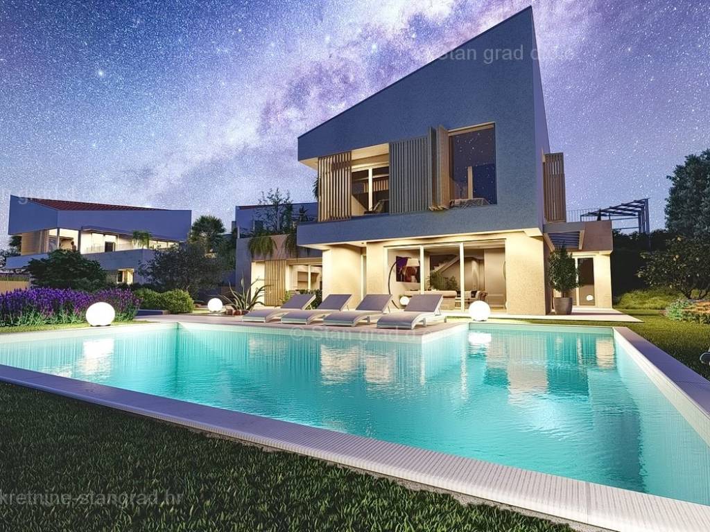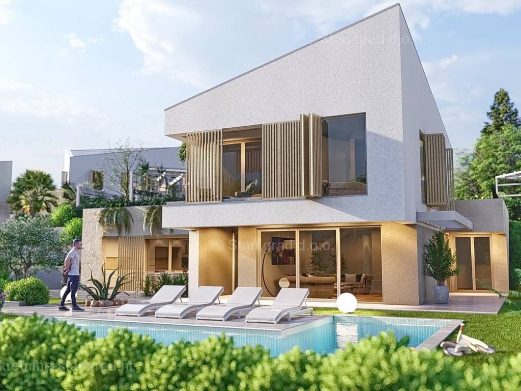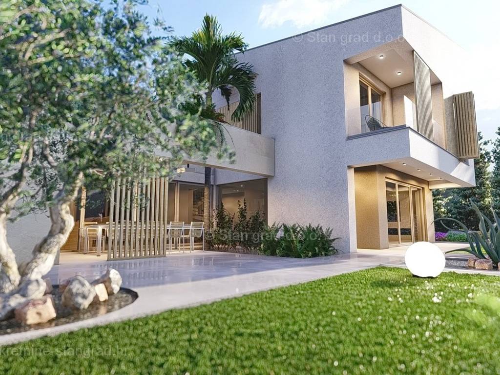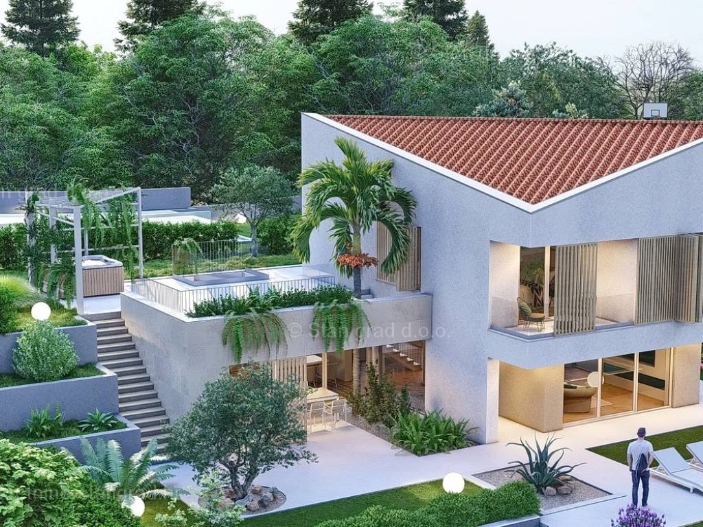 U okviru kvarnerske ponude nekretnina kod agencije Stan Grad Immobilien se prodaje ekskluzivni dizajnerski projekt - luksuzna vila smještena u sjevernojadranskoj mediteranskoj regiji otok Krk, na najvišoj točki primorskog mjesta Malinska s očaravajućim pogledom na more. Ova samostojeća vila je idealna za sve koji traže luksuzno utočište koje pruža privatnost, ne samo tijekom ljetnih mjeseci, već i tijekom cijele godine. Iznimno atraktivna građevina obuhvaća bruto površinu 200 m2 protežući se kroz ukupno 2 etaže (prizemlje i kat) pružajući ugodan životni prostor svojim vlasnicima. Prizemlje karakterizira otvoreni koncept prostrane kuhinje s blagovaonicom i dnevnog boravka okruženog staklenom stijenom iz kojeg se pruža pogled na vanjsku natkrivenu terasu s ljetnom kuhinjom i bazen. Također u prizemlju se nalazi jedna luksuzno opremljena spavaća soba, kupaonica i ostava. Unutarnje stubište vodi na kat ove impresivne građevine gdje se nalaze dvije master sobe s vlastitim kupaonicama, ostava i prostrana terasa površine 67,29 m2 na kojoj se nalazi sunčalište i jacuzzi. Dodanu vrijednost ovom cijelom objektu daje pomno dizajnirana okućnica oplemenjena bazenom od 40 m2 i sunčalištem, terasom s vanjskom kuhinjom što sve zajedno čini prostor idealan za vanjska okupljanja i uživanja na suncu. Vila se nalazi u sklopu jedinstvenog resorta koji se sastoji od 5 vila te je bitno napomenuti da će vlasnici na korištenje imati teniski teren, košarkaški teren, teren za mini golf, open gym, dječji park te boćalište. Objekt i prostrana okućnica ove prestižne nekretnine omogućavaju parkiranje više vozila, osiguravajući praktičnost i udobnost za vlasnike i njihove goste. Predmetna je kuća u vlasništvu fizičke obveze i kod prijenosa vlasništva podliježe obračunu poreza na promet nekretnina u visini 3%. Prodavatelj garantira brz prijenos vlasničkih prava te urednu vlasničku i tehničku dokumentaciju. Srdačno vas očekujemo na otoku Krku. Odlučite li se za nas, naš stručni tim će vam sa zadovoljstvom pomoći kod prijenosa vlasništva i računa za komunalne priključke na svoje ime. Doživite luksuz, privatnost i jedinstvenost u našoj vrhunskoj vili na otoku Krku. Vaša oaza mira čeka na vas!