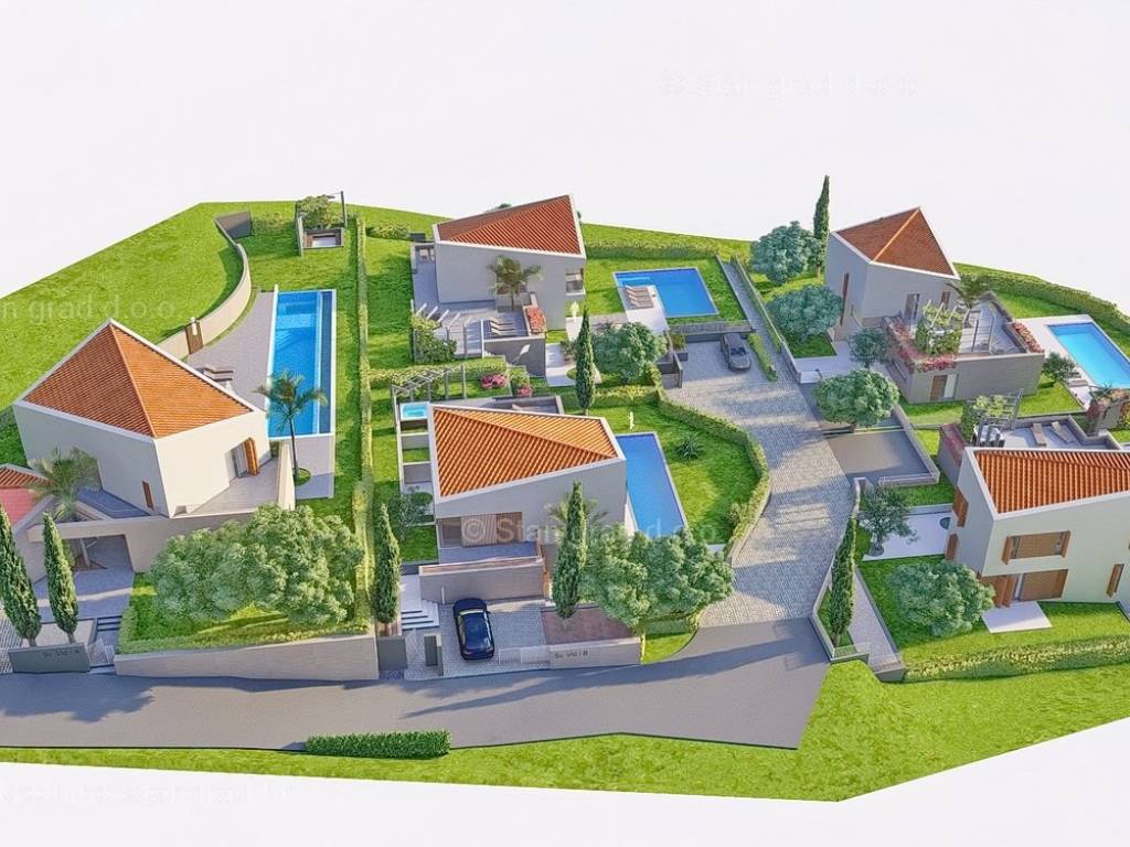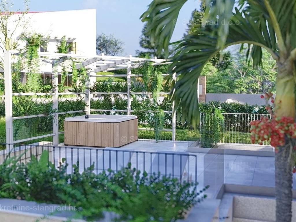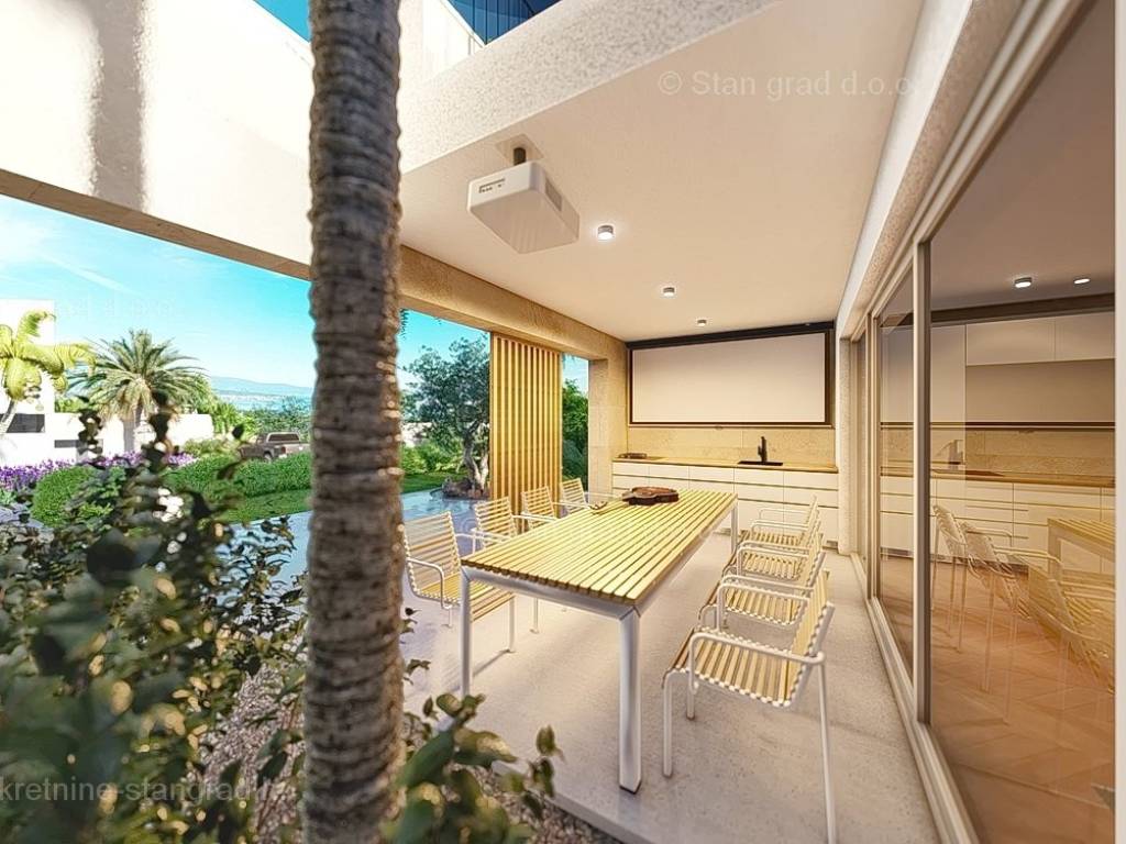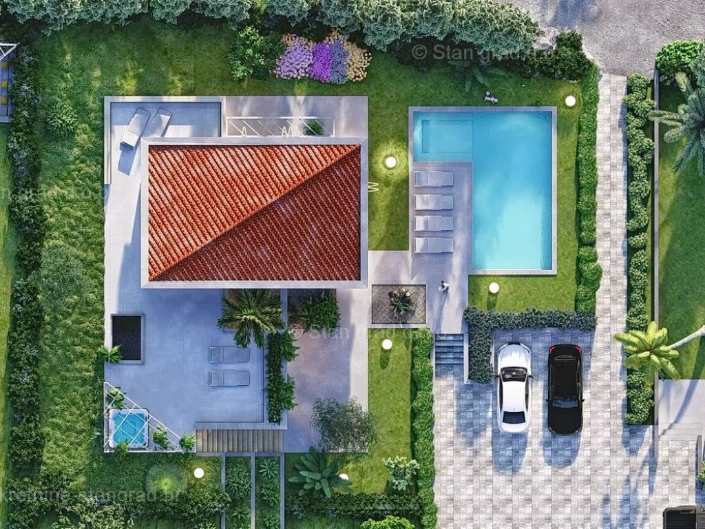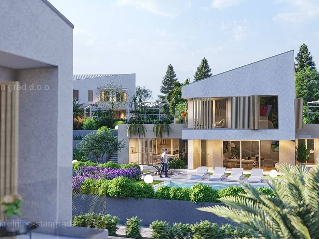 U okviru kvarnerske ponude nekretnina kod agencije Stan Grad Immobilien se prodaje ekskluzivni dizajnerski projekt - luksuzna vila smještena u sjevernojadranskoj mediteranskoj regiji otok Krk, na najvišoj točki primorskog mjesta Malinska s očaravajućim pogledom na more. Ova samostojeća vila je idealna za sve koji traže luksuzno utočište koje pruža privatnost, ne samo tijekom ljetnih mjeseci, već i tijekom cijele godine. Iznimno atraktivna građevina obuhvaća bruto površinu 200 m2 protežući se kroz ukupno 2 etaže (prizemlje i kat) pružajući ugodan životni prostor svojim vlasnicima. Prizemlje karakterizira otvoreni koncept prostrane kuhinje s blagovaonicom i dnevnog boravka okruženog staklenom stijenom iz kojeg se pruža pogled na vanjsku natkrivenu terasu s ljetnom kuhinjom i bazen. Također u prizemlju se nalazi jedna luksuzno opremljena spavaća soba, kupaonica i ostava. Unutarnje stubište vodi na kat ove impresivne građevine gdje se nalaze dvije master sobe s vlastitim kupaonicama, ostava i prostrana terasa površine 67,29 m2 na kojoj se nalazi sunčalište i jacuzzi. Dodanu vrijednost ovom cijelom objektu daje pomno dizajnirana okućnica oplemenjena bazenom od 40 m2 i sunčalištem, terasom s vanjskom kuhinjom što sve zajedno čini prostor idealan za vanjska okupljanja i uživanja na suncu. Vila se nalazi u sklopu jedinstvenog resorta koji se sastoji od 5 vila te je bitno napomenuti da će vlasnici na korištenje imati teniski teren, košarkaški teren, teren za mini golf, open gym, dječji park te boćalište. Objekt i prostrana okućnica ove prestižne nekretnine omogućavaju parkiranje više vozila, osiguravajući praktičnost i udobnost za vlasnike i njihove goste. Predmetna je kuća u vlasništvu fizičke obveze i kod prijenosa vlasništva podliježe obračunu poreza na promet nekretnina u visini 3%. Prodavatelj garantira brz prijenos vlasničkih prava te urednu vlasničku i tehničku dokumentaciju. Srdačno vas očekujemo na otoku Krku. Odlučite li se za nas, naš stručni tim će vam sa zadovoljstvom pomoći kod prijenosa vlasništva i računa za komunalne priključke na svoje ime. Doživite luksuz, privatnost i jedinstvenost u našoj vrhunskoj vili na otoku Krku. Vaša oaza mira čeka na vas!