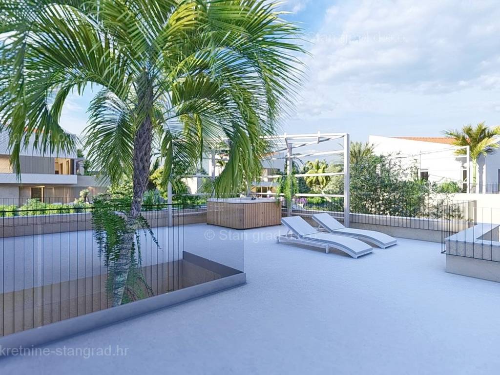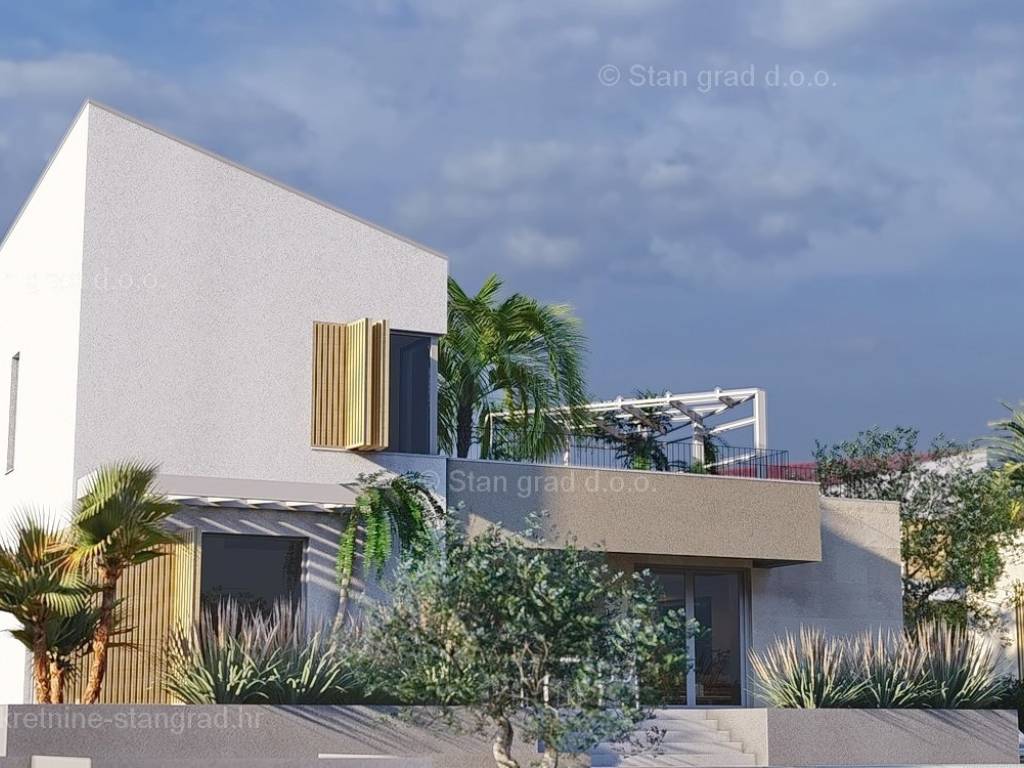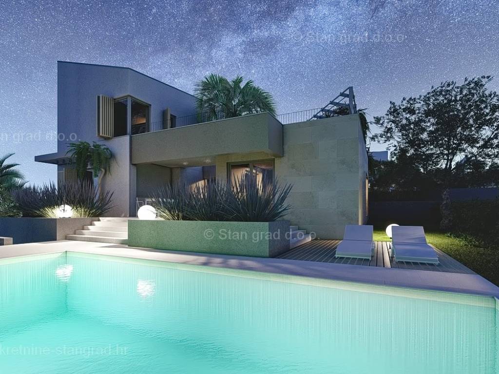 U okviru kvarnerske ponude nekretnina kod agencije Stan Grad Immobilien se prodaje ekskluzivni dizajnerski projekt - luksuzna vila smještena u sjevernojadranskoj mediteranskoj regiji otok Krk, na najvišoj točki primorskog mjesta Malinska s očaravajućim pogledom na more. Ova samostojeća vila je idealna za sve koji traže luksuzno utočište koje pruža privatnost, ne samo tijekom ljetnih mjeseci, već i tijekom cijele godine. Iznimno atraktivna građevina obuhvaća bruto površinu 279 m2 protežući se kroz ukupno 3 etaže (podrum, prizemlje i kat) pružajući ugodan životni prostor svojim vlasnicima. U podrumu se nalazi prostor koji je pomno osmišljen a uključuje teretanu, kupaonicu, dodatni wc i spremište. Prizemlje karakterizira otvoreni koncept prostrane kuhinje s blagovaonicom i dnevnog boravka okruženog staklenom stijenom iz kojeg se pruža pogled na vanjsku natkrivenu terasu i bazen. Također u prizemlju se nalaze dvije luksuzno opremljene master spavaće sobe s vlastitim kupaonicama i izlazom na terasu. Unutarnjim stubištem dolazi se na kat ove impresivne građevine gdje su smještene dodatne master spavaće sobe s vlastitim kupaonicama, ostava i prostrana terasa površine 72,23 m2 na kojoj se nalaze sunčalište i jacuzzi. Dodanu vrijednost ovom cijelom objektu daje pomno dizajnirana okućnica oplemenjena bazenom od 32 m2 i sunčalištem, terasom s vanjskom kuhinjom što sve zajedno čini prostor idealan za vanjska okupljanja i uživanja na suncu. Vila se nalazi u sklopu jedinstvenog resorta koji se sastoji od 5 vila te je bitno napomenuti da će vlasnici na korištenje imati teniski teren, košarkaški teren, teren za mini golf, open gym, dječji park te boćalište. Objekt i prostrana okućnica ove prestižne nekretnine omogućavaju parkiranje više vozila, osiguravajući praktičnost i udobnost za vlasnike i njihove goste. Predmetna je kuća u vlasništvu fizičke obveze i kod prijenosa vlasništva podliježe obračunu poreza na promet nekretnina u visini 3%. Prodavatelj garantira brz prijenos vlasničkih prava te urednu vlasničku i tehničku dokumentaciju. Srdačno vas očekujemo na otoku Krku. Odlučite li se za nas, naš stručni tim će vam sa zadovoljstvom pomoći kod prijenosa vlasništva i računa za komunalne priključke na svoje ime. Doživite luksuz, privatnost i jedinstvenost u našoj vrhunskoj vili na otoku Krku. Vaša oaza mira čeka na vas!
