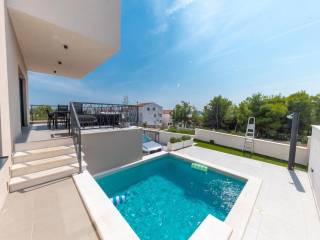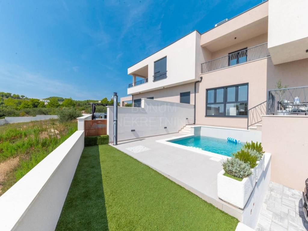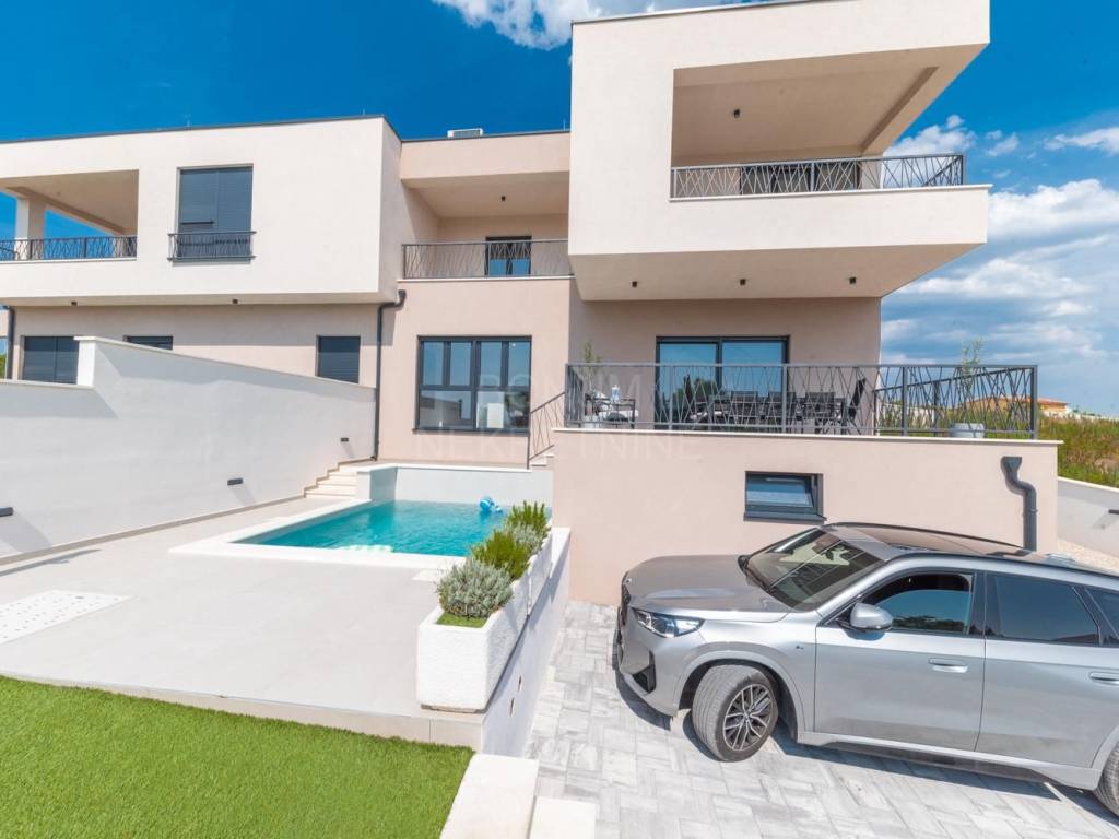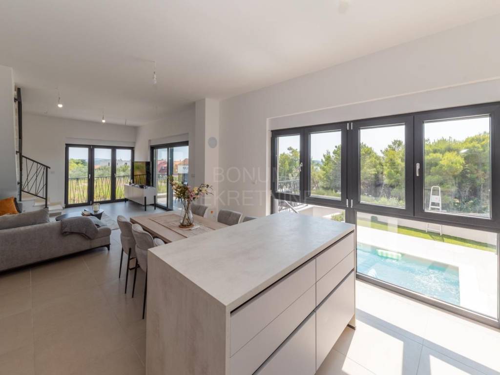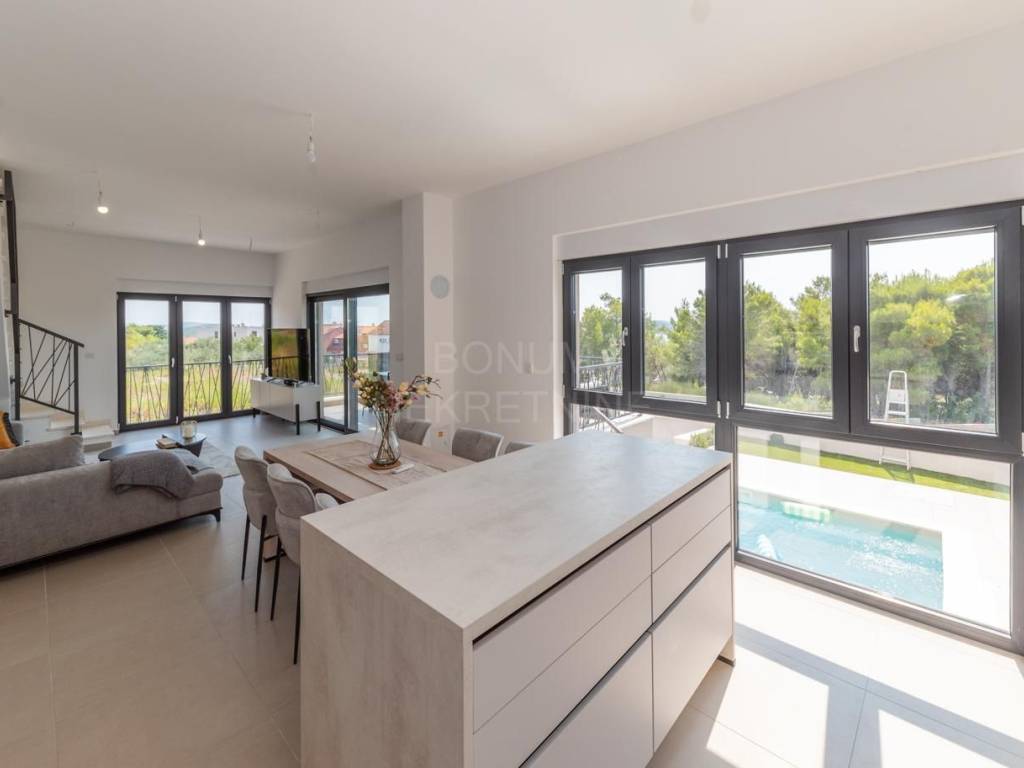 Prodaje se vrhunska moderna kuća s privatnim bazenom i panoramskim pogledom na more, smještena na idealnoj lokaciji u Vodicama, samo nekoliko minuta hoda od plaže i centra grada.