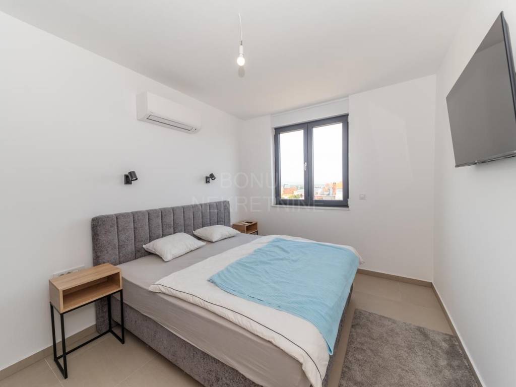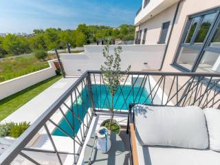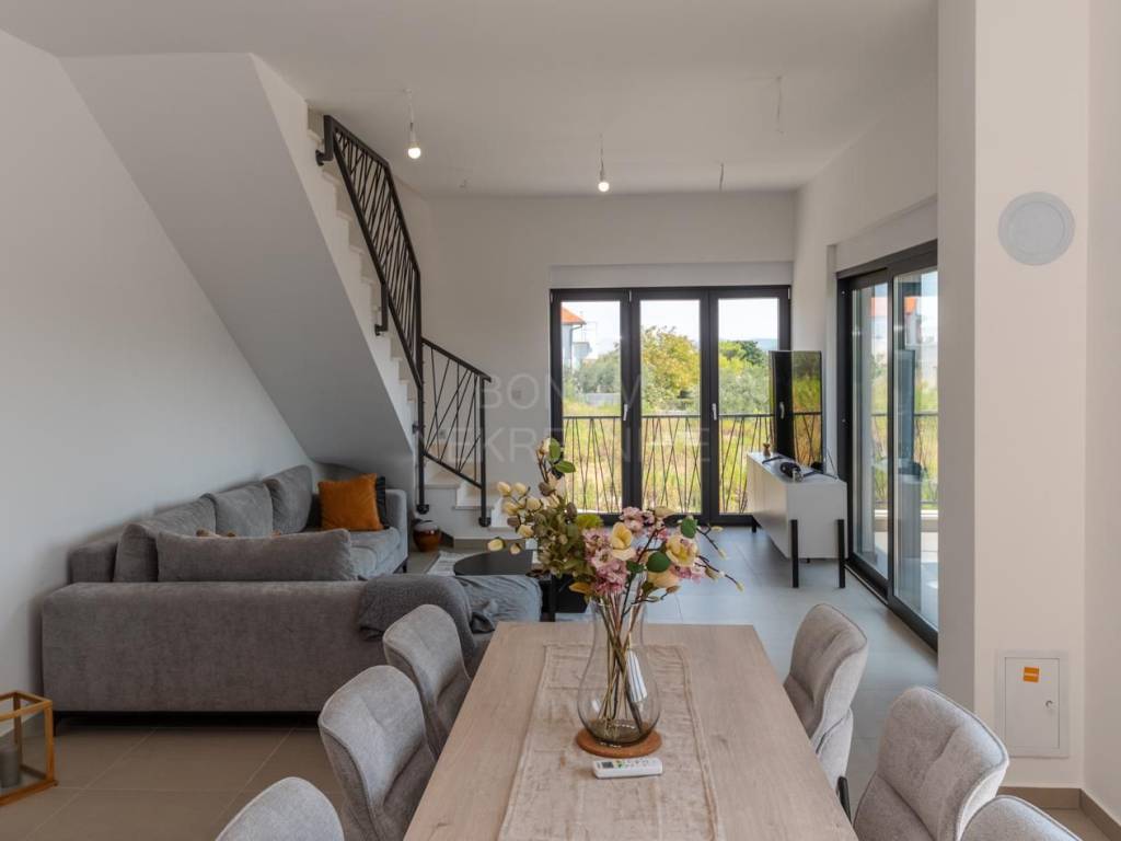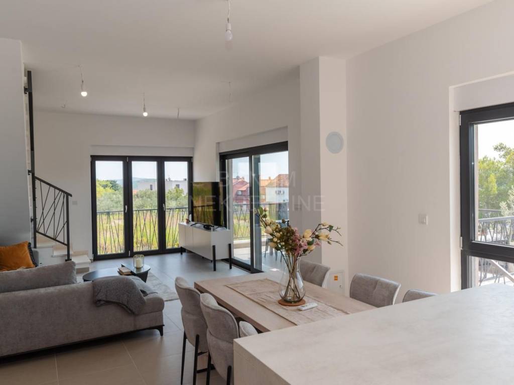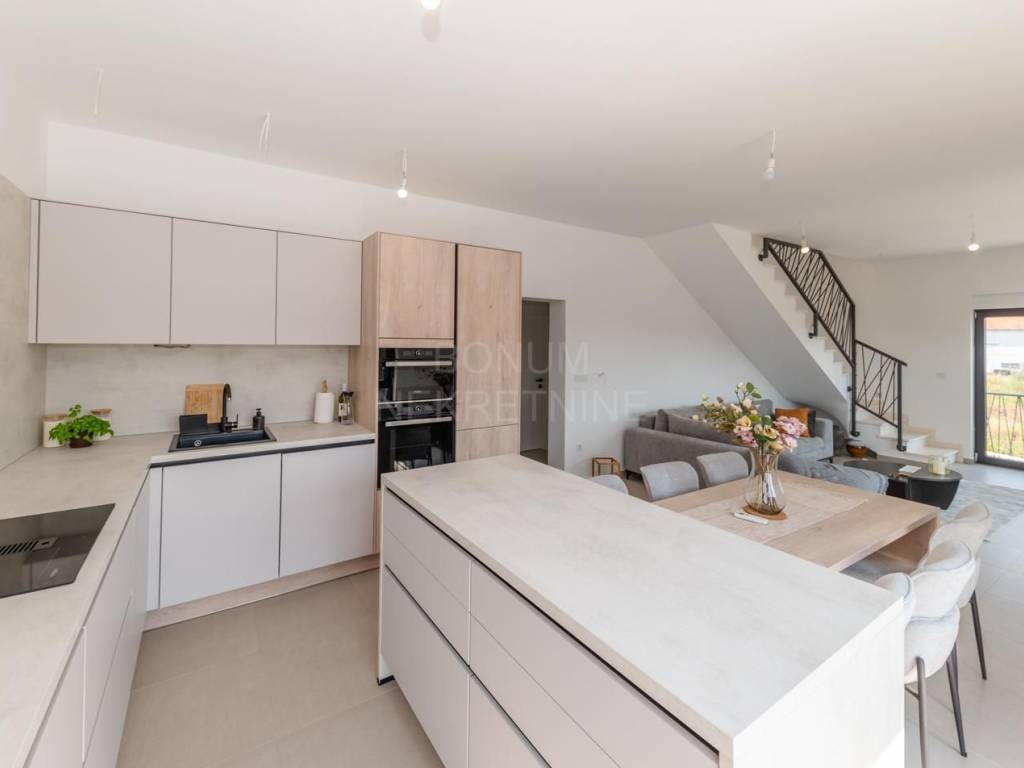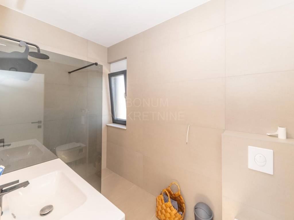 Kuća je opremljena visokokvalitetnom ALU stolarijom s komarnicima i roletama, keramičkim podovima vrhunske kvalitete, dizalicom topline i klima uređajima u svakoj prostoriji. Staklene ograde na terasama doprinose modernom izgledu, dok pažljivo uređeni vrt osigurava ugodnu atmosferu za boravak na otvorenom.