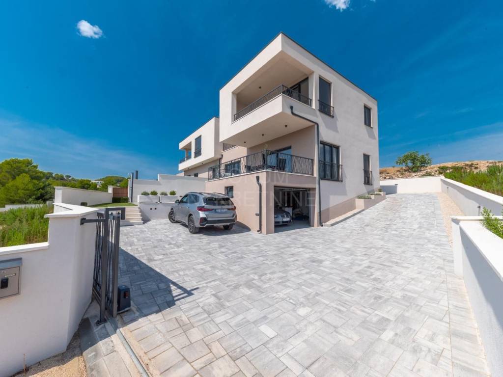 Ova atraktivna nekretnina, udaljena 750 metara od mora i 700 metara od srca Vodica, ali i 1 kilometar od Tribunja, nudi savršenu kombinaciju mira i pristupačnosti svim potrebnim sadržajima. Kuća, koja se proteže na tri etaže s ukupno 193,81 m² stambene površine, nudi sve što vam je potrebno za kvalitetan luksuzan i opuštajući život.