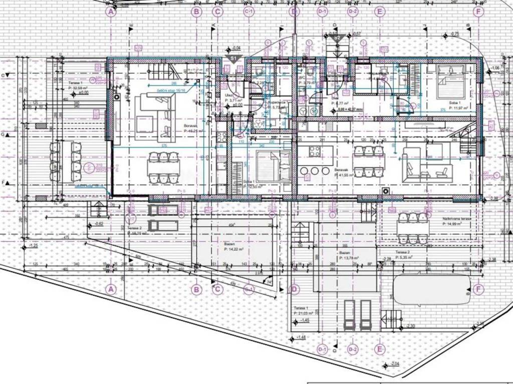 Prizemlje kuće ima zaseban ulaz s protuprovalnim vratima, a unutar njega nalazi se prostrani open space dnevni boravak s blagovaonicom, koji pruža prekrasan pogled na more. Na ovoj etaži nalazi se i moderna kuhinja, toalet, kupaonica te jedna spavaća soba. Dnevni boravak i blagovaonica imaju direktan izlaz na dvije terase s pogledom na jug i bazen površine 13,78 m².