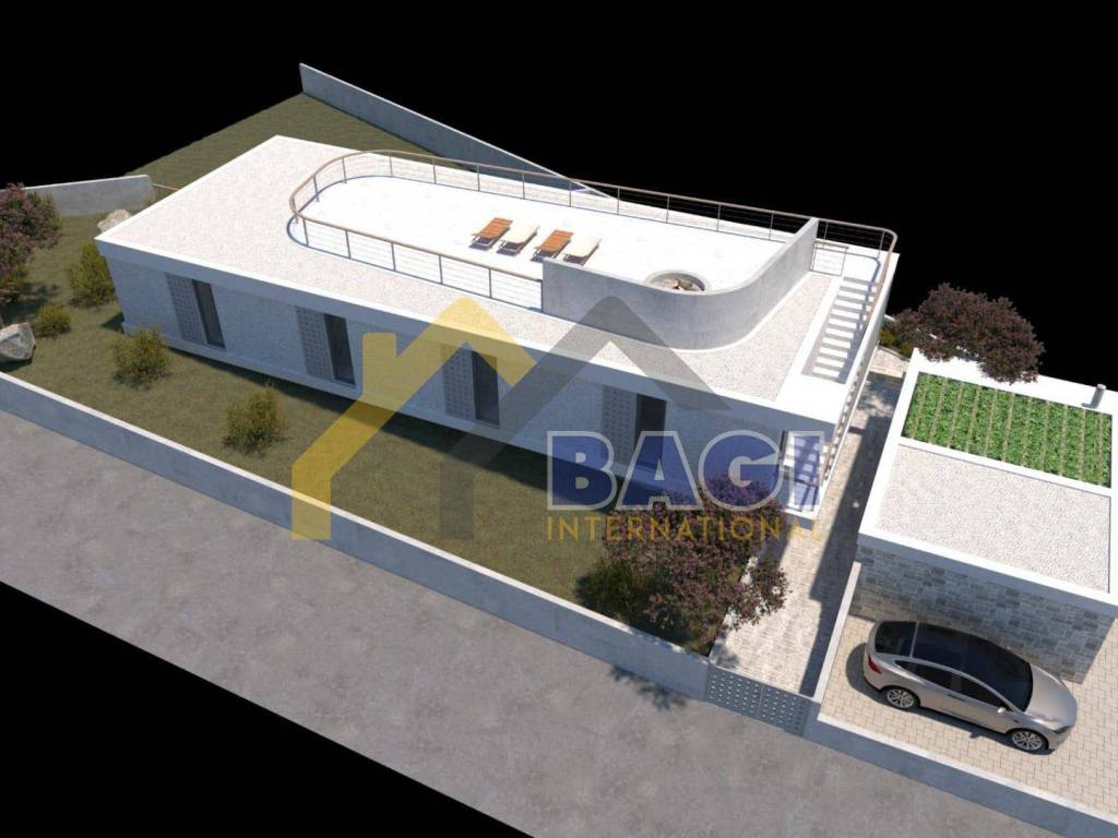 Na gornjem katu nalaze se četiri spavaće sobe, svaka s vlastitom kupaonicom, a sve sobe dijele zajednički balkon. Dodatni prostor nudi krovna terasa s nevjerojatnim panoramskim pogledom na more.