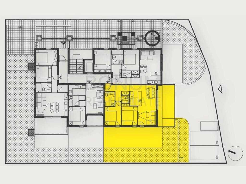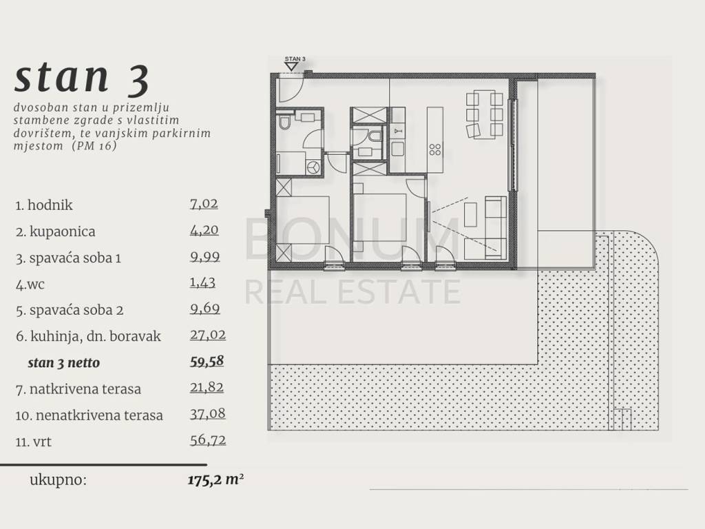S3- sastoji se od hodnika, kuhinje, dnevnog boravka i blagovaone u jednoj cjelini, dvije spavaće sobe, toaleta( 59.58 m2), dijelom natkrivene terase( 58.90 m2), vrt od 56.72 m2 te vanjsko parkirno mjesto.