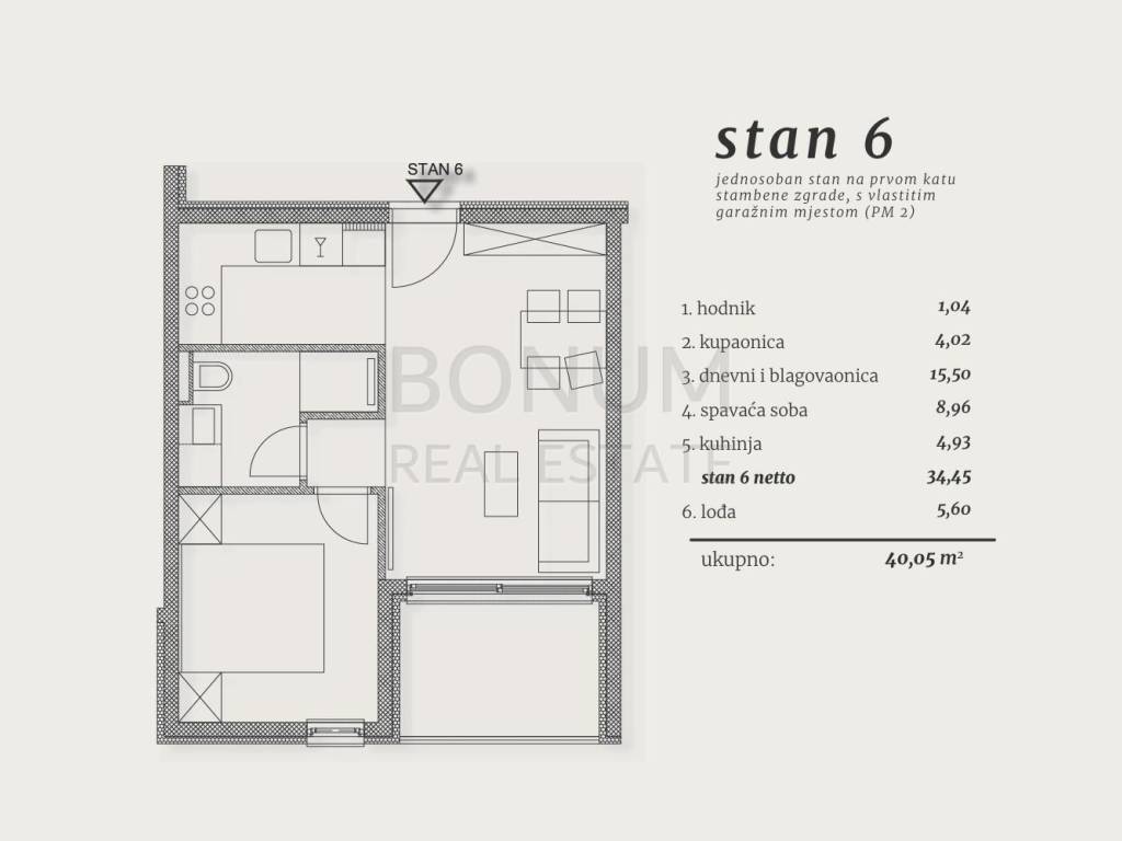 S6- sastoji se od hodnika, kuhinje, dnevnog boravka i blagovaone u jednoj cjelini, jedne spavaće sobe, kupaone, ( 34.45 m2), lođe( 5.60 m2) te garažnog mjesta.