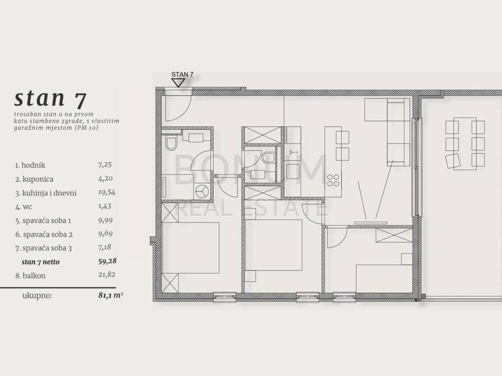 S7- sastoji se od hodnika, kuhinje, dnevnog boravka i blagovaone u jednoj cjelini, tri spavaće sobe, kupaone, toaleta ( 59.28 m2), balkona( 21.82 m2) te garažnog mjesta.