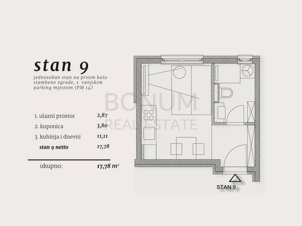 S9- sastoji se od ulaznog prostora, kuhinje, dnevnog boravka i blagovaone u jednoj cjelini te kupaone, ( 17.78 m2), te vanjskog parkirnog mjesta.