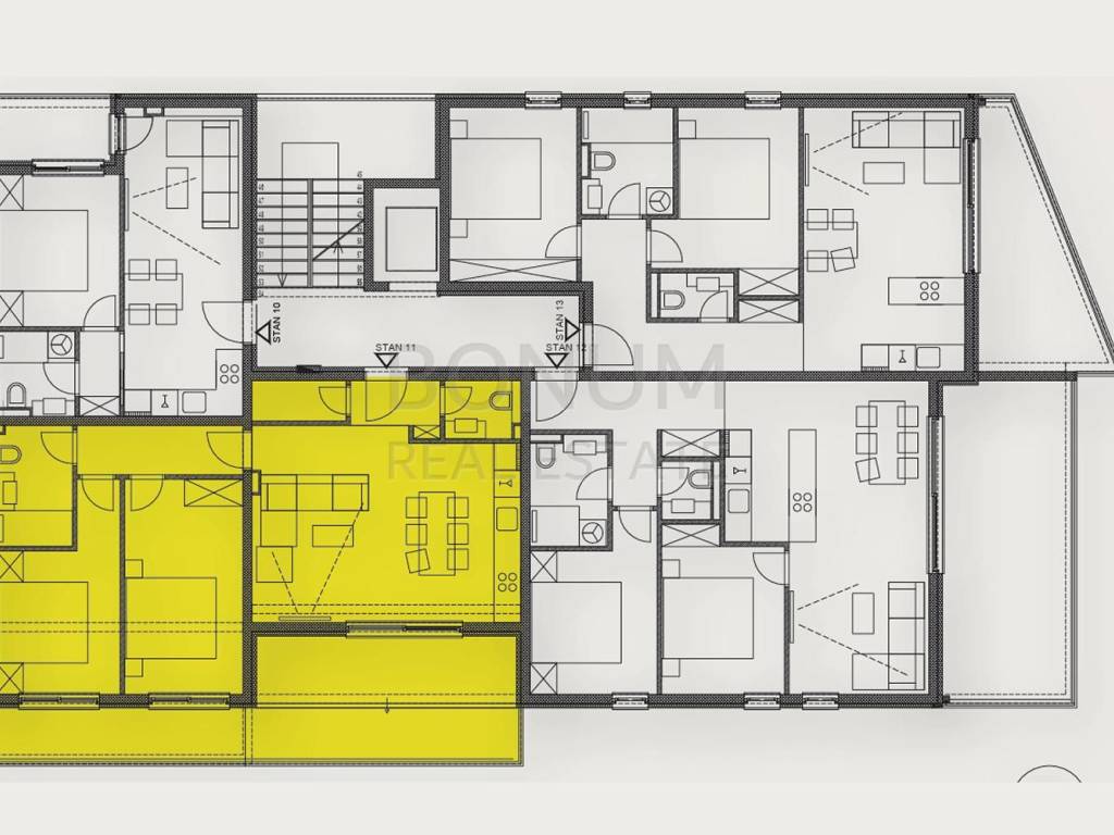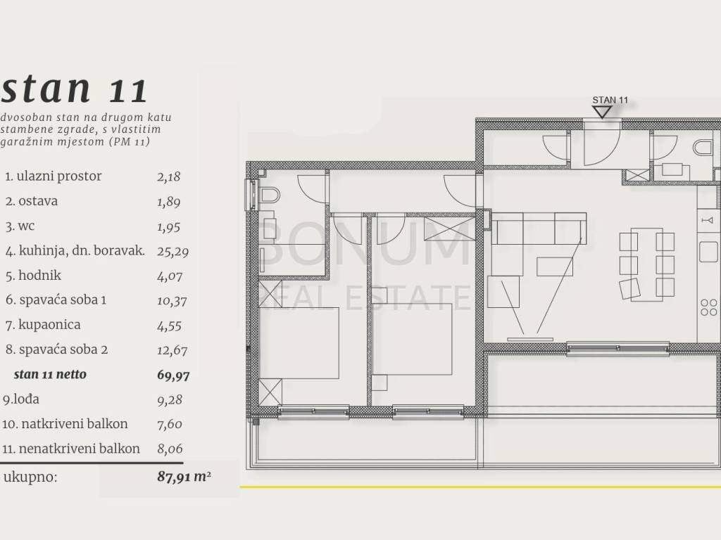 S11- sastoji se od hodnika, kuhinje, dnevnog boravka i blagovaone u jednoj cjelini, dvije spavaće sobe, kupaone, toaleta, ostave ( 69.97 m2), dijelom natkrivenog balkona( 24.94 m2) te garažnog mjesta.