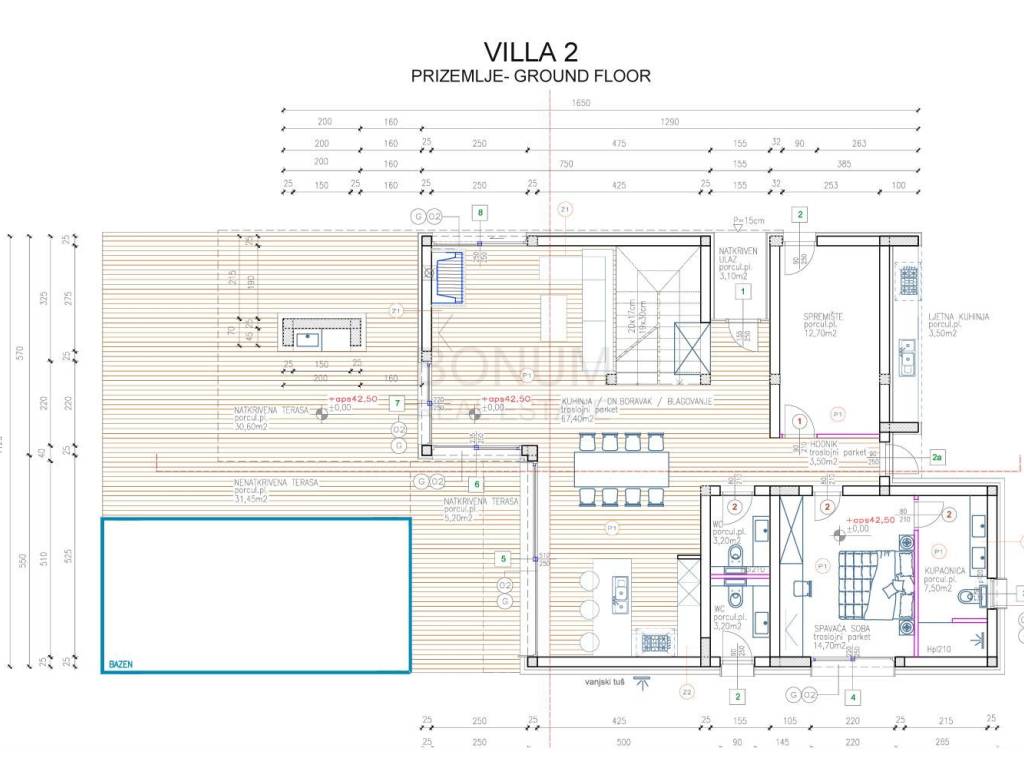 Prizemlje obuhvaća dnevni dio s prostranim dnevnim boravkom, kuhinjom i blagovaonicom u jednoj cjelini. Prizemlje također nudi elegantnu master sobu s kupaonicom. Velike vanjske terase, dva dodatna toaleta te veliko spremište upotpunjuju udobnost ovog etažnog dijela. Ispred je prekrasna bazen s dvorištem.