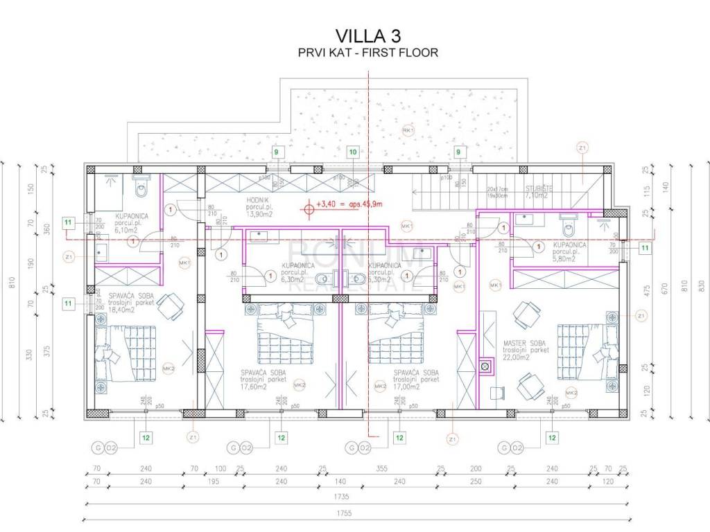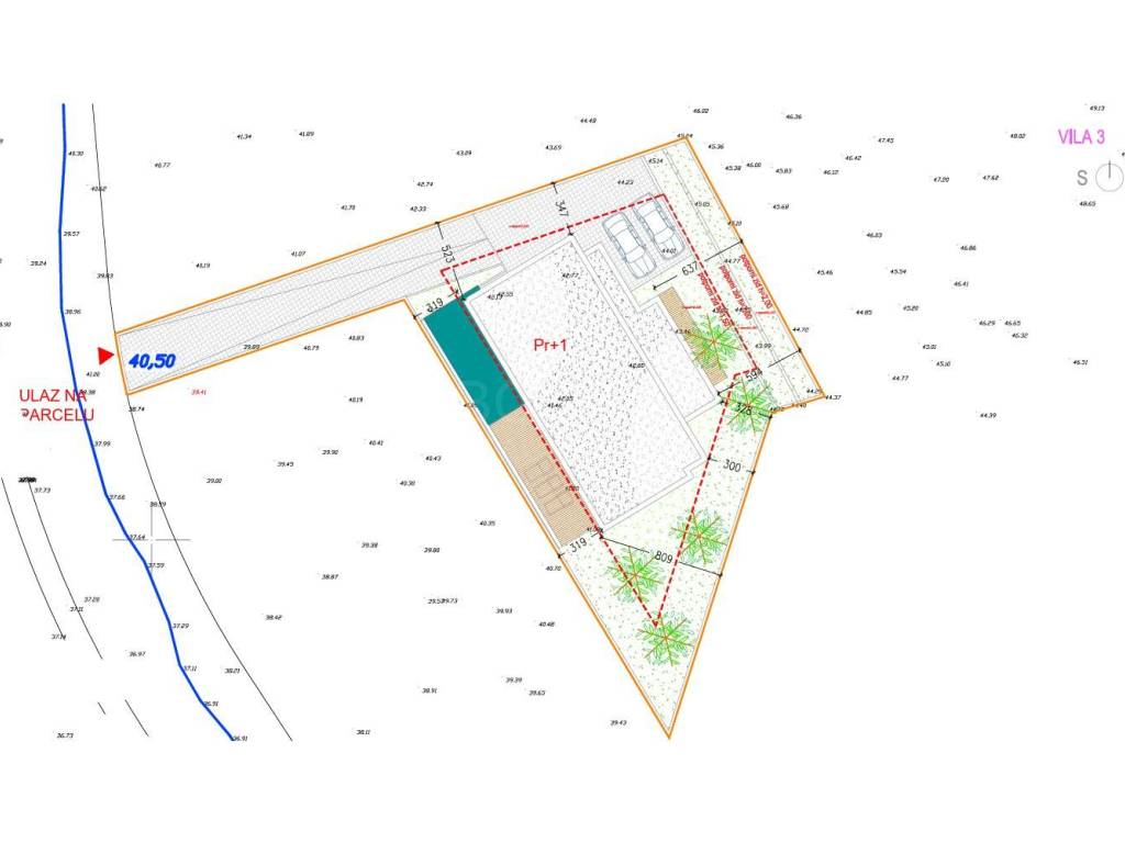 Površina građevinske parcele ove vile iznosi 613 m2, a ukupna neto površina iznosi 215,01 m2.