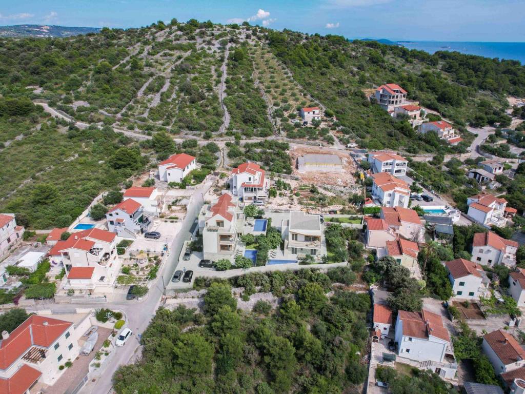 Zgrada je dizajnirana u tradicionalnom dalmatinskom mediteranskom stilu, s modernim standardima. Ima kosi krov s "Mediteran" crijepom, skrivene odvode, kamene detalje, kovane ograde te vrt s autohtonim biljkama (masline, lovor, ružmarin). Građena je prema najvišim standardima protupotresne zaštite, buke, požara i energetske učinkovitosti (termo fasada od kamene vune 10 cm, dvostruka stakla s termoizolacijskim plinom). Oprema stana uključuje klimatizaciju (Mitsubishi inverterski multi split sustav), električno podno grijanje, električne rolete, talijanske keramičke pločice te sanitarije i kupaonsku opremu marke HANSGROHE i GEBERIT. Gradnja započinje u rujnu 2024., a useljenje je planirano do jeseni 2025.