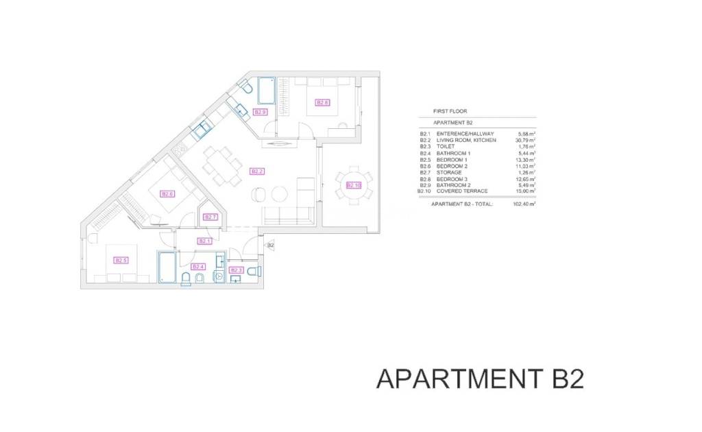 Radi se o prostranom i iznimno udobnom jednoetažnom apartmanu smještenom na prvom katu moderne zgrade. Ukupna stambena površina iznosi 102 kvadratna metra, a prostor je funkcionalno organiziran i uključuje dnevni boravak s kuhinjom i blagovaonicom, tri spavaće sobe, dvije kupaonice, dodatni toalet, spremište te terasu. Vlasnik ima pravo korištenja svih zajedničkih dijelova zgrade.