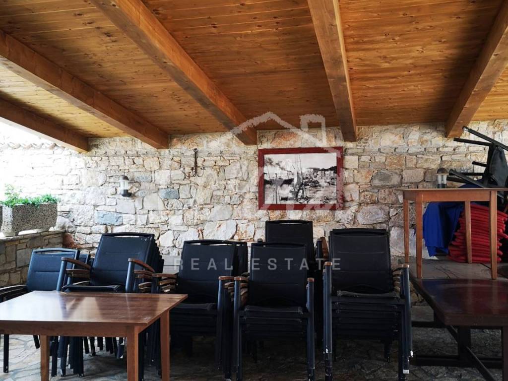 U prizemlju se nalazi restoran(istarska konoba) sa kompletno opremljenom profesionalnom kuhinjom,šankom,dvije sale sa velikim ognjištem,dva wc-a za goste,prostorije za personal sa svlačionom,wc-om i tušem,skladište za frižidere,ambalažu i sl.
