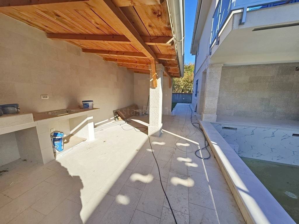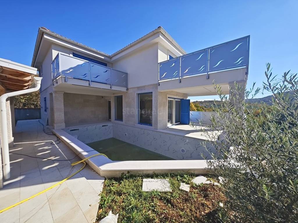 Posebnu čar ovom posjedu daje iznimno uređena okućnica koja sadržava bazen i sunčalište. Na spomenutoj okućnici nekretnine može se komforno parkirati više automobila na uređenom prostoru. Osim ranijih karakteristika, važno je kazati kuća ima lijep pogled na more i priobalje.