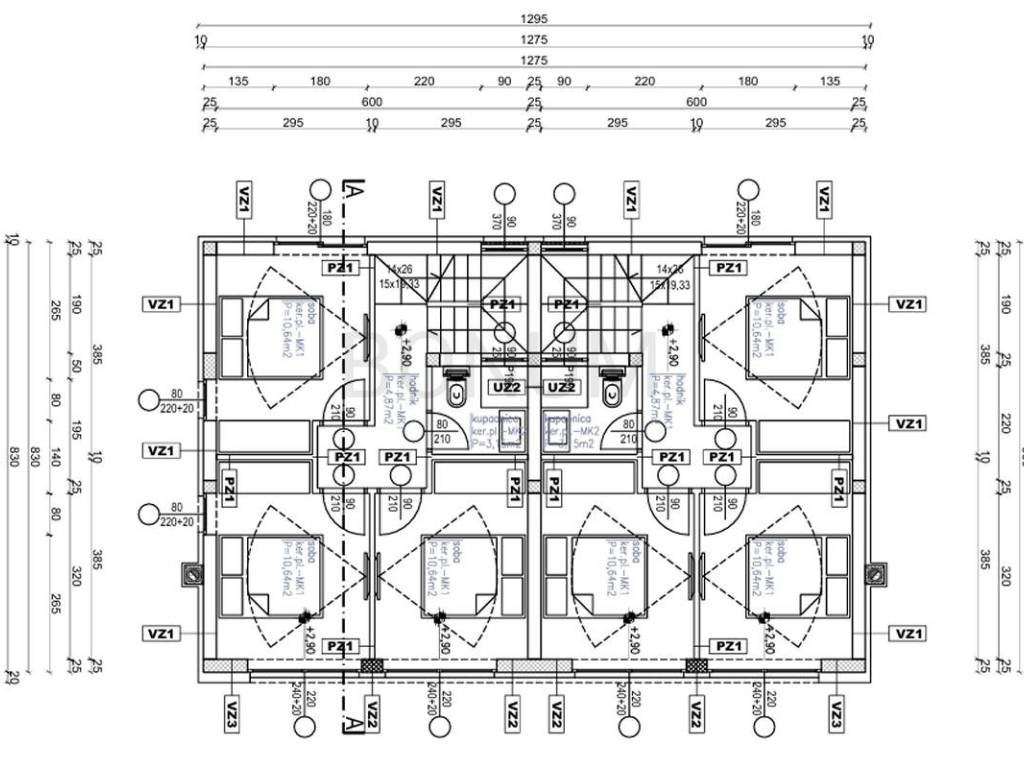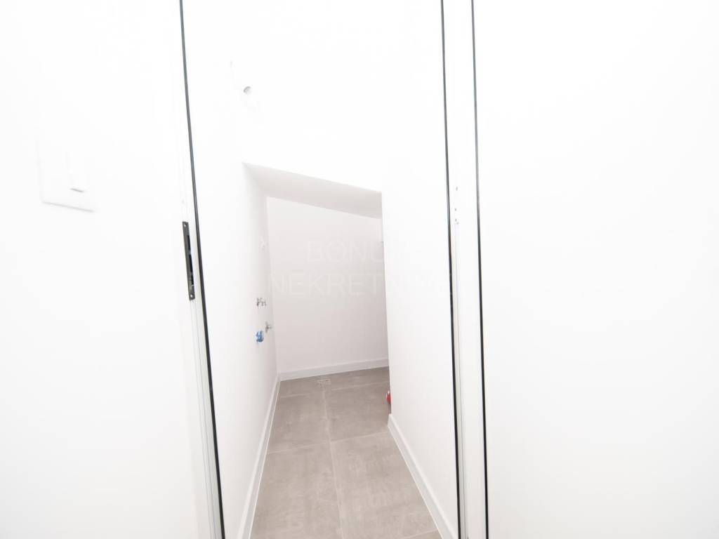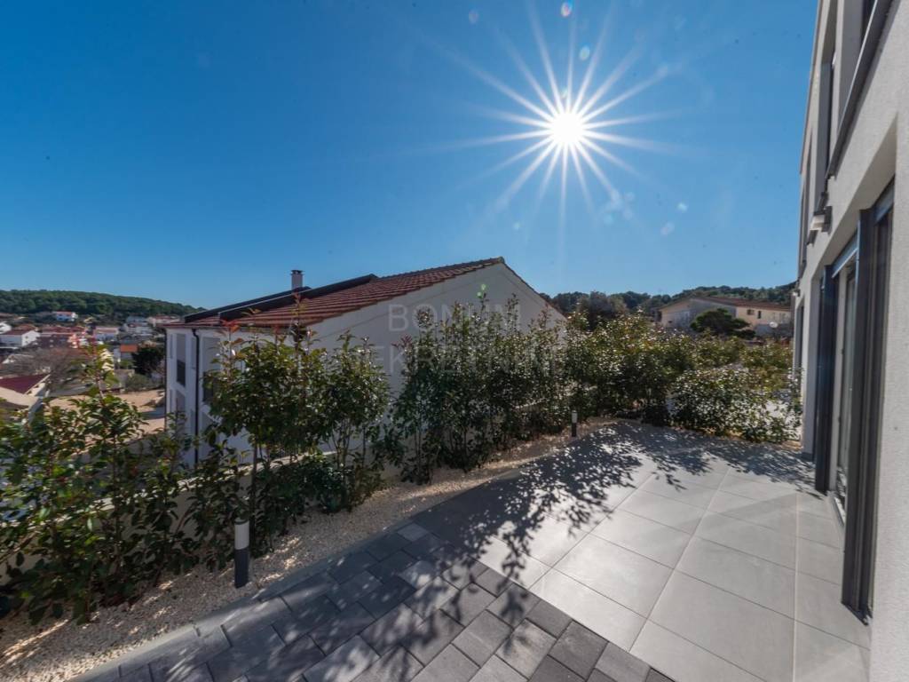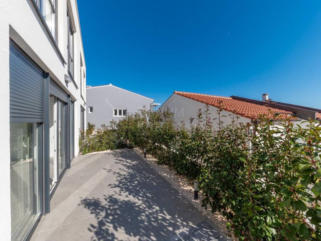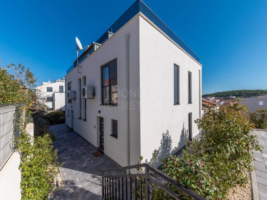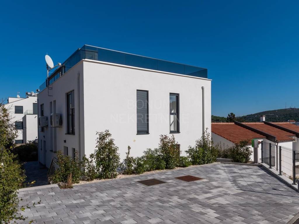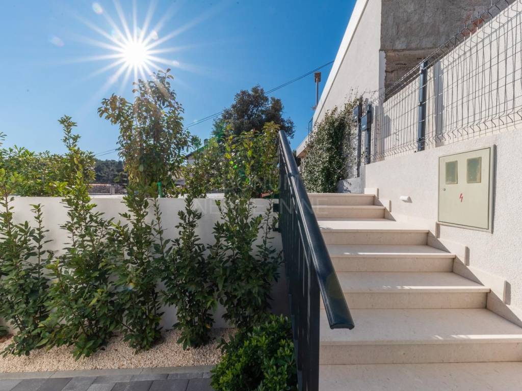 Prizemlje se sastoji od hodnika, kupaonice, spremišta te prostranog dnevnog boravka s kuhinjom i blagovaonicom, koji imaju izlaz na terasu i pripadajuće dvorište. Na prvom katu smještene su tri spavaće sobe, kupaonica i hodnik, dok se na drugom katu nalazi velika krovna terasa površine 24,50 m² s koje se pruža lijepi pogled na more.