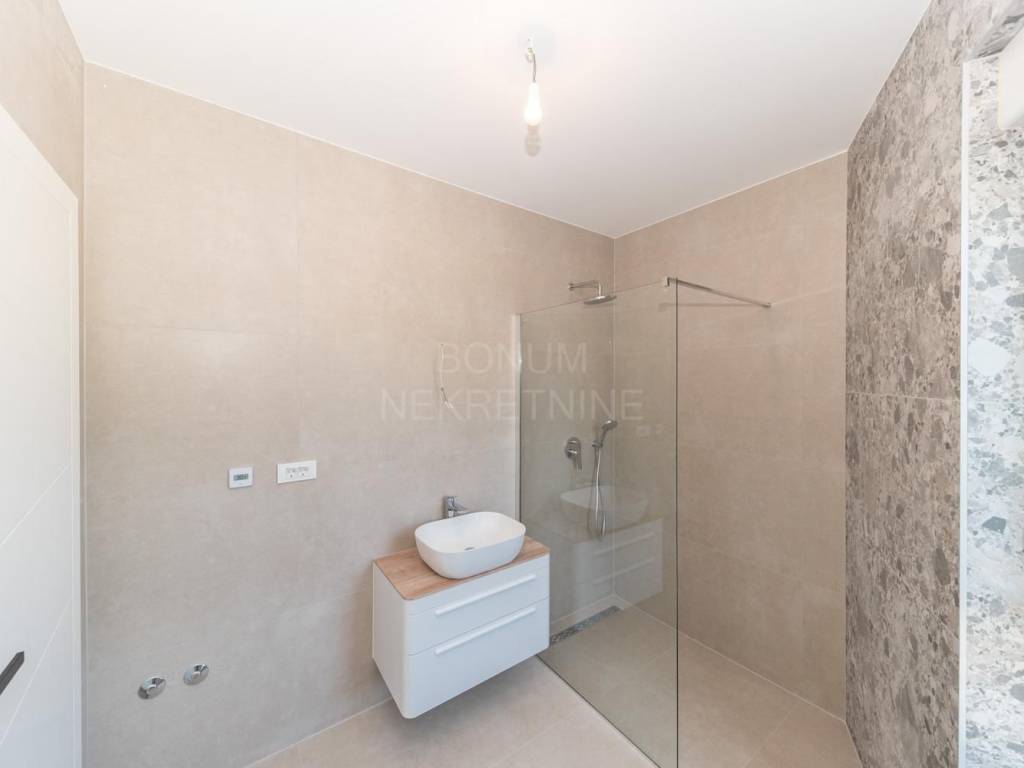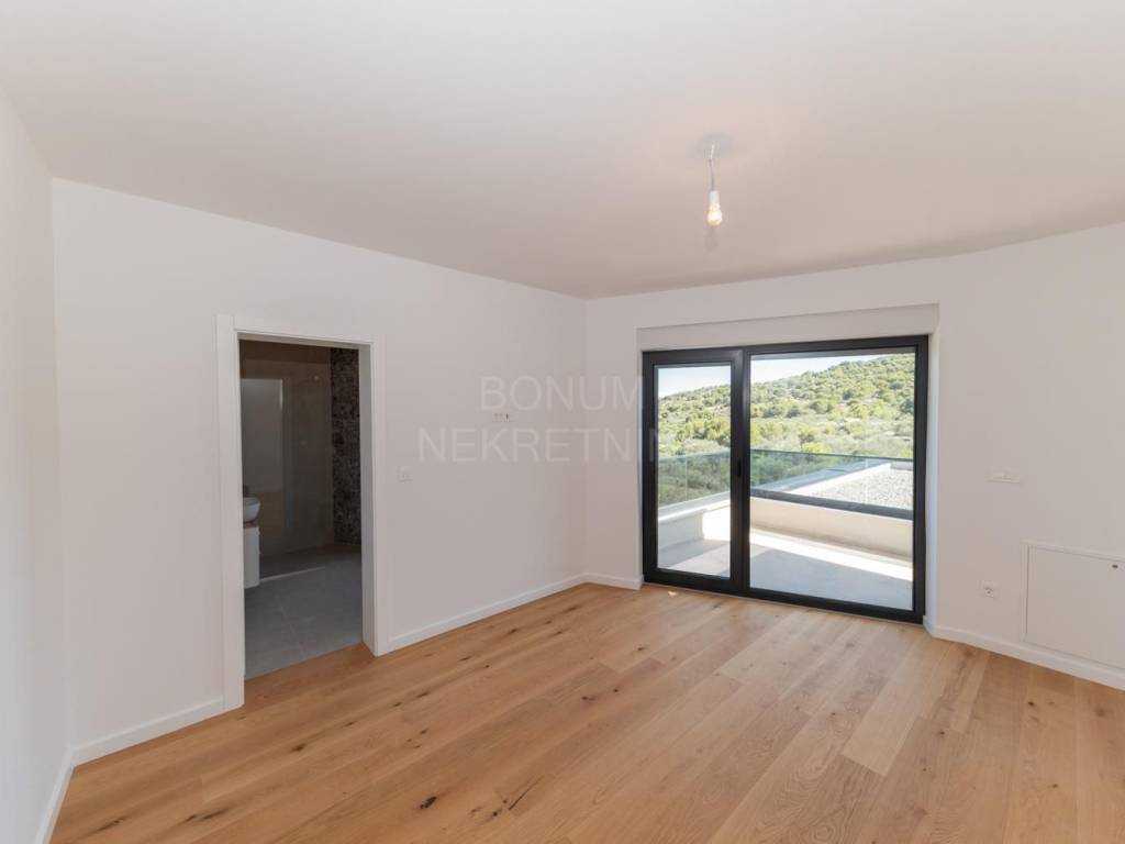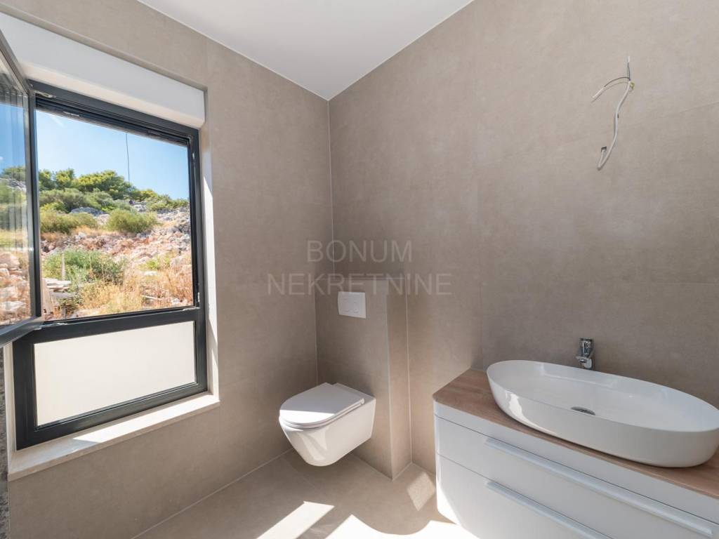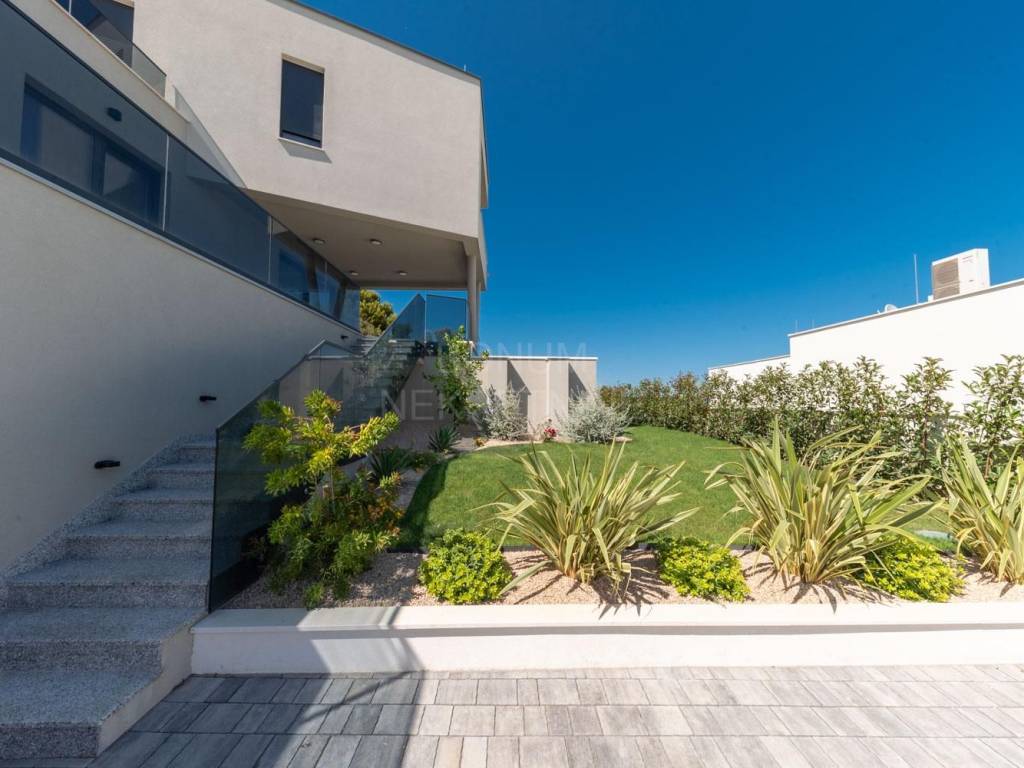 Prostire se na uređenom zemljištu od 650 m2 i raspoređena je na tri prostrane etaže. U suterenu se nalazi velika garaža, vešeraj te dodatni prostor za spremište. Unutarnjim stepeništem dolazi se do prizemlja gdje se smjestio prozračan dnevni boravak povezan s kuhinjom i blagovaonicom otvorenog koncepta, idealan za druženja i opuštanje. Iz dnevnog boravka izlazi se na prostranu terasu s bazenom, savršeno mjesto za uživanje u suncu i pogledu na more. Na ovoj etaži nalaze se i dvije spavaće sobe, moderna kupaonica te dodatni wc.