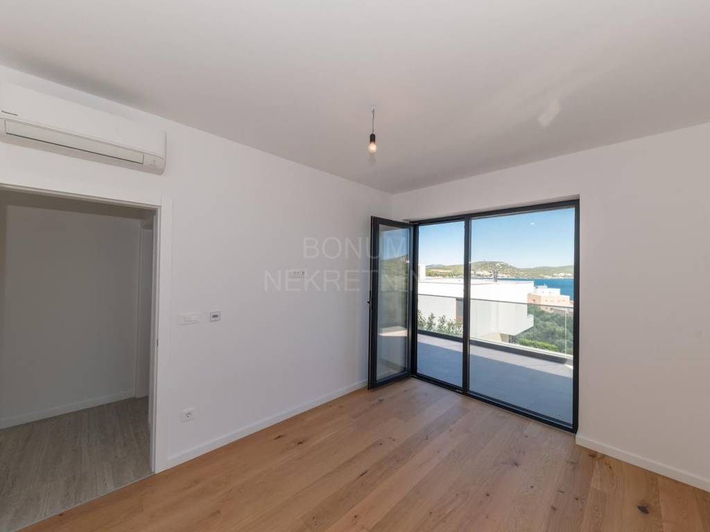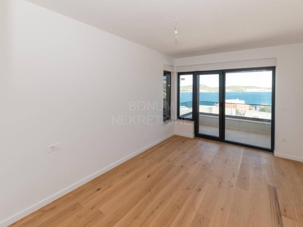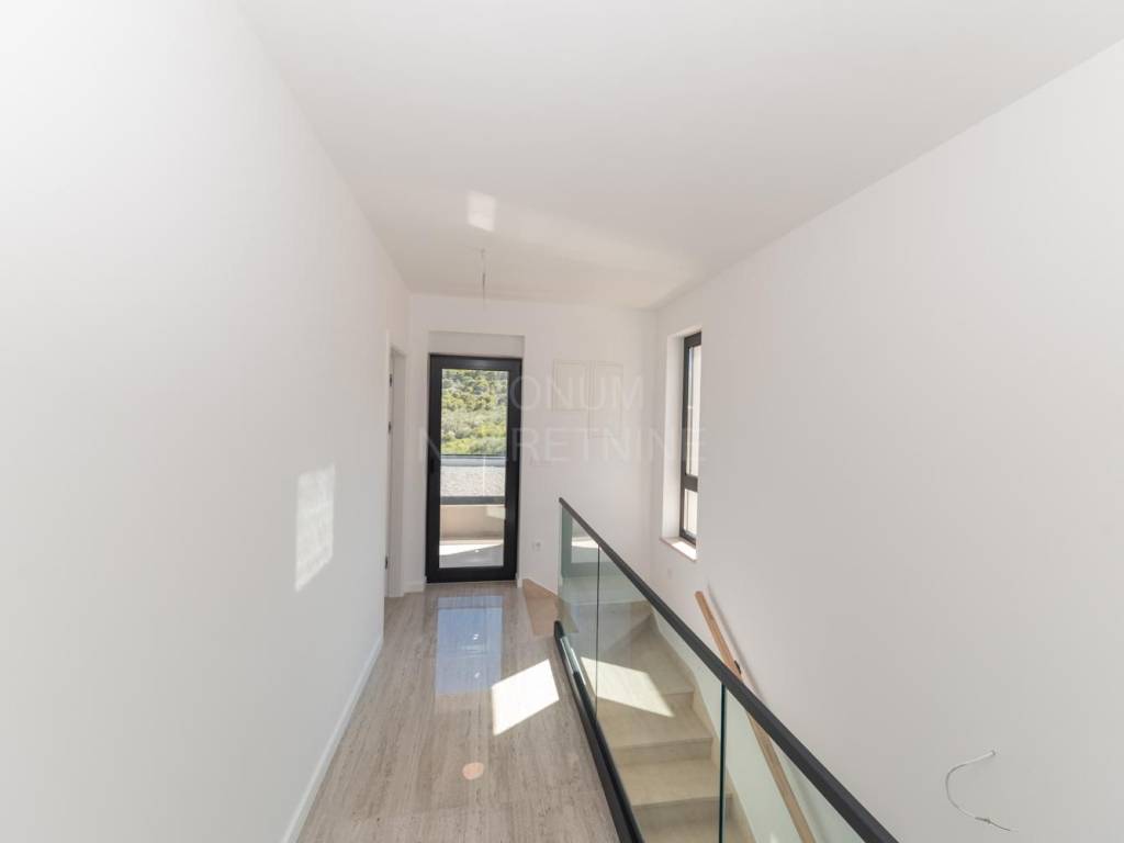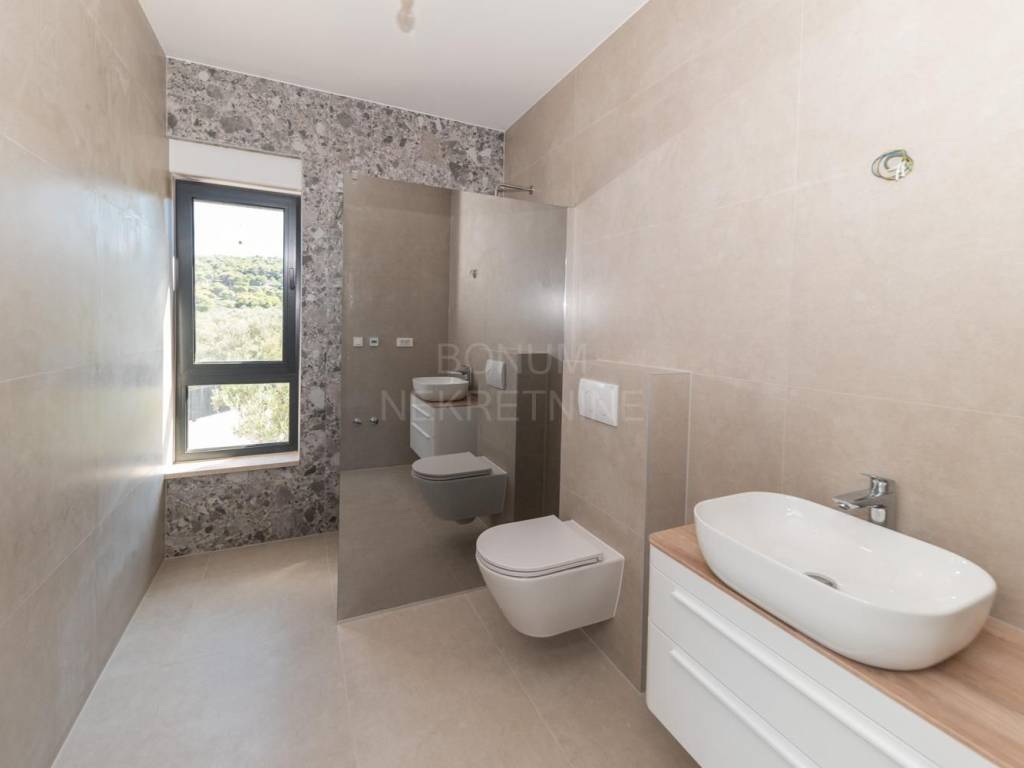 Prostire se na uređenom zemljištu od 650 m2 i raspoređena je na tri prostrane etaže. U suterenu se nalazi velika garaža, vešeraj te dodatni prostor za spremište. Unutarnjim stepeništem dolazi se do prizemlja gdje se smjestio prozračan dnevni boravak povezan s kuhinjom i blagovaonicom otvorenog koncepta, idealan za druženja i opuštanje. Iz dnevnog boravka izlazi se na prostranu terasu s bazenom, savršeno mjesto za uživanje u suncu i pogledu na more. Na ovoj etaži nalaze se i dvije spavaće sobe, moderna kupaonica te dodatni wc.