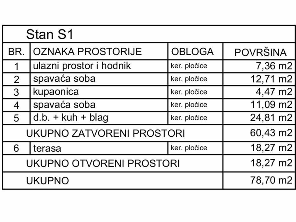 Prodaje se prostrani apartman u prizemlju S1 s dvije spavaće sobe. Ukupna površina: 78,70 m² (unutarnji dio 60,43 m² + terasa 18,27 m²).