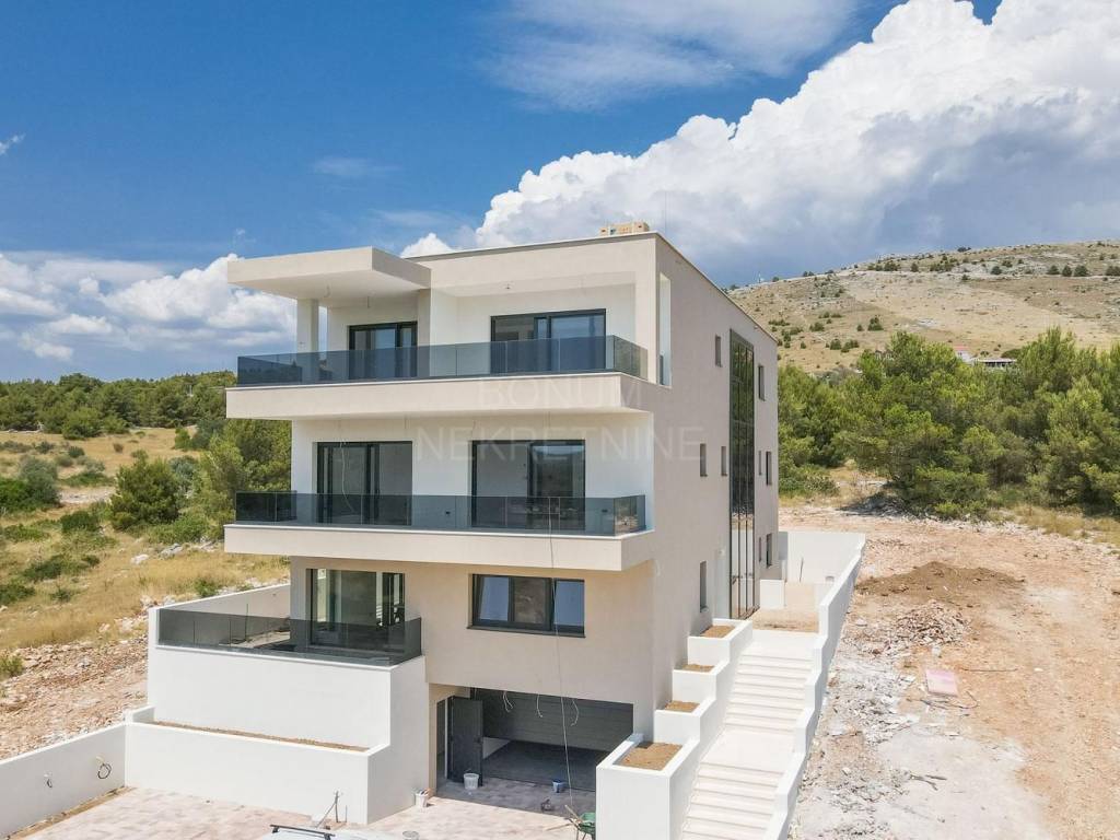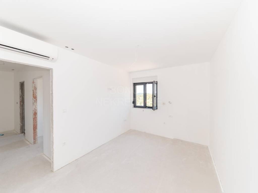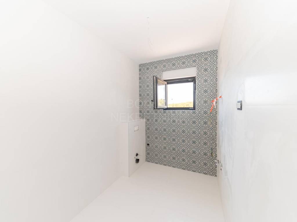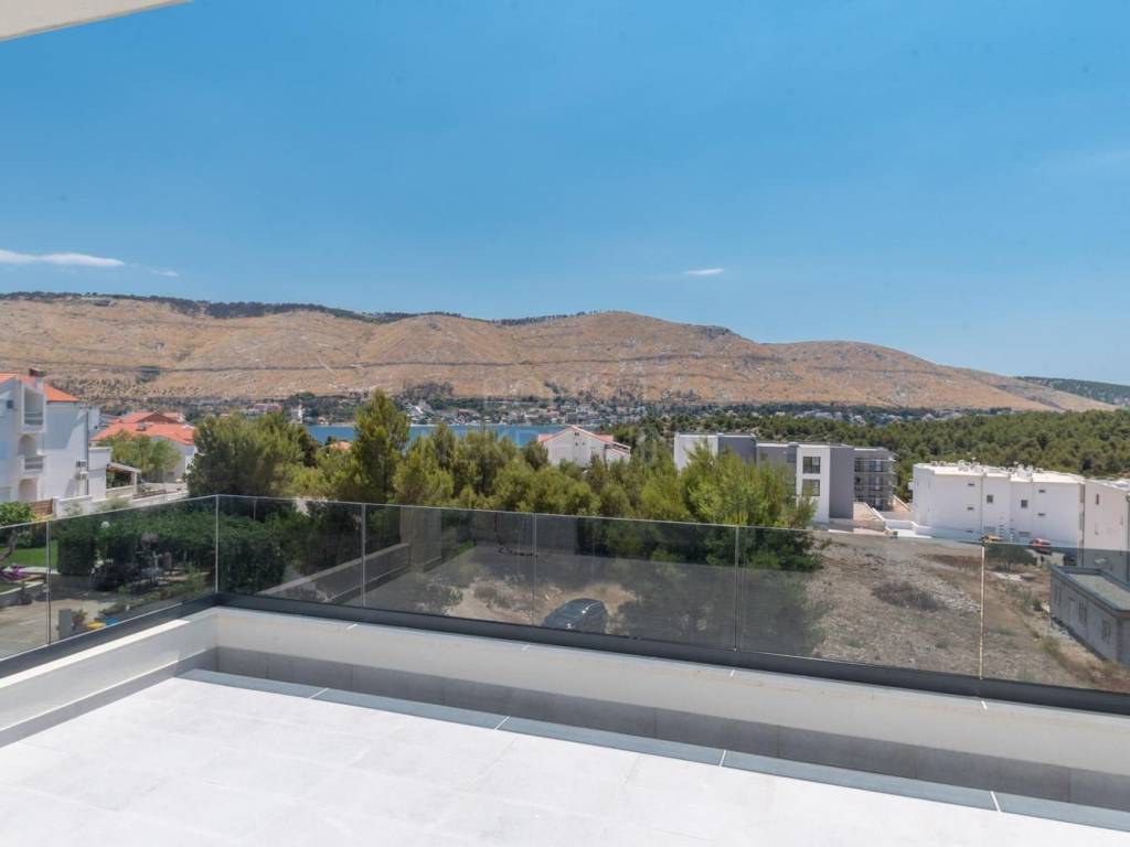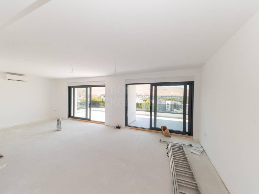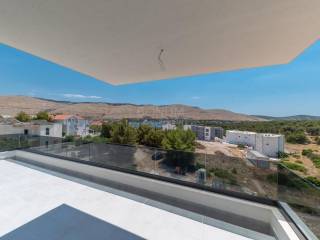 Prodaje se prostrani penthouse površine 135,45 m², smješten na drugom katu moderne novogradnje. Stan se sastoji od hodnika, prostranog dnevnog boravka (16,45 m²), kuhinje s blagovaonicom (32,55 m²), tri spavaće sobe (13,70 m², 12,65 m², 6,78 m²), dvije kupaonice (6,09 m² i 5,38 m²) te dodatnog WC-a (4,09 m²). Uz to, stan ima natkriveni balkon (15,88 m²) i nenatkriveni balkon (8,38 m²), koji pružaju predivan pogled na more. Stanu pripadaju dva garažna parkirna mjesta i spremište, a lift iz garaže vodi direktno u stan.