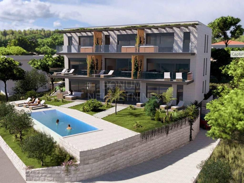 Na prvoj etaži nalazi se ulazni prostor, prostrana kuhinja s blagovaonicom i dnevnim boravkom, WC, praonica te dva nenatkrivena balkona s očaravajućim pogledom na more. Unutarnjim stubištem dolazi se na drugu etažu, gdje se nalaze tri spavaće sobe, od kojih je jedna master soba s kupaonicom i garderobom, dodatna kupaonica i još jedan balkon.