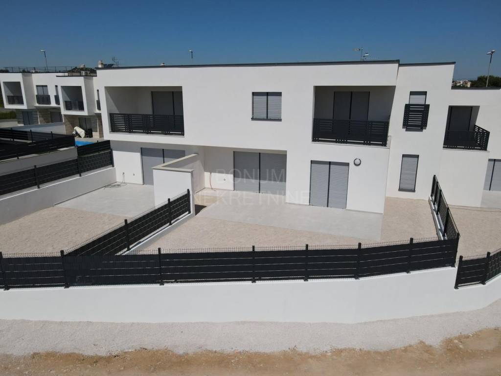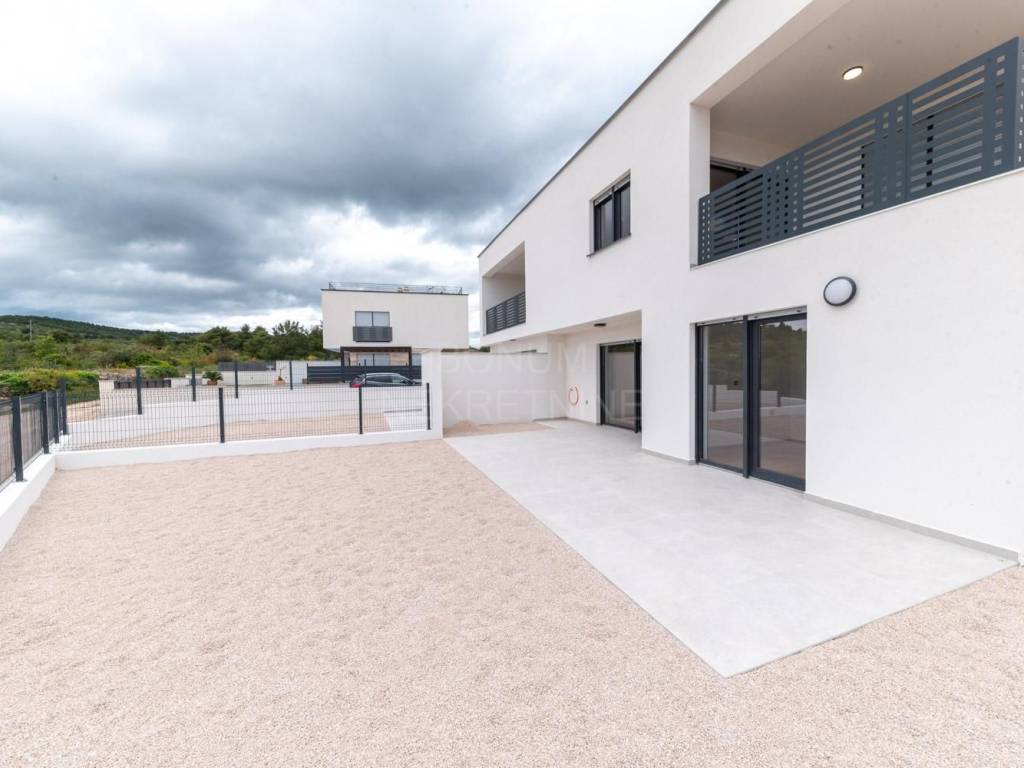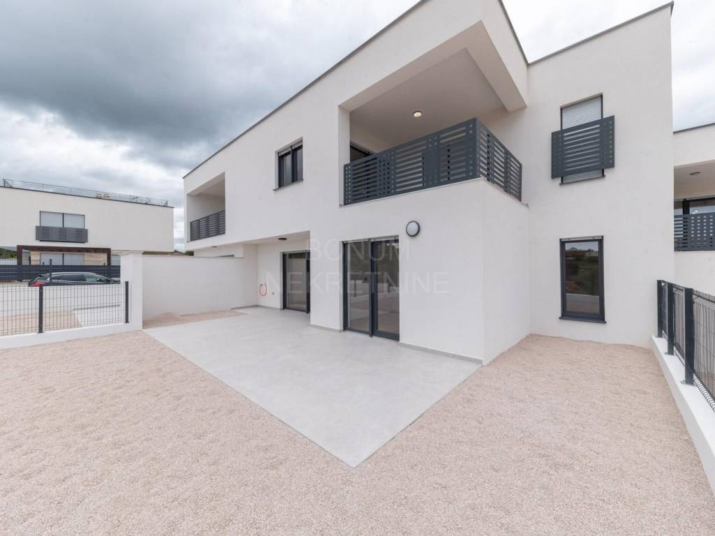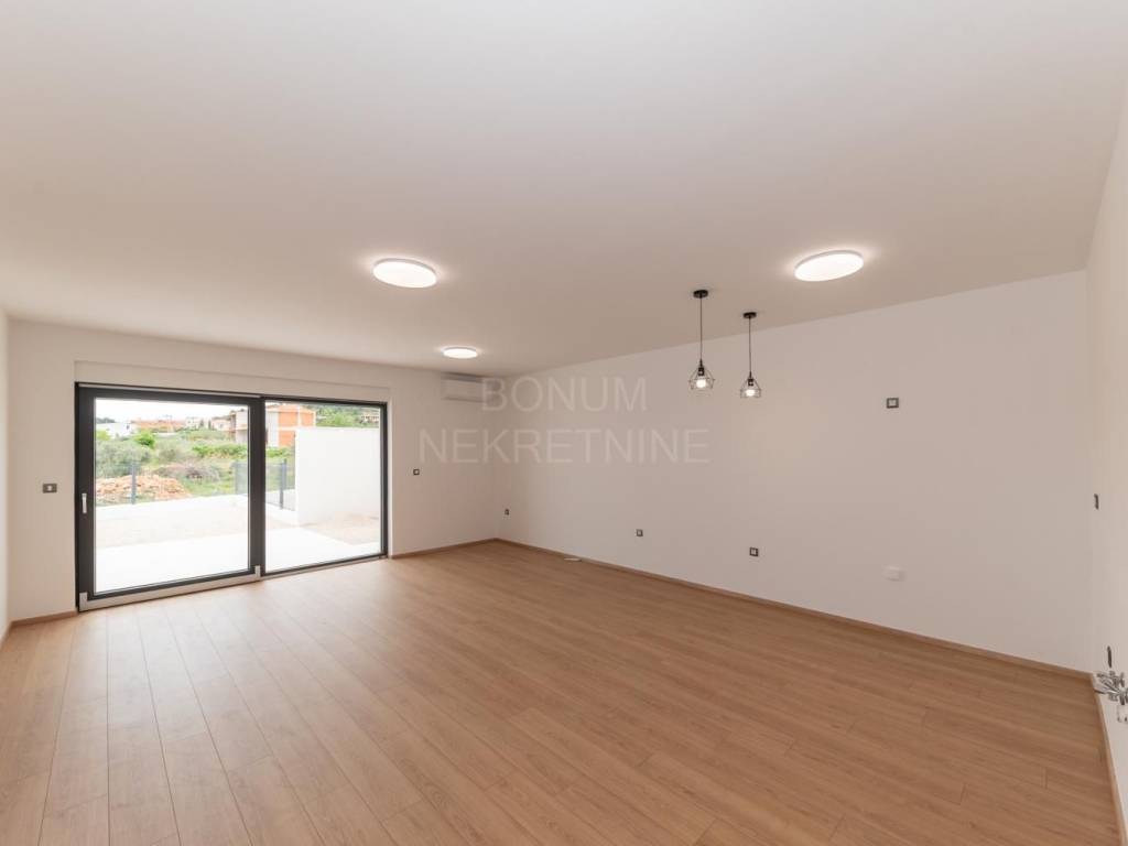 Na prodaju je apartman u prizemlju stambene zgrade u Vodicama, smješten u mirnom dijelu grada. Stan se sastoji od ulaznog prostora, dvije spavaće sobe, kupaonice, dnevnog boravka s kuhinjom i blagovaonicom te dijelom natkrivene terase koja vodi u lijepo dvorište. Ukupna neto korisna površina apartmana iznosi 75,77 m², dvorište ima 80,75 m2 te dijelom natkrivena terasa 28,72 m2. Apartman je opremljen klima uređajem, podno grijanje u kupaoni te ima funkcionalan raspored i puno prirodnog svjetla.