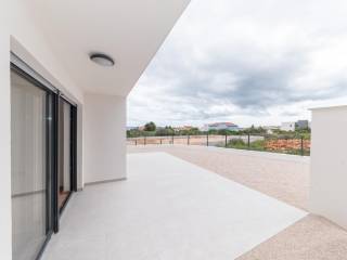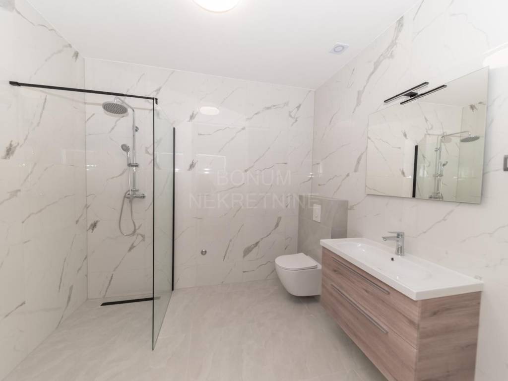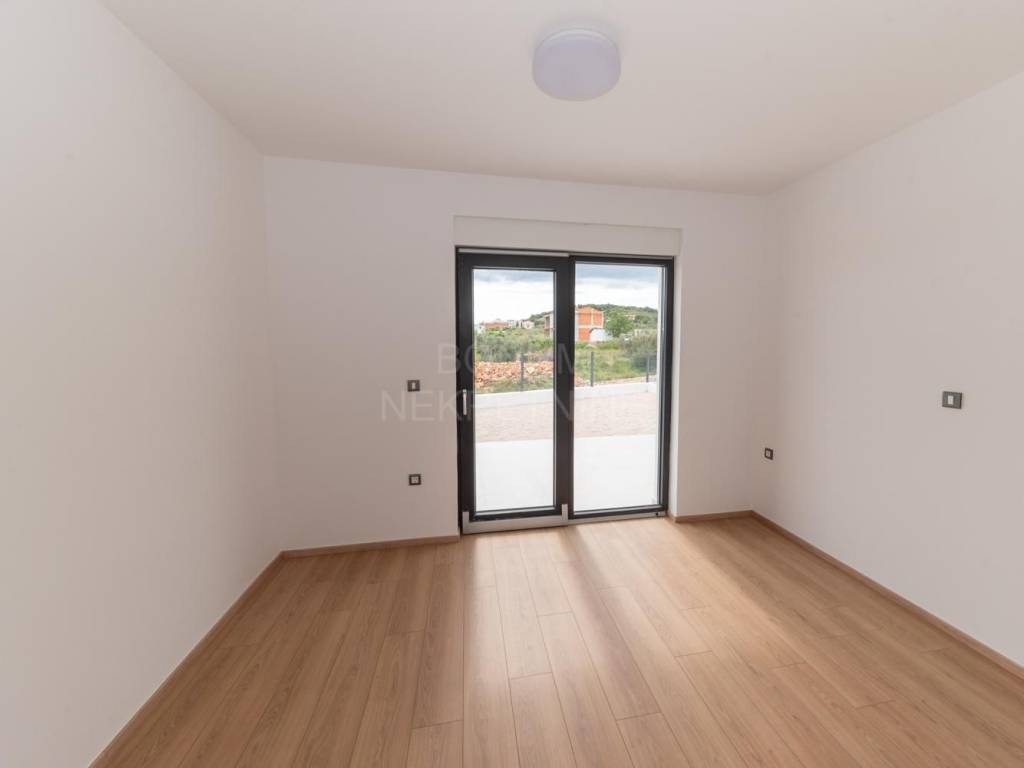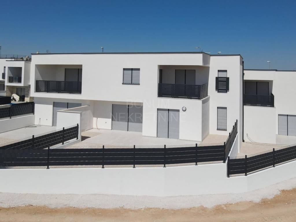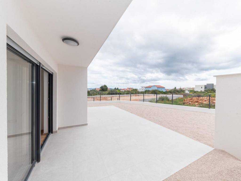 Na prodaju je apartman u prizemlju stambene zgrade u Vodicama, smješten u mirnom dijelu grada. Stan se sastoji od ulaznog prostora, dvije spavaće sobe, kupaonice, dnevnog boravka s kuhinjom i blagovaonicom te dijelom natkrivene terase koja vodi u lijepo dvorište. Ukupna neto korisna površina apartmana iznosi 75,77 m², dvorište ima 80,75 m2 te dijelom natkrivena terasa 28,72 m2. Apartman je opremljen klima uređajem, podno grijanje u kupaoni te ima funkcionalan raspored i puno prirodnog svjetla.