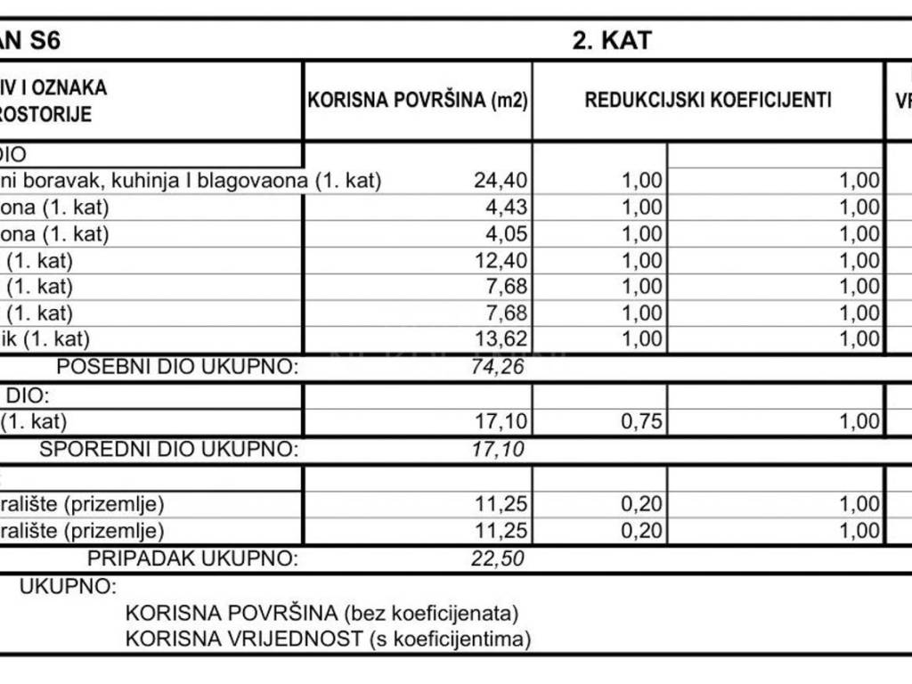 Prodaje se stan S6 na drugom katu moderne novogradnje na atraktivnoj i mirnoj lokaciji u Srimi, svega 300 metara udaljenoj od plaže. Stan se prostire na neto korisnoj površini od 91,59 m², a sastoji se od prostranog hodnika, dnevnog boravka s blagovaonicom, kuhinje, dvije kupaonice i tri udobne spavaće sobe. Poseban ugođaj pruža natkrivena lođa površine 17,10 m². Uz stan dolazi i jedno vanjsko parkirno mjesto površine 11.25 m², a cijeli objekt izgrađen je od visokokvalitetnih materijala, uz korištenje IZO stakla i električnog grijanja, čime je osigurana visoka energetska učinkovitost i udobnost boravka. Ukupna bruto površina stana iznosi 102,61 m², prema projektnim tlocrtima i tablicama površina.