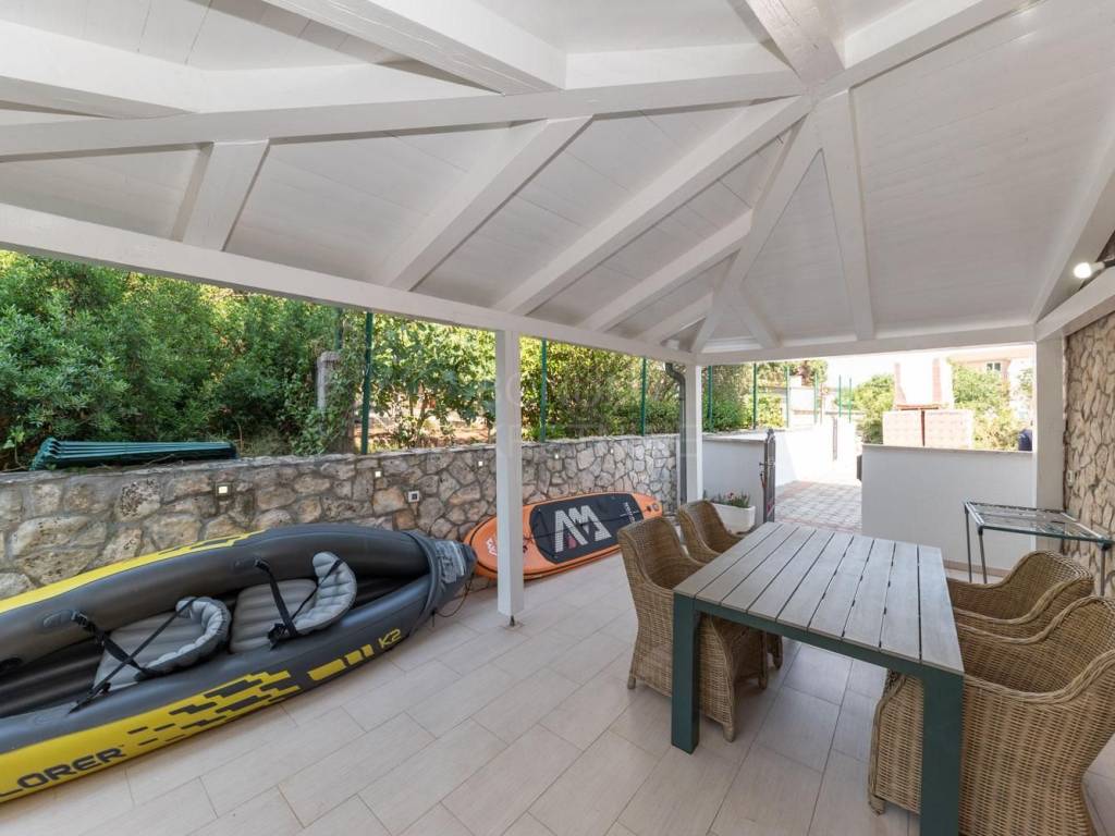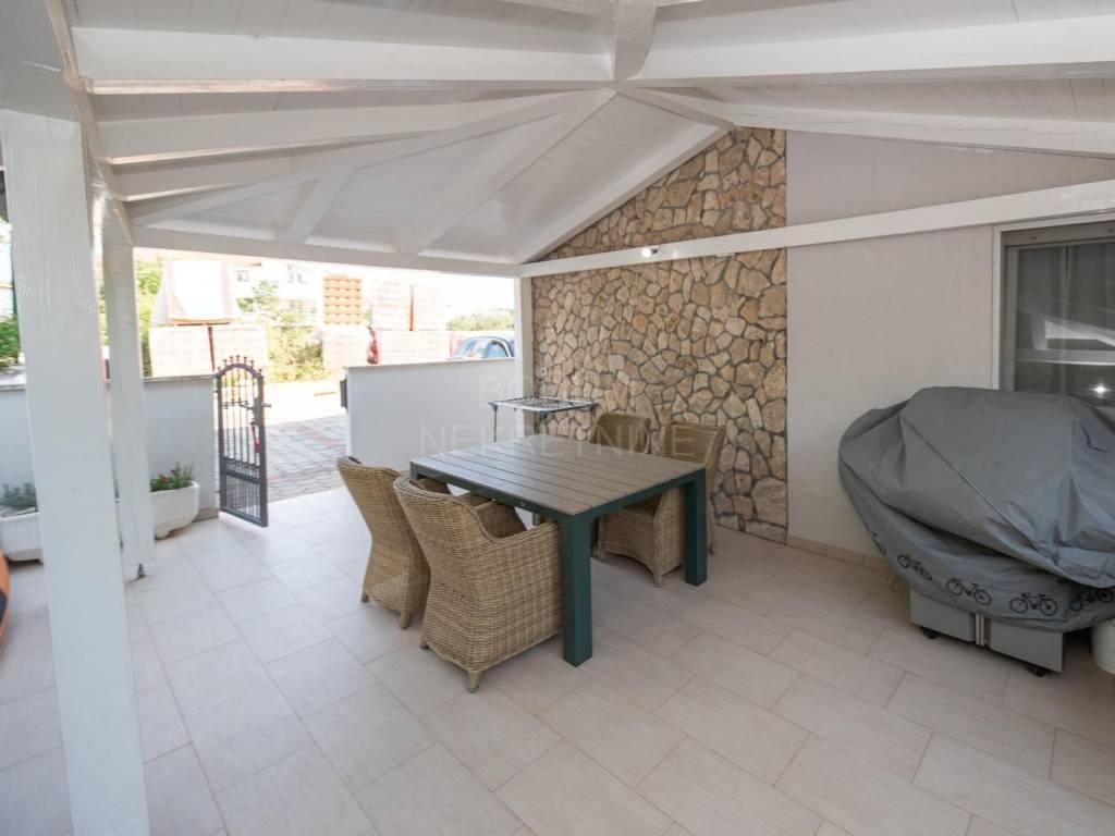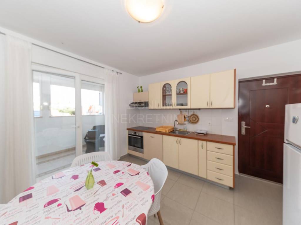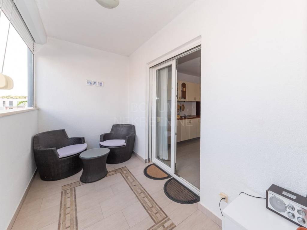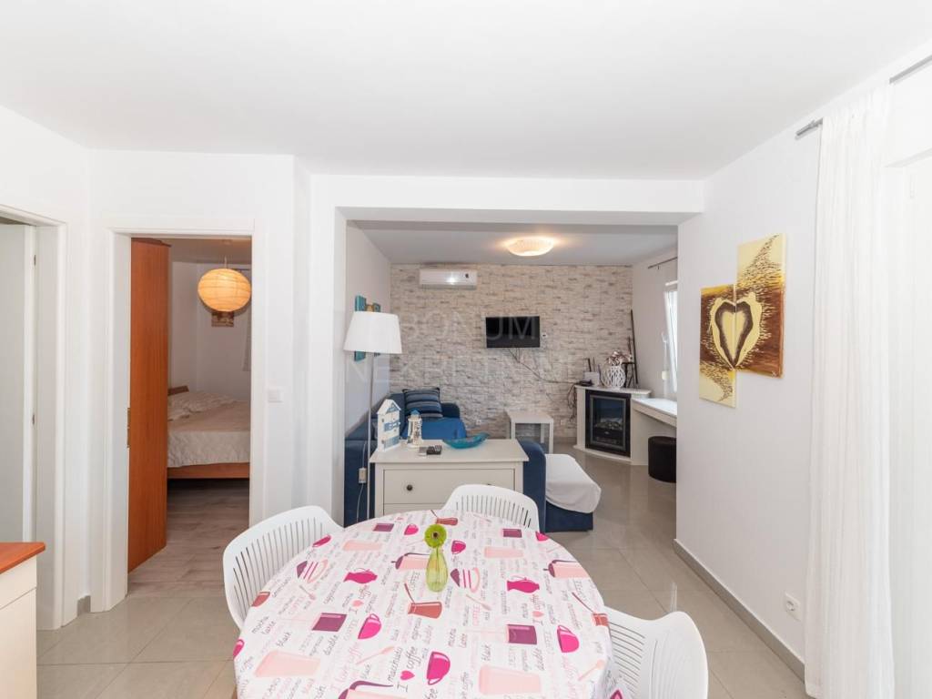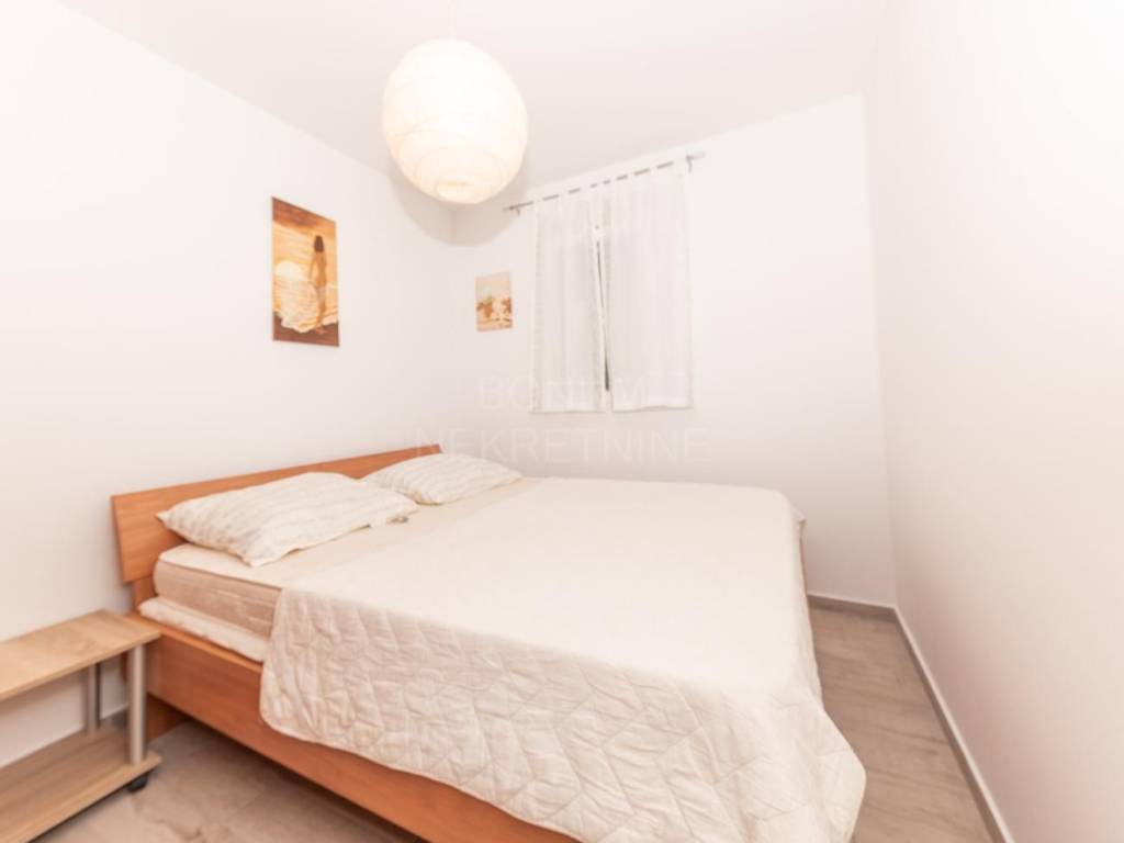 Stan se prodaje potpuno namješten, a sastoji se od jedne spavaće sobe, kupaonice, klimatiziranog dnevnog boravka s kuhinjom i blagovaonicom te izlazom u vlastito ograđeno dvorište površine 30 m². Iz dnevnog boravka izlazi se i na natkrivenu terasu od 10 m², koja se po potrebi može zatvoriti i koristiti kao ostava ili dodatni prostor za boravak tijekom zimskih mjeseci.